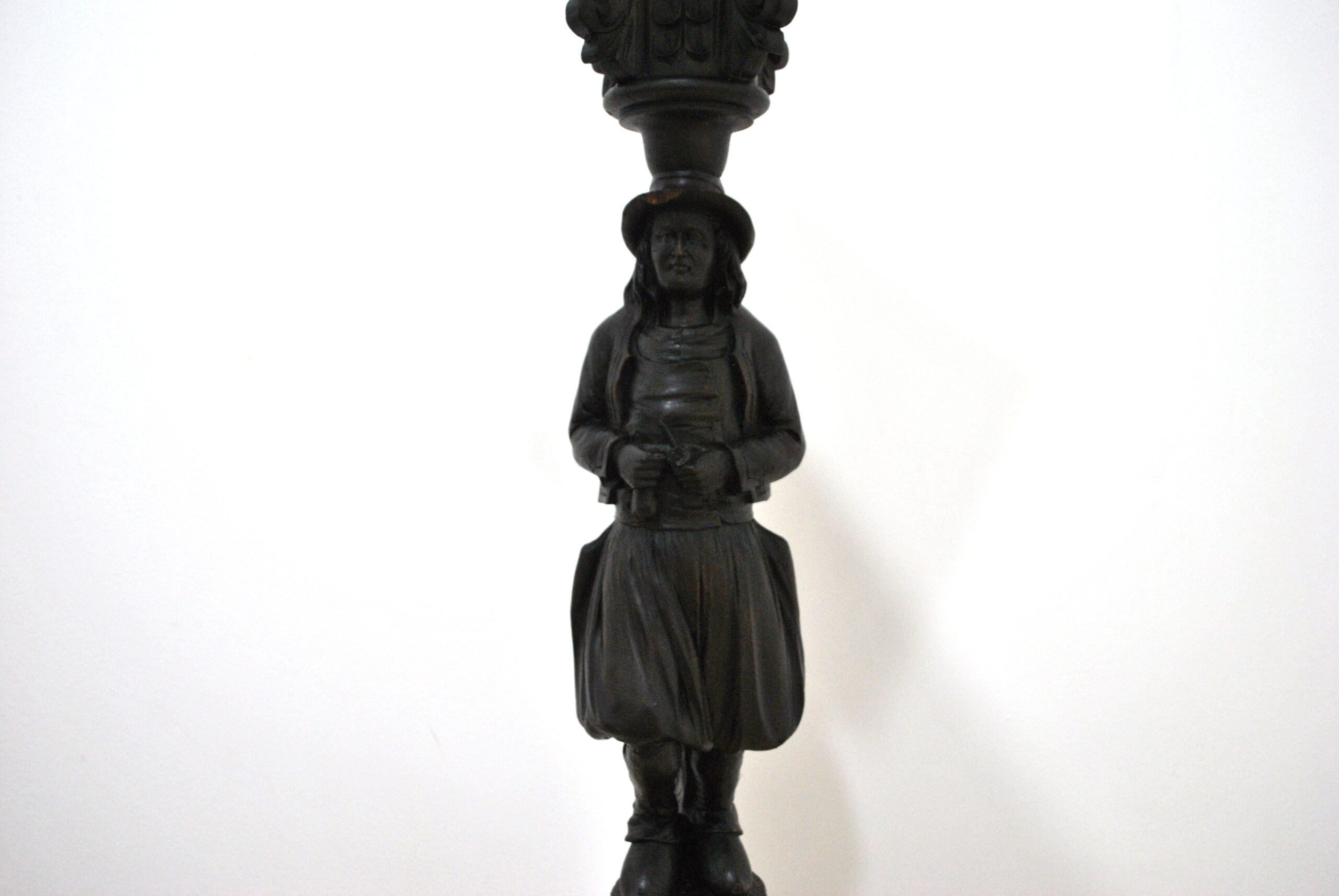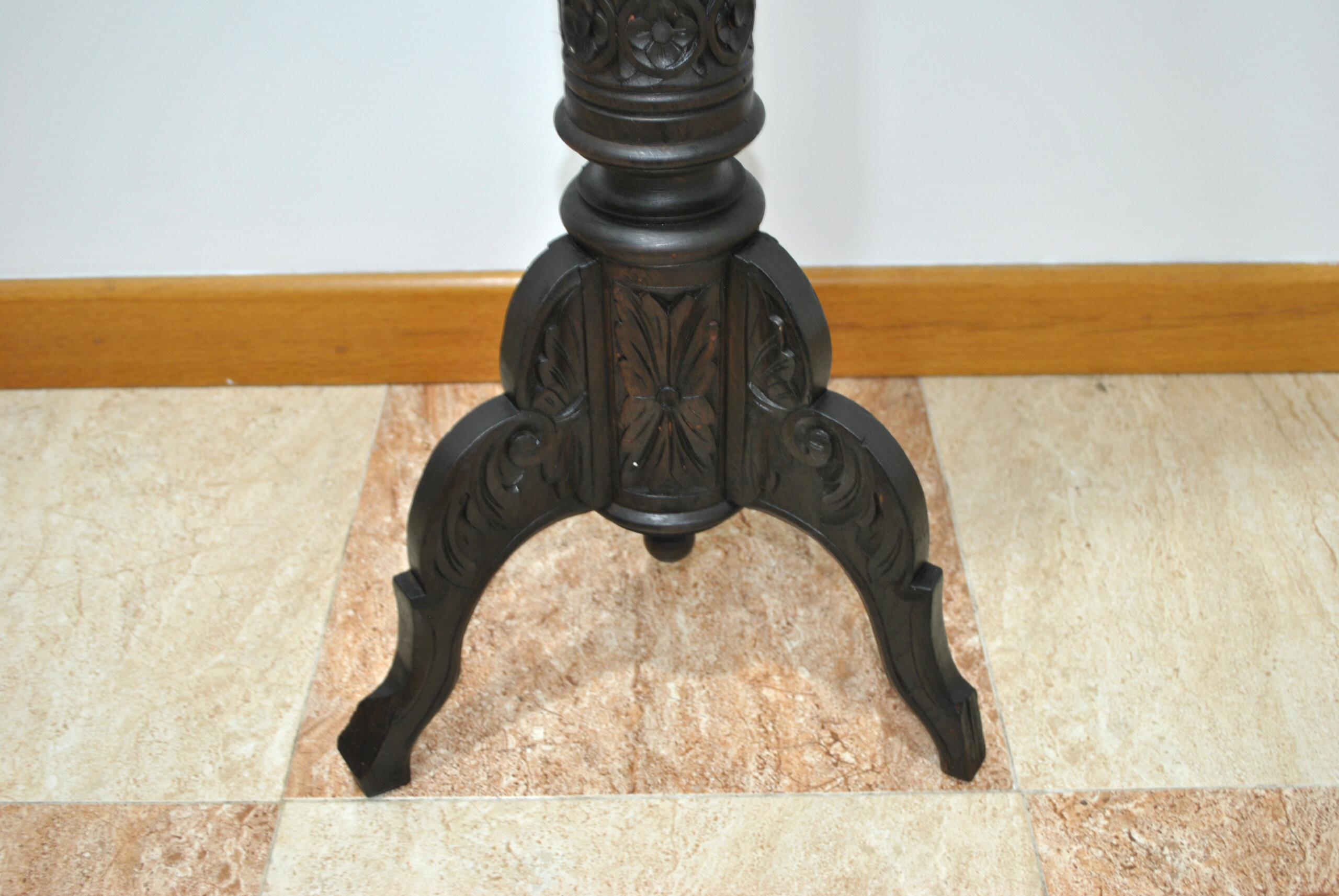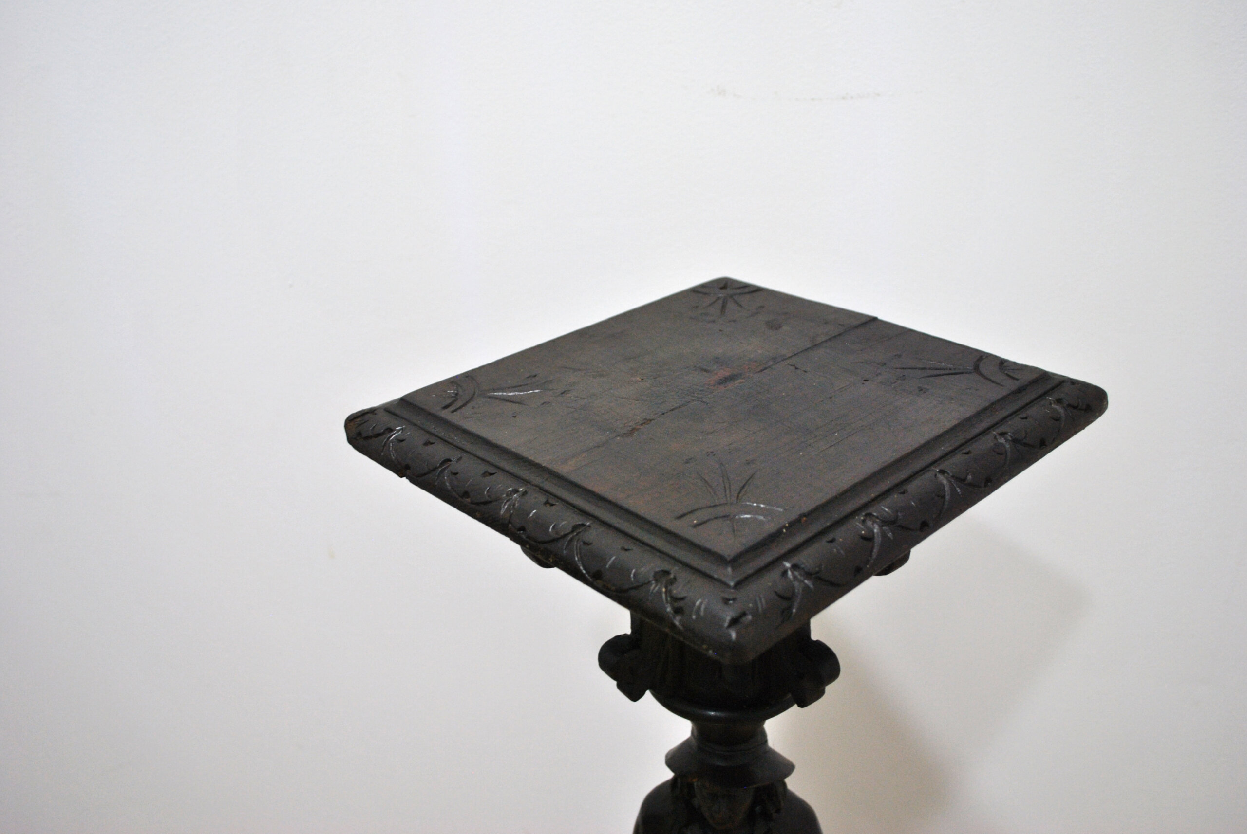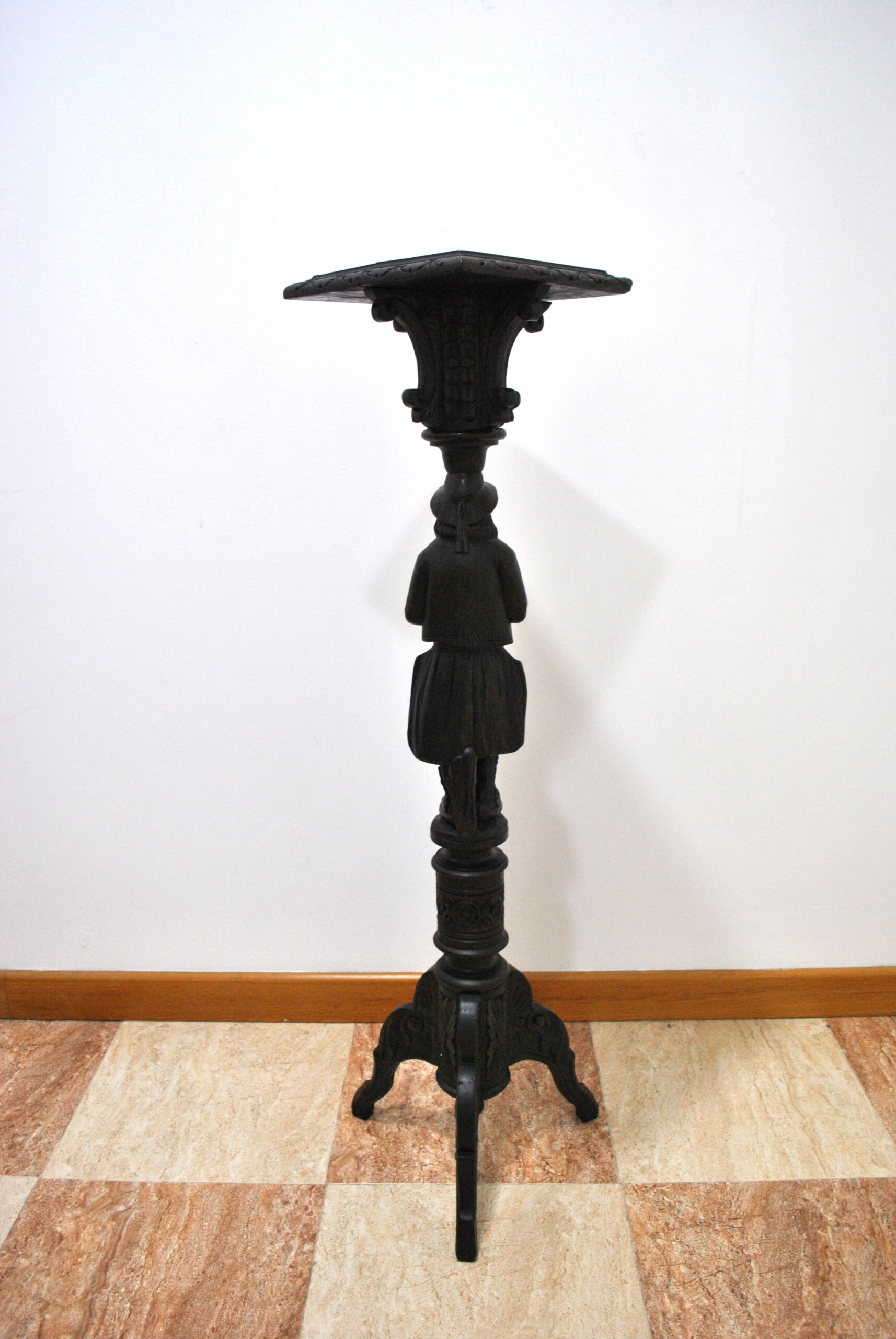 Presenta un precioso acabado oscuro que resalta los detalles del tallado, tanto en la figura como en la base y el capitel superior. La estructura es sólida y estable, con base de tres patas y tablero superior decorado.