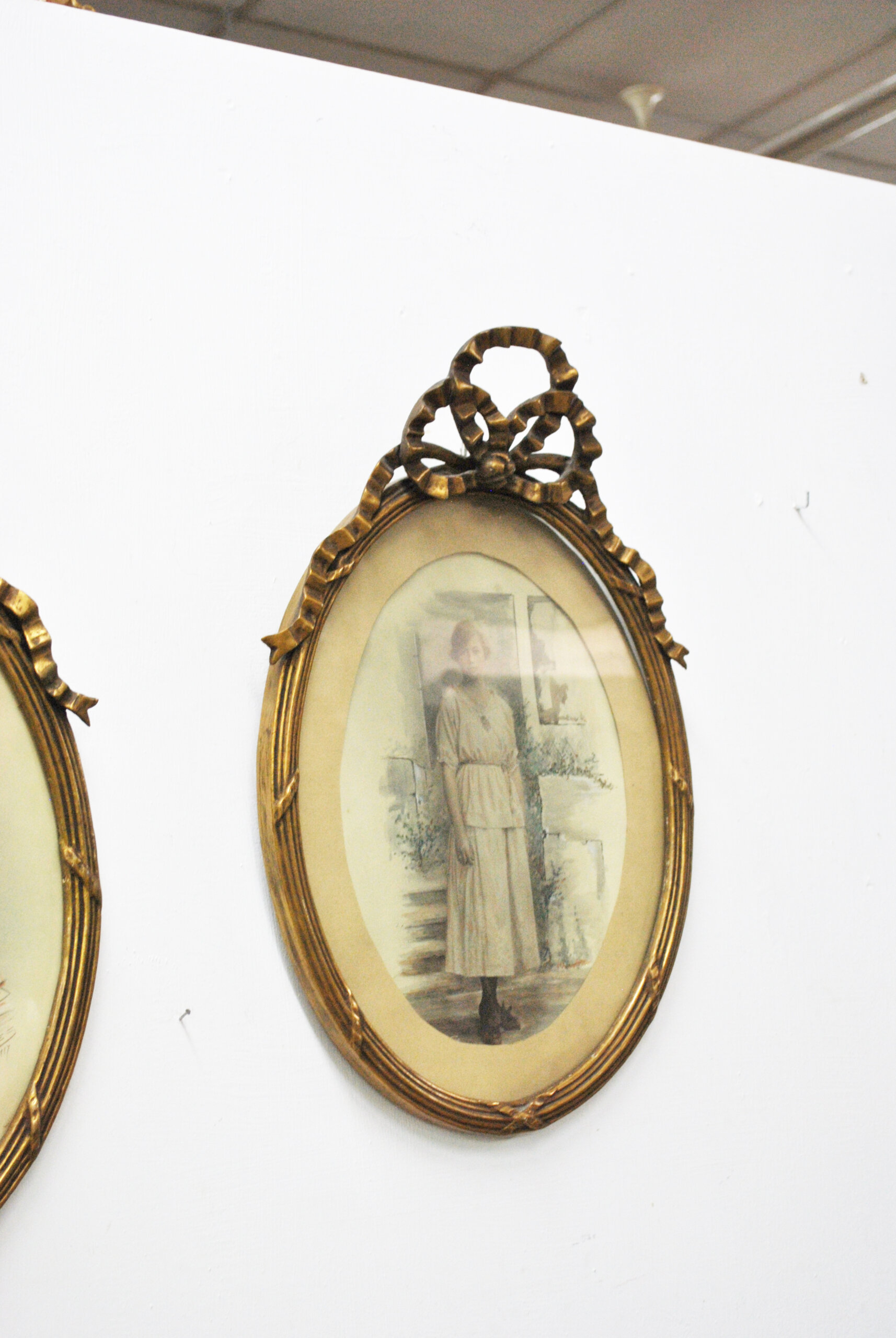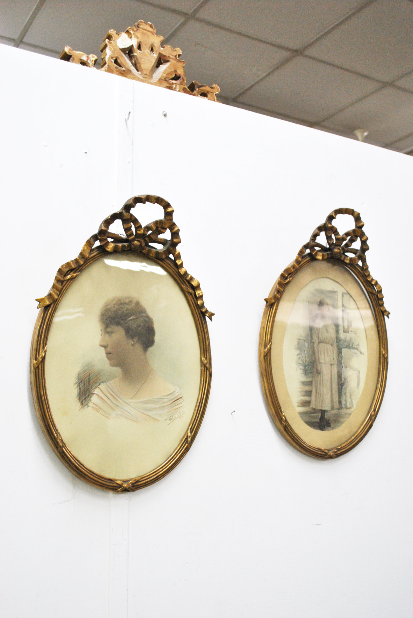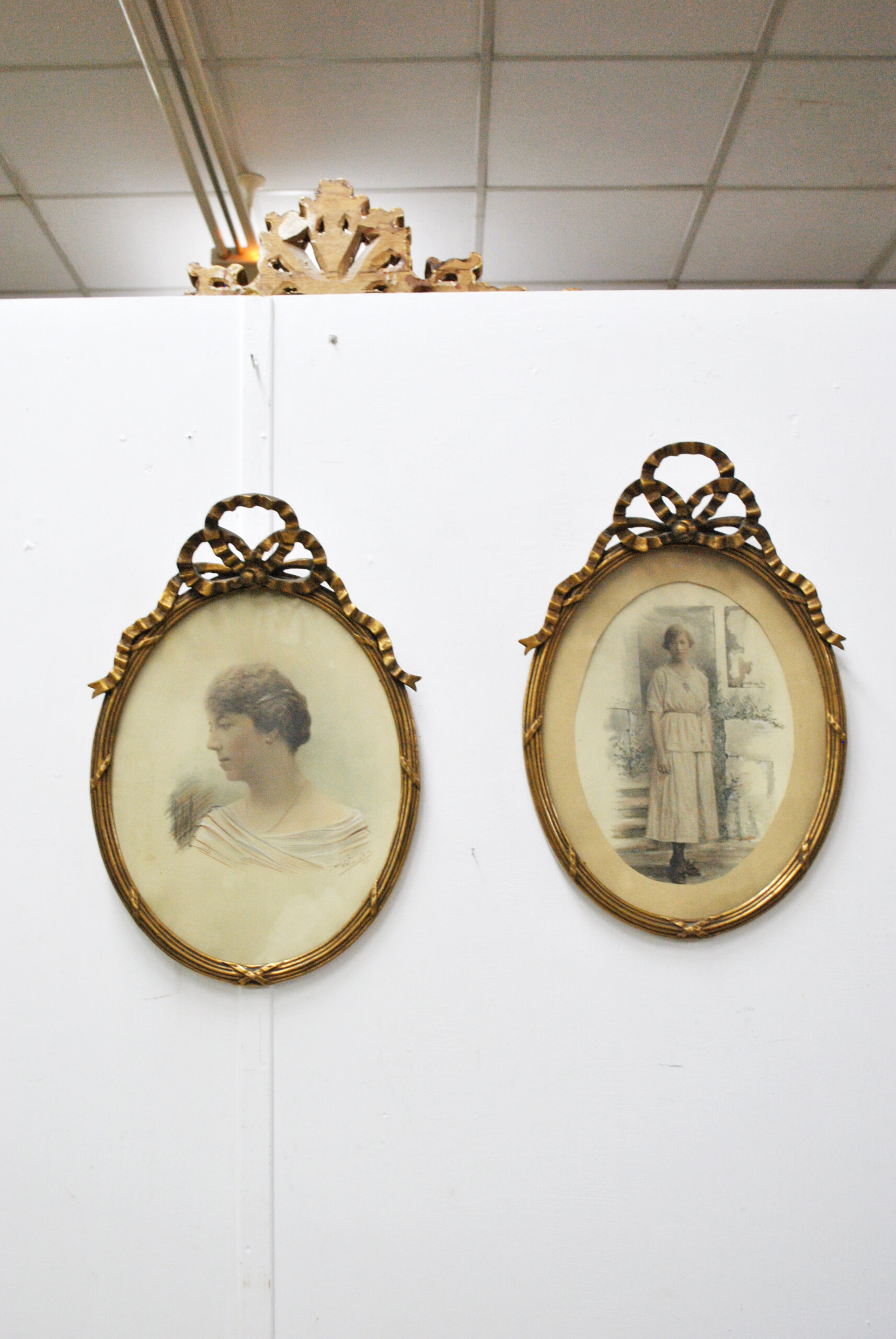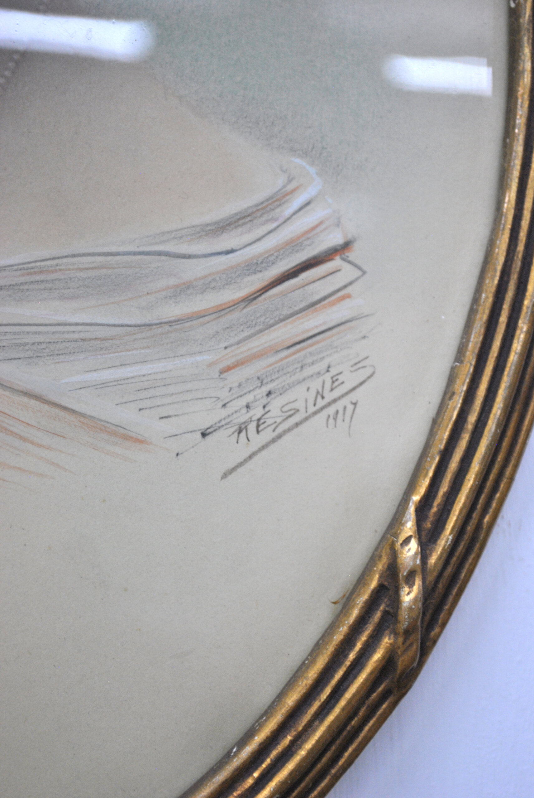 REF: 11904 – Conjunto de dos retratos antiguos fechados en 1917 y firmados por el artista Thésines, ejecutados con técnica mixta sobre papel, combinando dibujo a lápiz y acuarela en delicados tonos sepia y pastel. Ambos retratos representan figuras femeninas de época, con elegancia y serenidad, capturando la estética refinada y romántica de principios del siglo XX. Cada obra se presenta en su marco ovalado original dorado, de estilo Luis XVI, decorado con un lazo superior tallado en relieve, característico de la ornamentación neoclásica francesa. Los marcos conservan su pátina antigua, que realza su autenticidad y encanto decorativo.