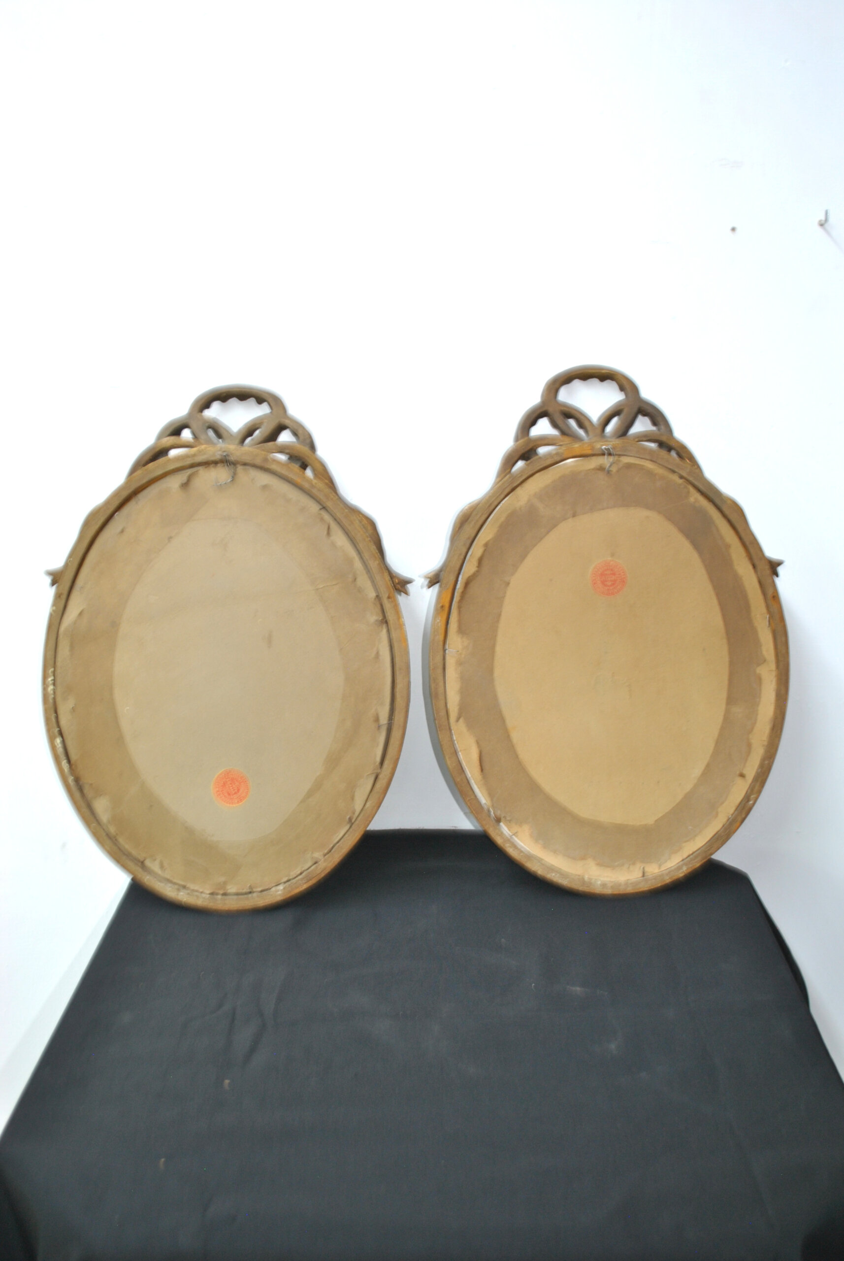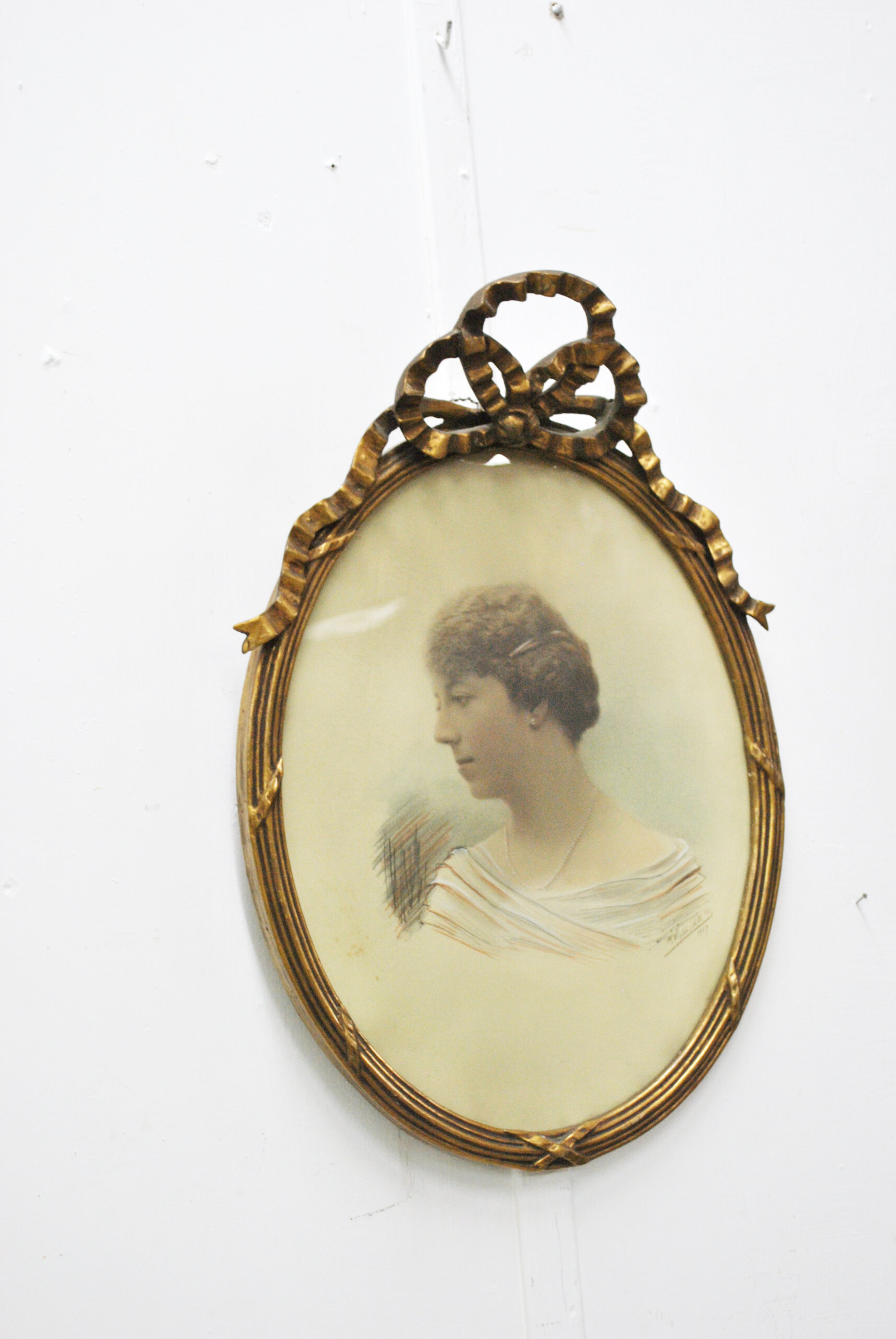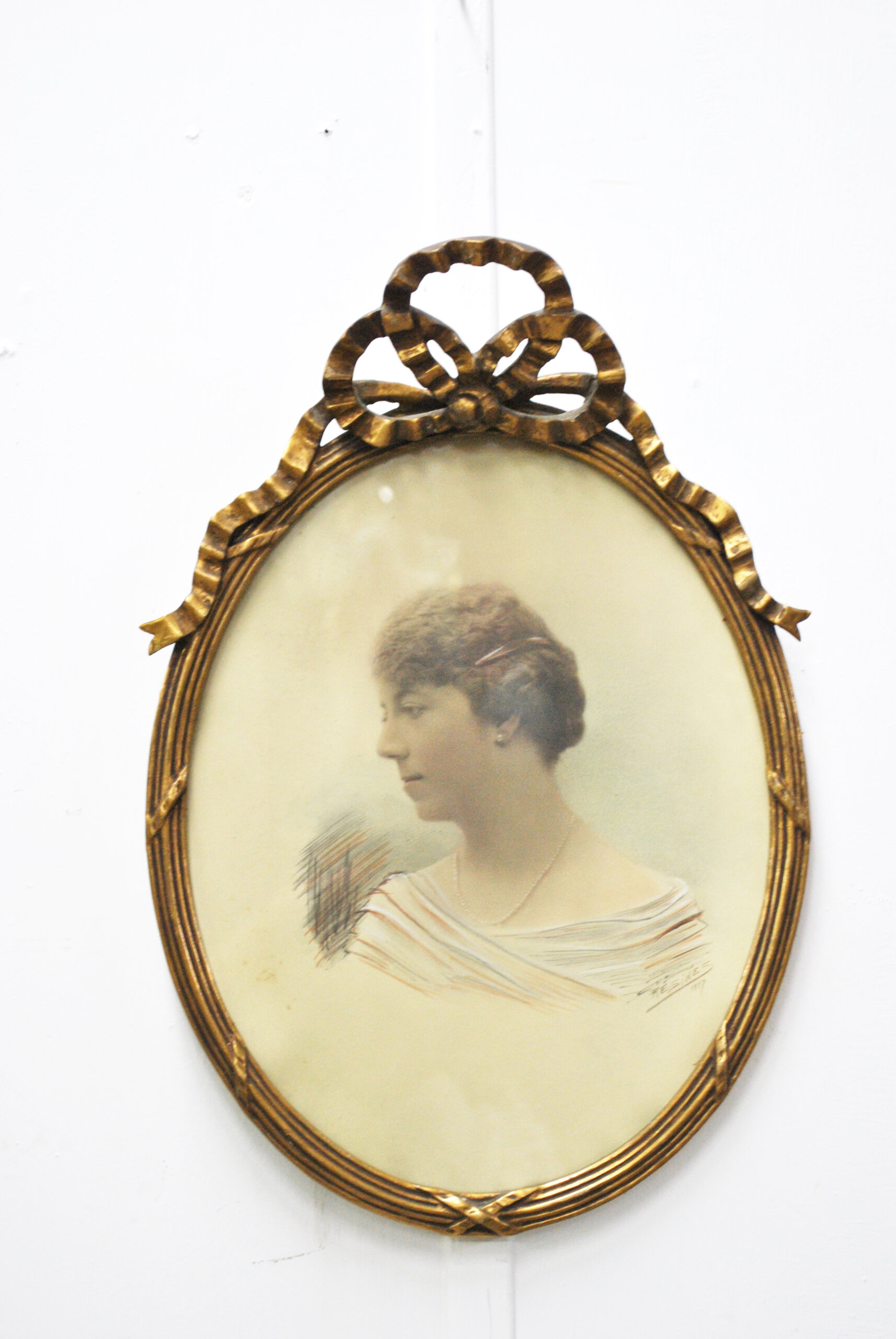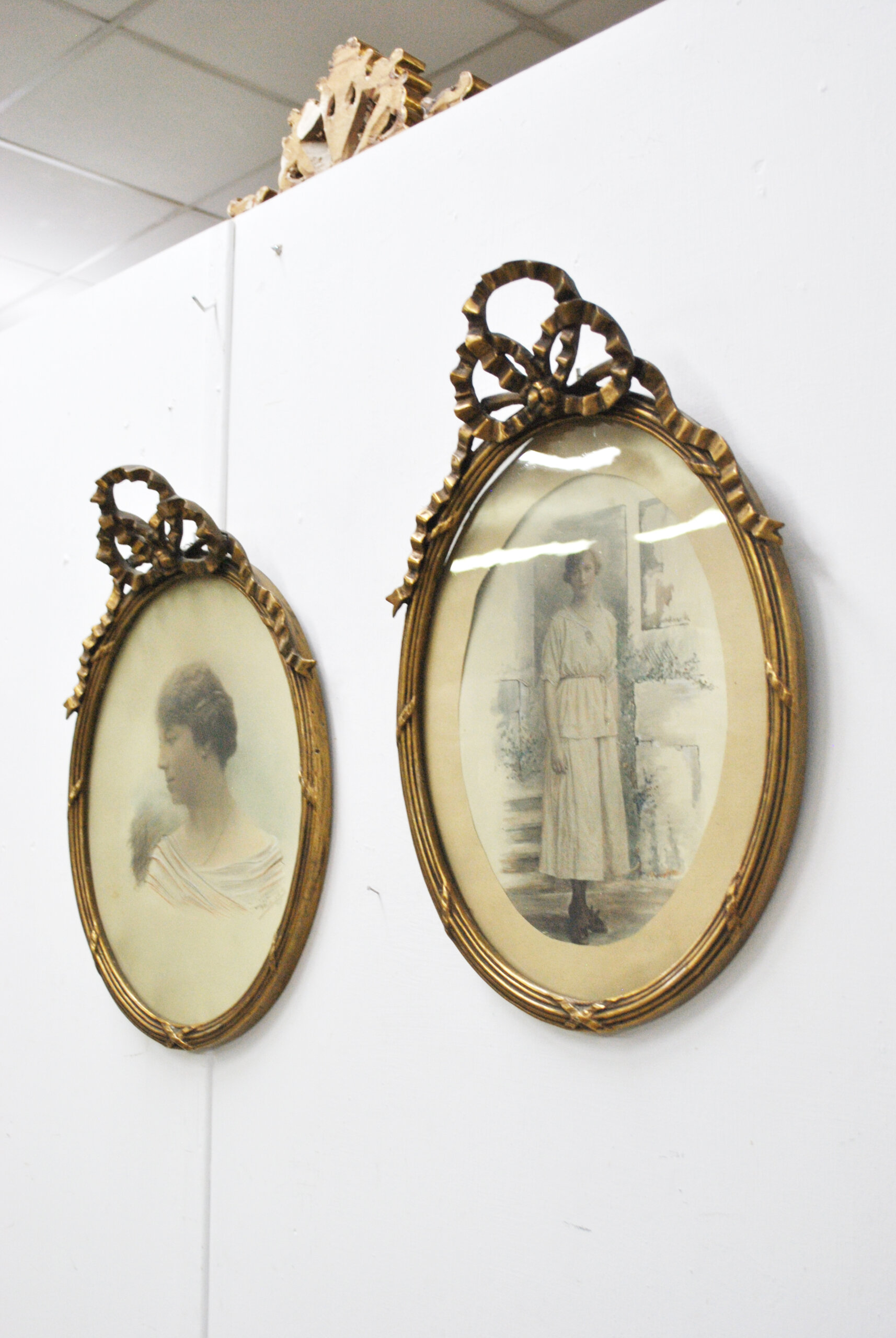 REF: 11904 – Conjunto de dos retratos antiguos fechados en 1917 y firmados por el artista Thésines, ejecutados con técnica mixta sobre papel, combinando dibujo a lápiz y acuarela en delicados tonos sepia y pastel. Ambos retratos representan figuras femeninas de época, con elegancia y serenidad, capturando la estética refinada y romántica de principios del siglo XX. Cada obra se presenta en su marco ovalado original dorado, de estilo Luis XVI, decorado con un lazo superior tallado en relieve, característico de la ornamentación neoclásica francesa. Los marcos conservan su pátina antigua, que realza su autenticidad y encanto decorativo.
