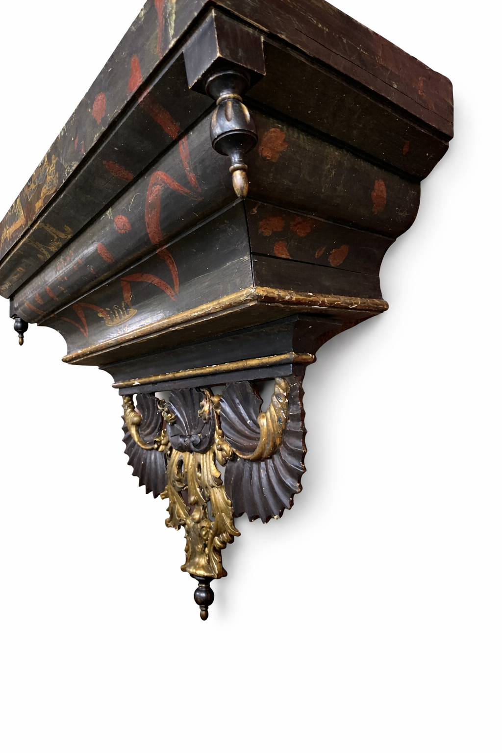 REF: PA-370 : Original ménsula de pared antigua, realizada en madera con una atractiva policromía en tonos oscuros, decorada con detalles en rojo y delicados motivos dorados. Destaca por su estructura robusta y su cuidada ornamentación, especialmente en la parte inferior, donde presenta una elaborada talla con formas vegetales y volutas doradas que aportan gran riqueza visual.