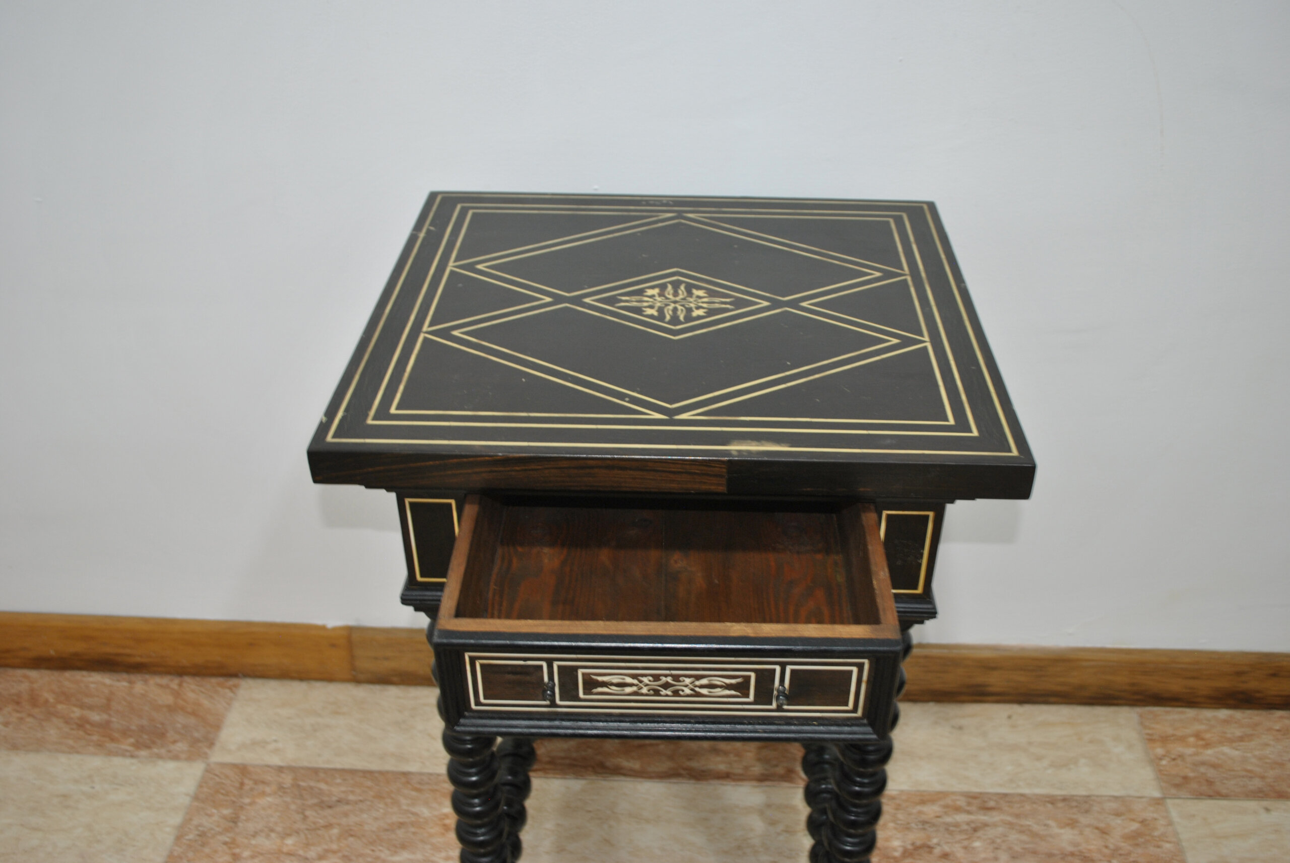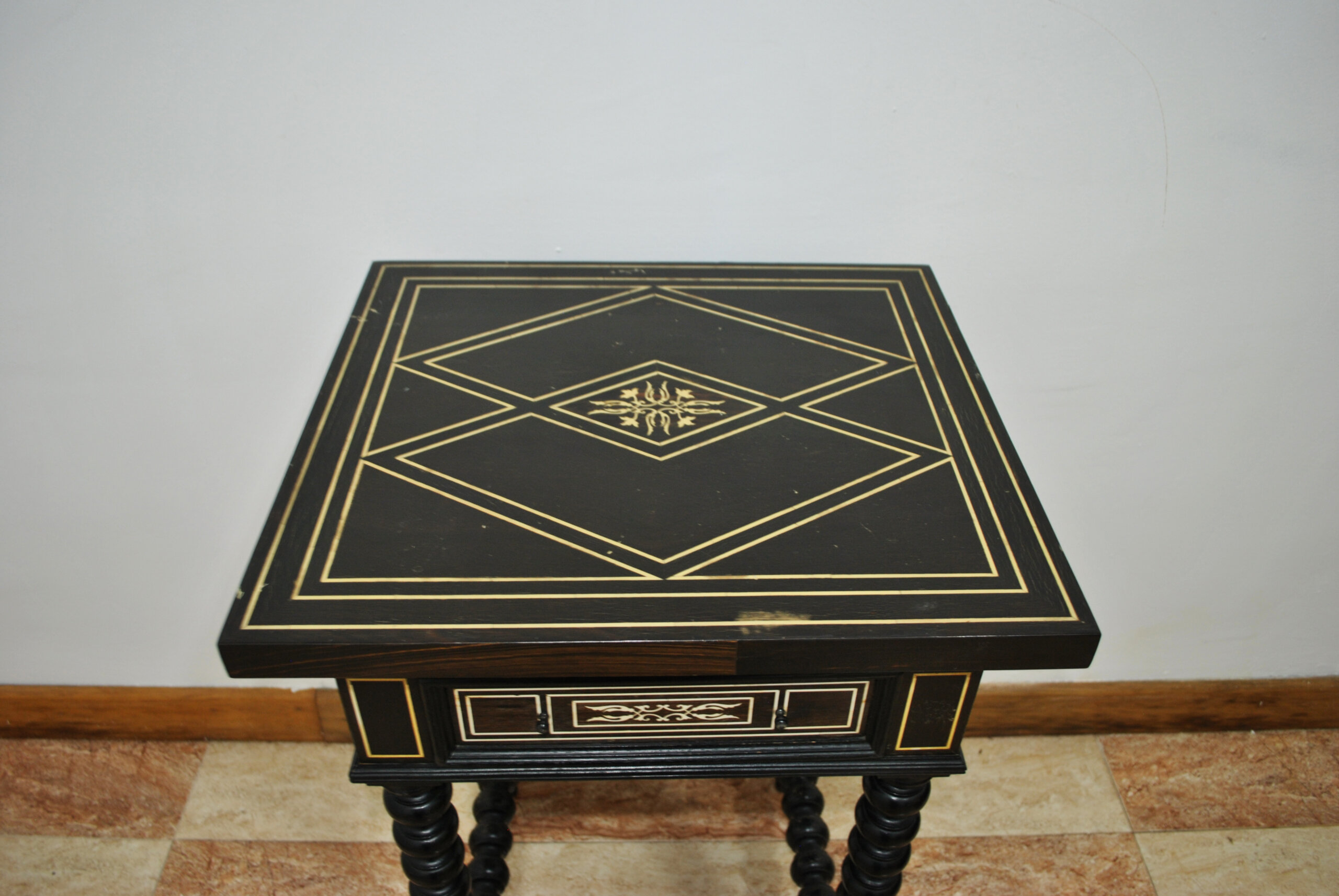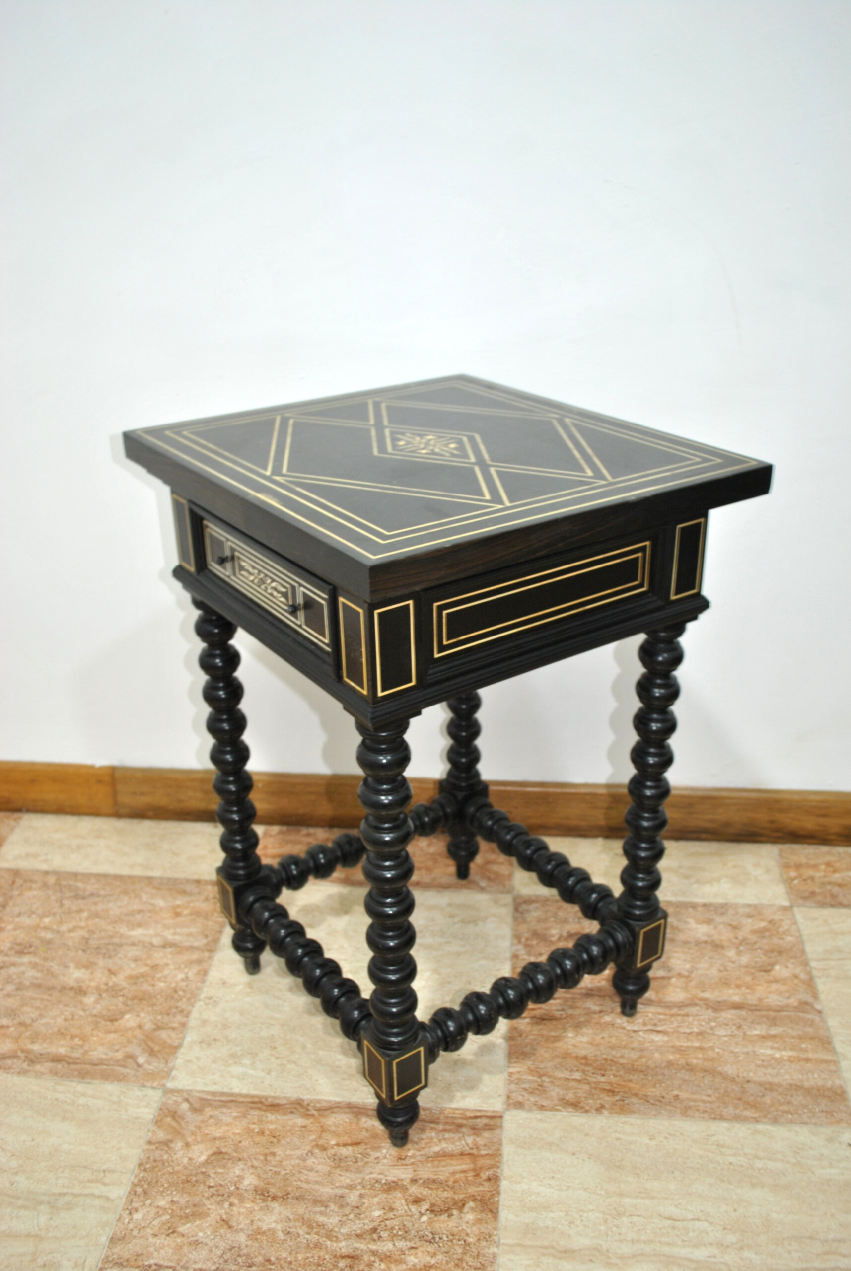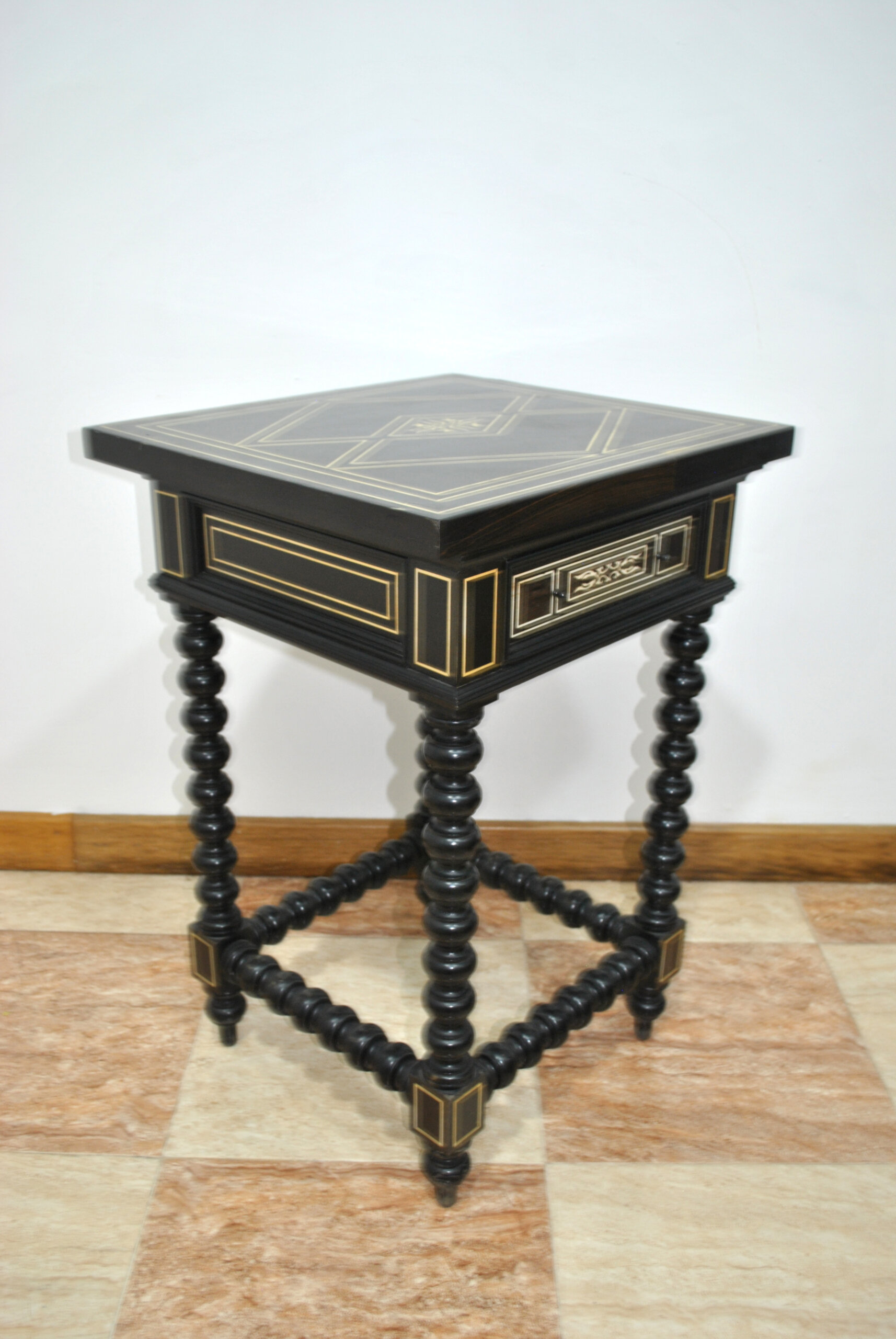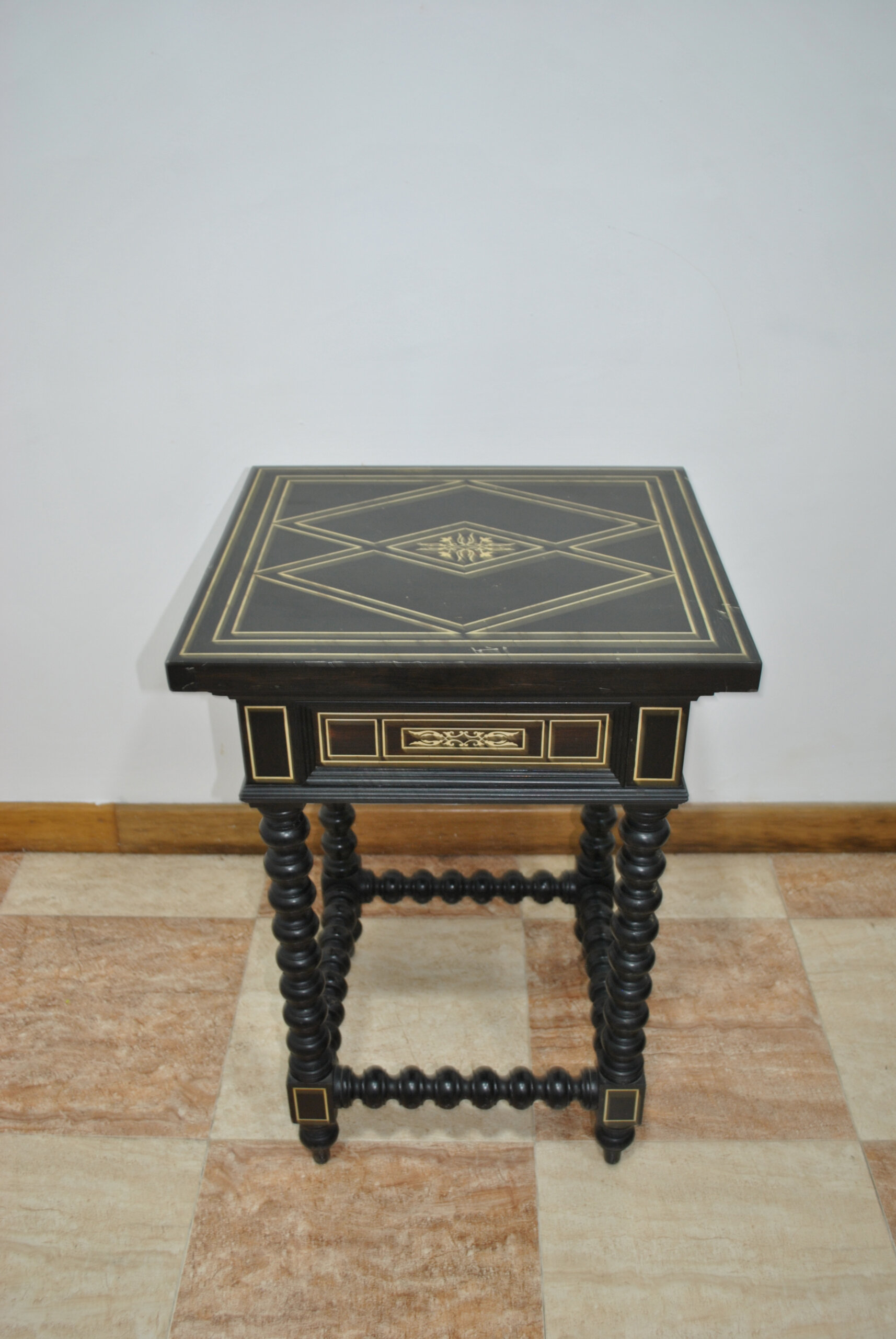 REF: 12421 – Elegante mesa auxiliar de estilo Napoleón III, una pieza sofisticada que combina el contraste del acabado ebonizado con delicados detalles en marquetería clara, creando un conjunto de gran presencia y refinamiento.