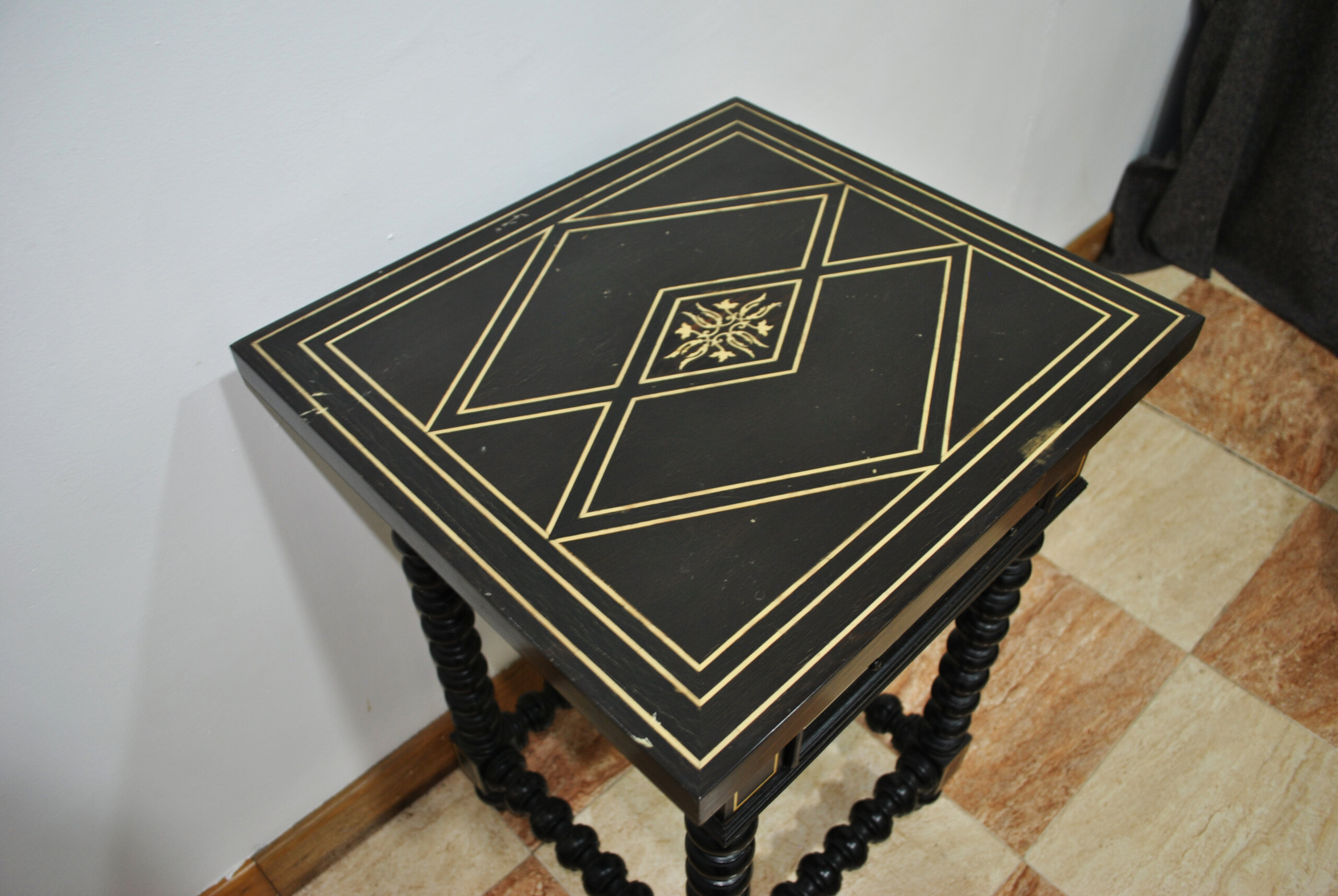 El tablero superior presenta una decoración geométrica en líneas doradas sobre fondo negro, con un motivo central ornamental que aporta equilibrio y elegancia. Dispone de un cajón frontal integrado, decorado con fileteado en latón y un motivo central trabajado, ideal para pequeño almacenaje. La estructura se apoya sobre patas torneadas tipo salomónicas unidas por travesaños, que refuerzan su estabilidad y aportan carácter clásico.