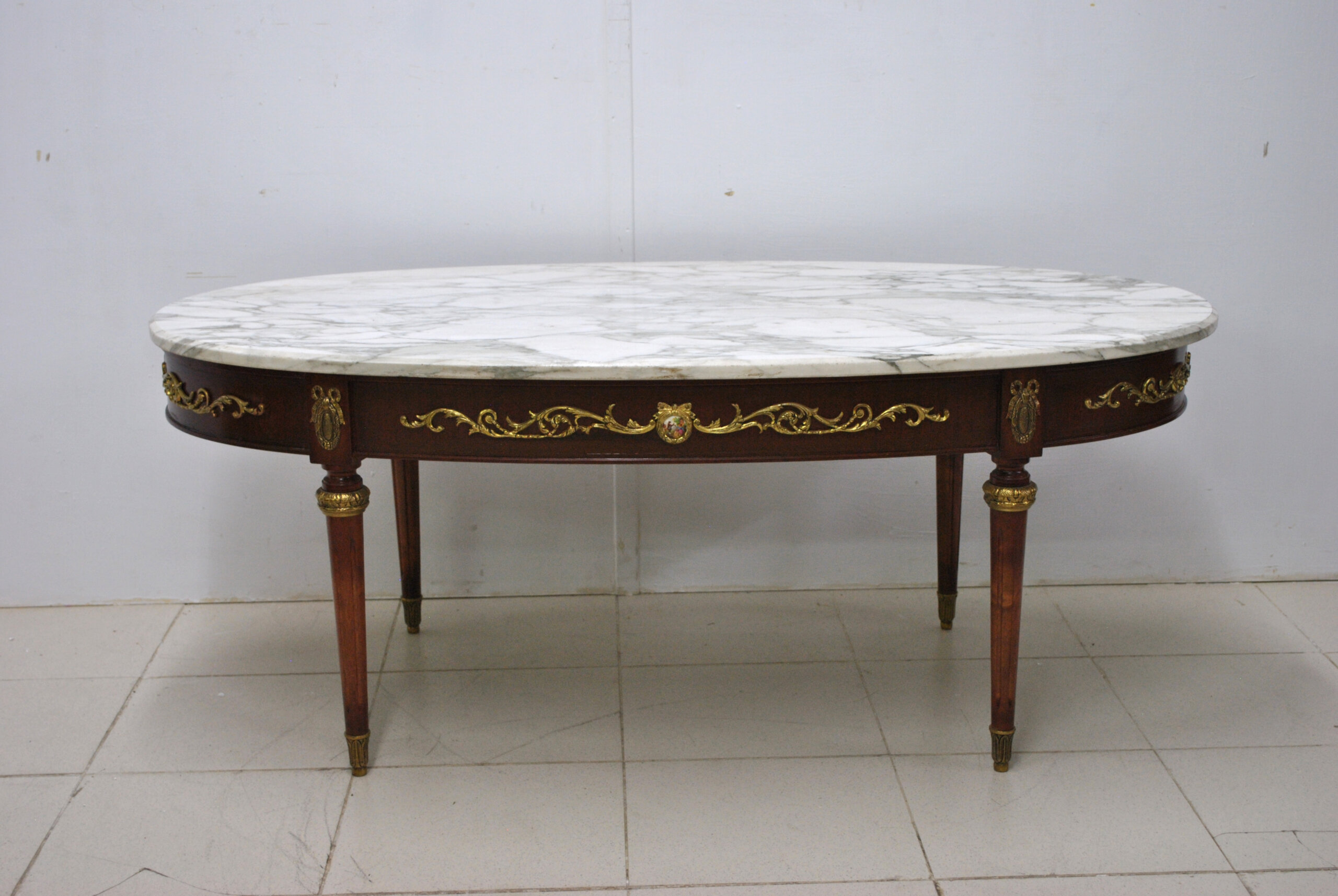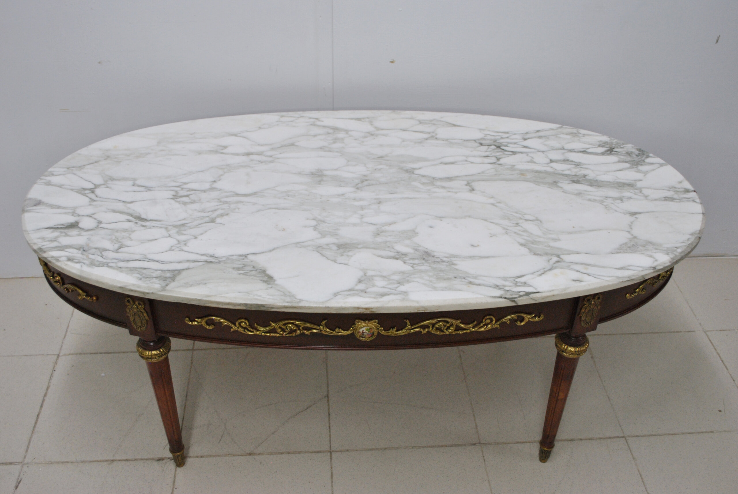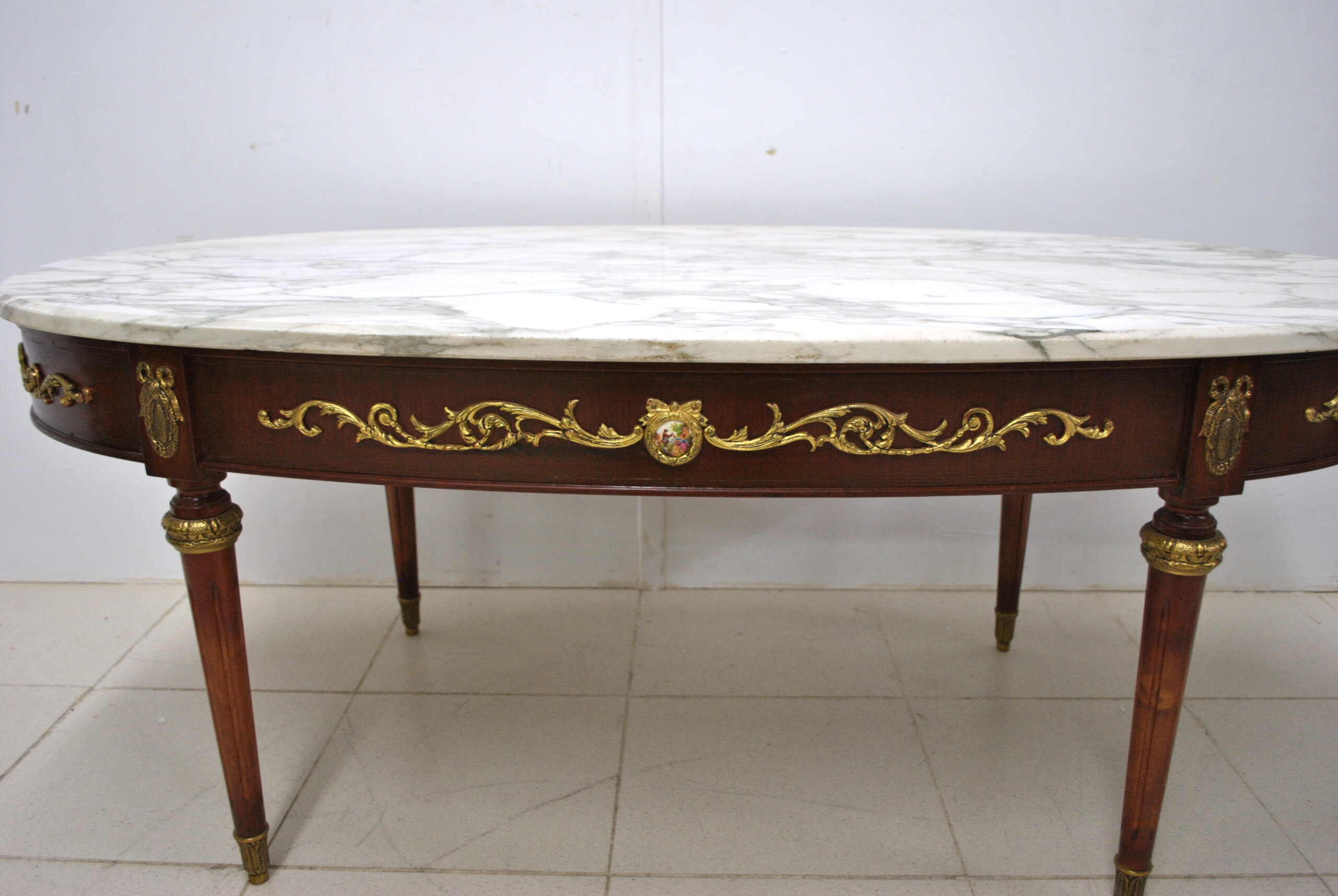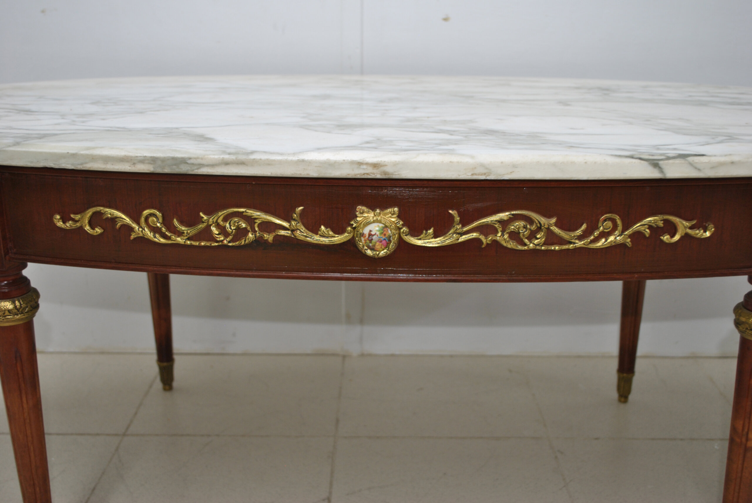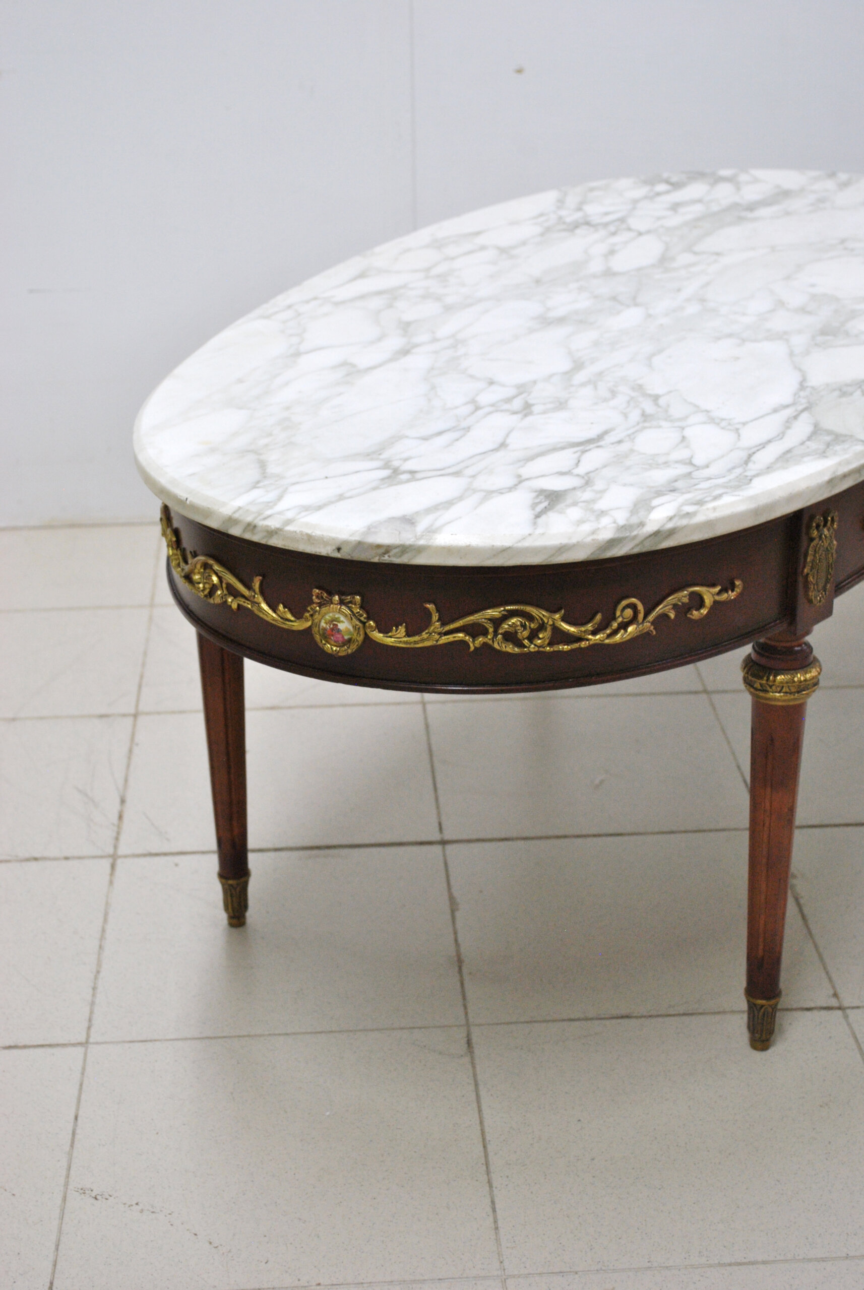 La tapa ovalada de mármol blanco veteado, de gran espesor y calidad, aporta una sensación de frescura y distinción. La base de madera presenta apliques de bronce cincelado en forma de guirnaldas, medallones y mascarones de porcelana esmaltada con escenas románticas, que decoran todo el perímetro del faldón. Las patas son estriadas y rematadas con aplicaciones de bronce en la parte superior e inferior.