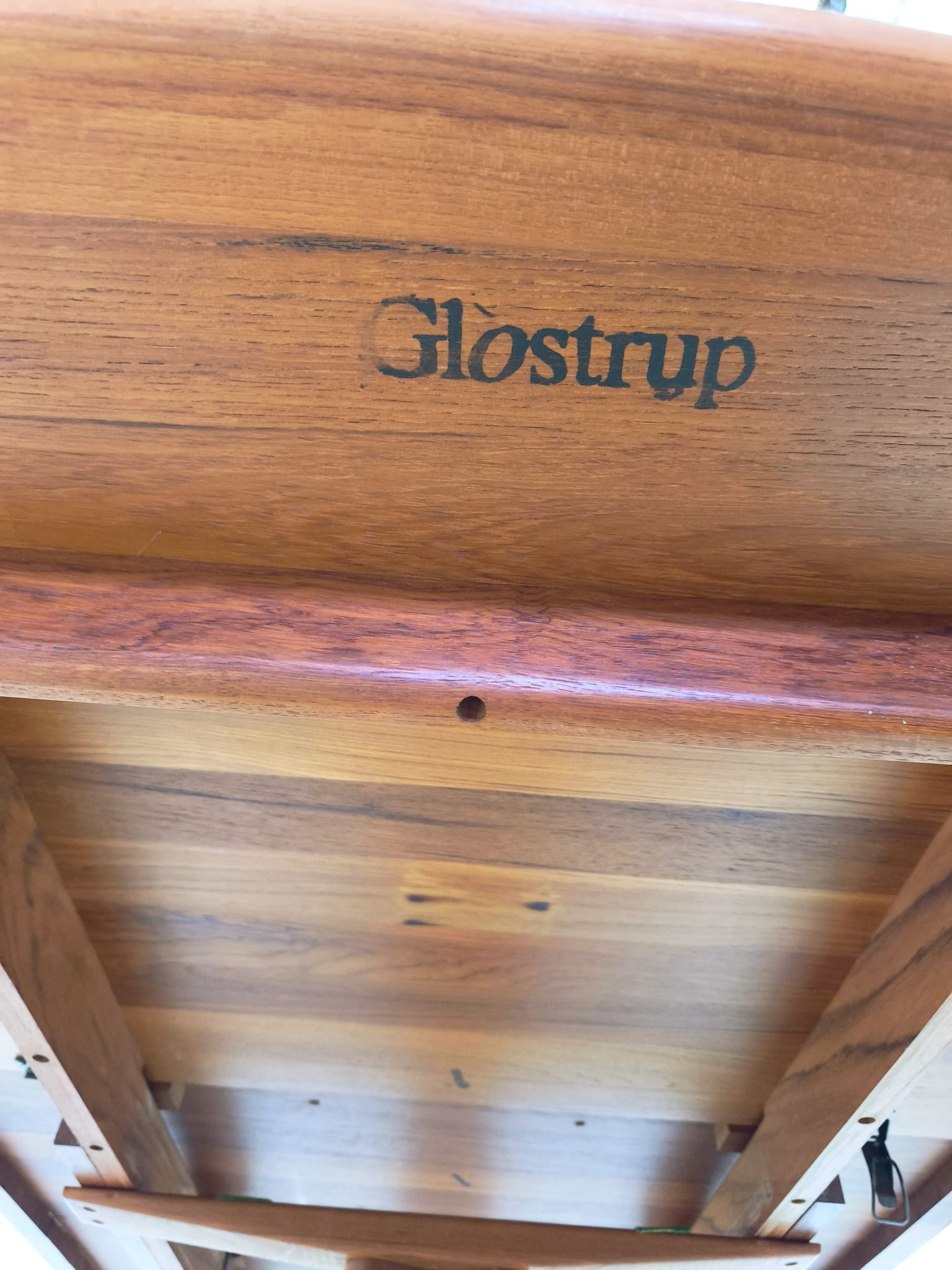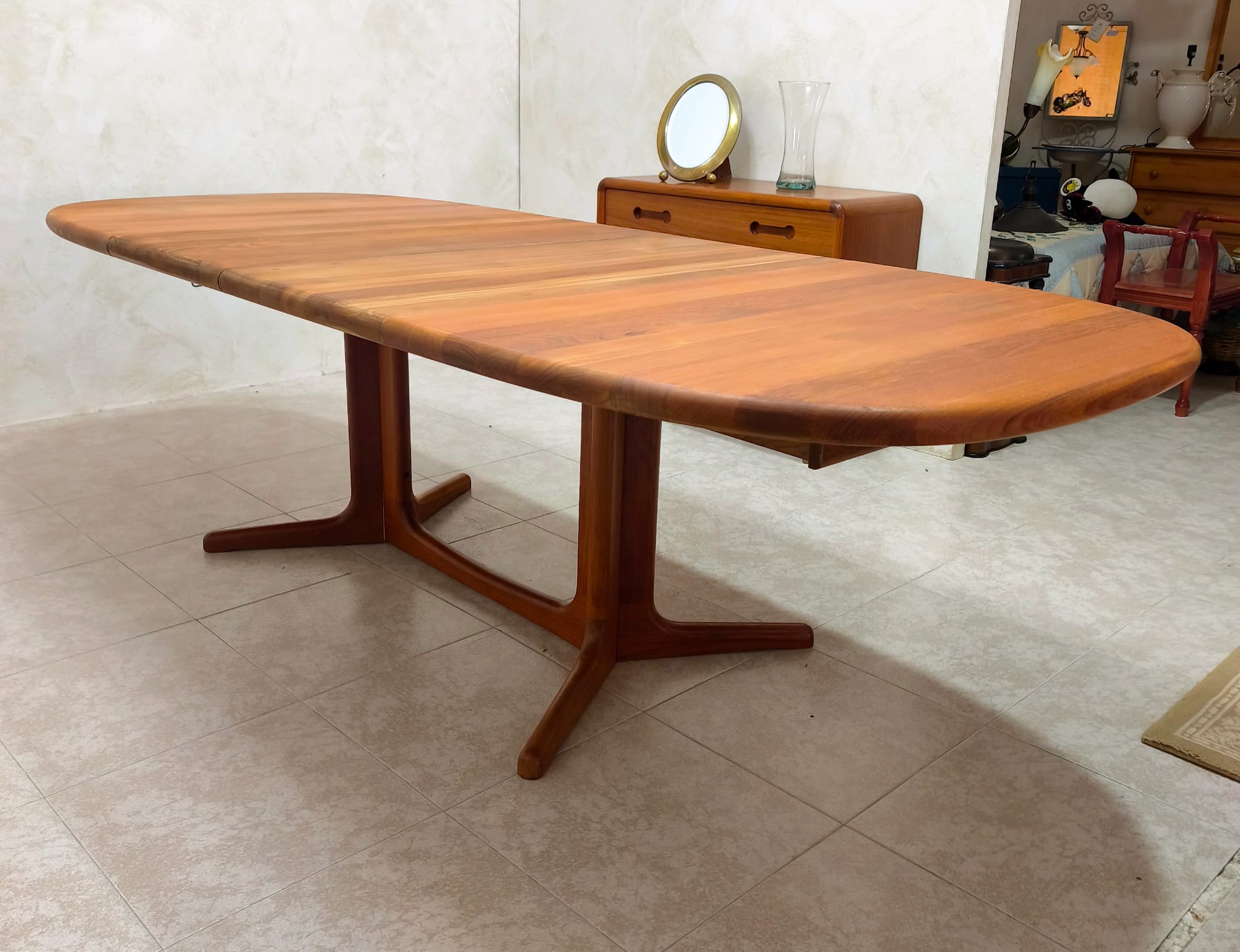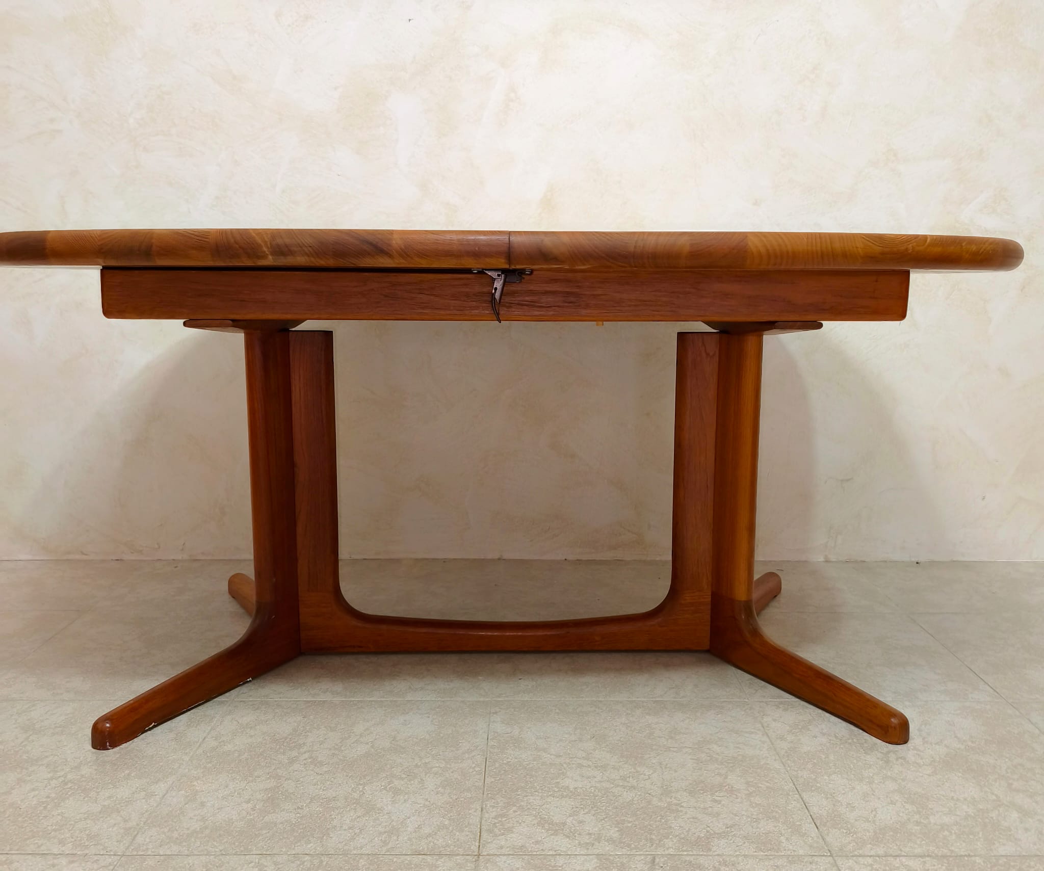 REF: AJ887 – Mesa de comedor extensible ovalada danesa Glostrup de madera maciza de teca de los años 60 de la marca danesa Glostrup con patas en marco de trineo.