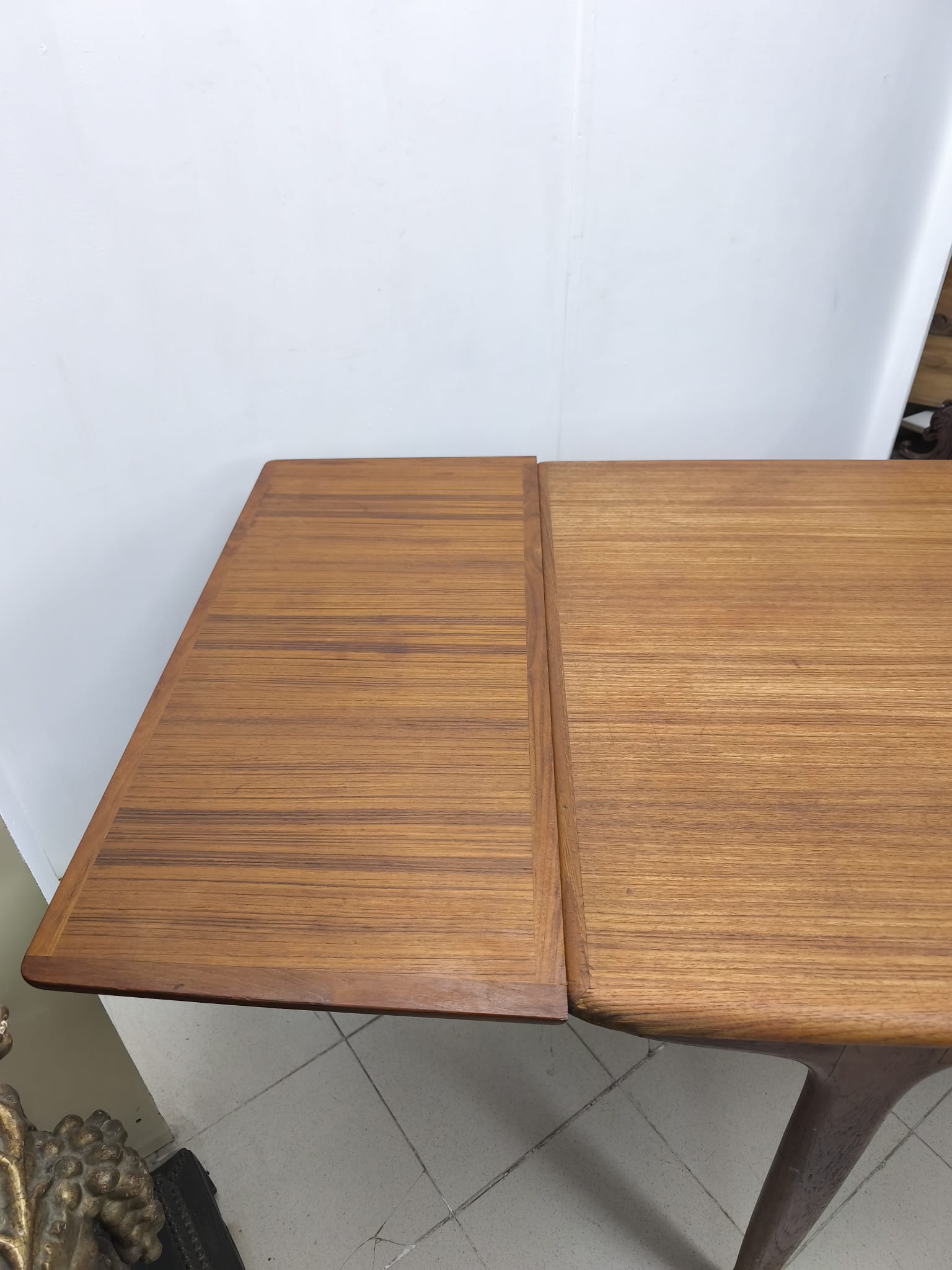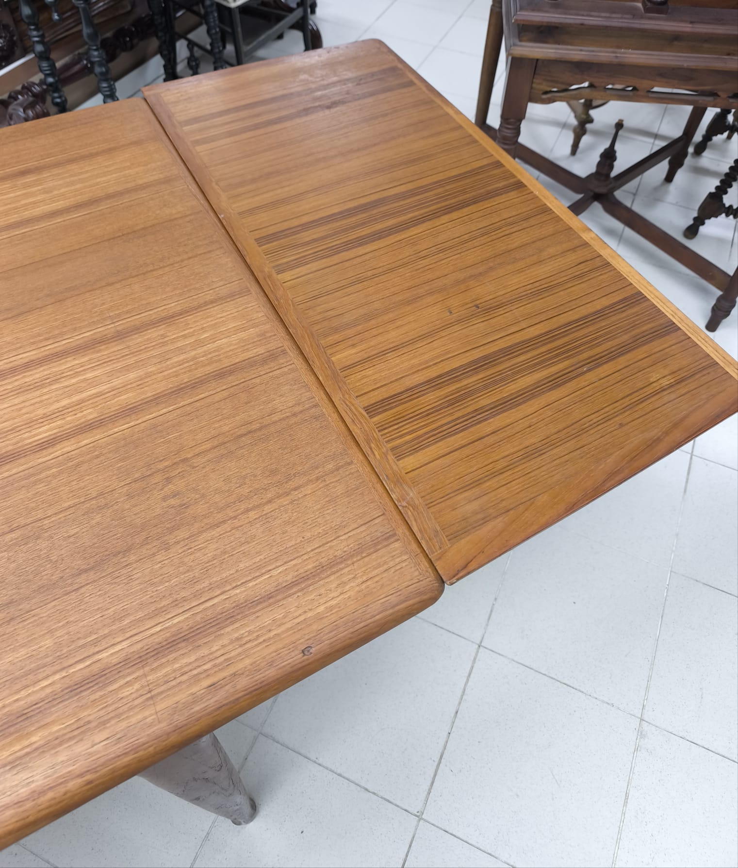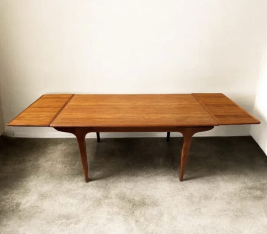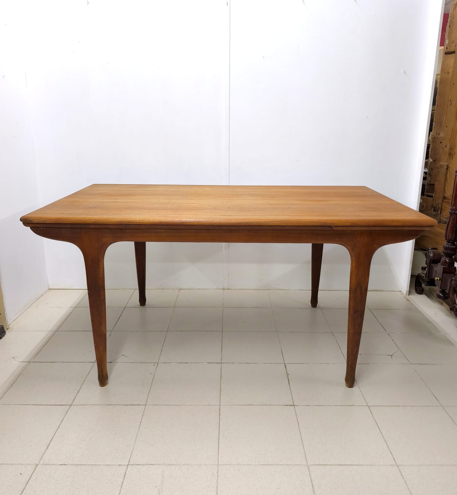 REF: AJ7359 – Mesa de comedor Mid Century fabricada por TV Meubles Paris en Francia hacia 1960. Esta mesa extensible está hecha de madera de teca de alta calidad en un cálido color marrón. Está acabada con un impresionante ojo para los detalles, con bordes suaves y un precioso acabado curvado. La mesa rebosa calidad La mesa tiene dos hojas extensibles de 40 cm, lo que permite ampliar su anchura de 160 a 200 y a 240 cm Esto la hace versátil para muchas situaciones y decoraciones diferentes. Etiquetada y sellada debajo del tablero como se muestra en las fotos.