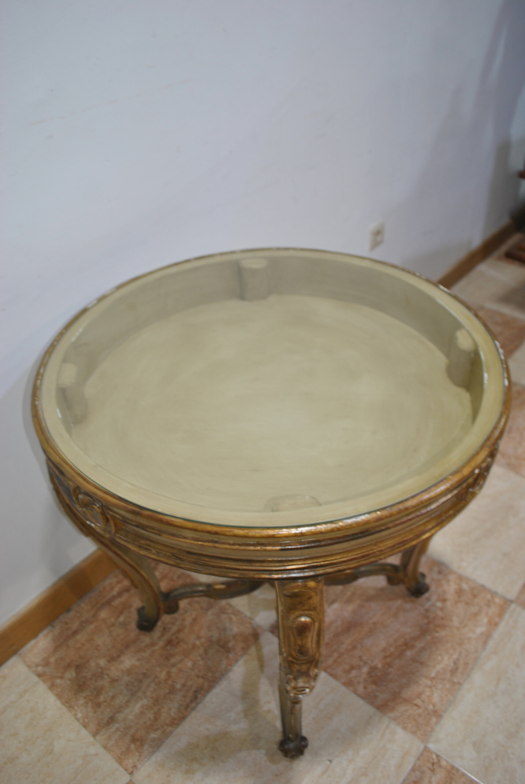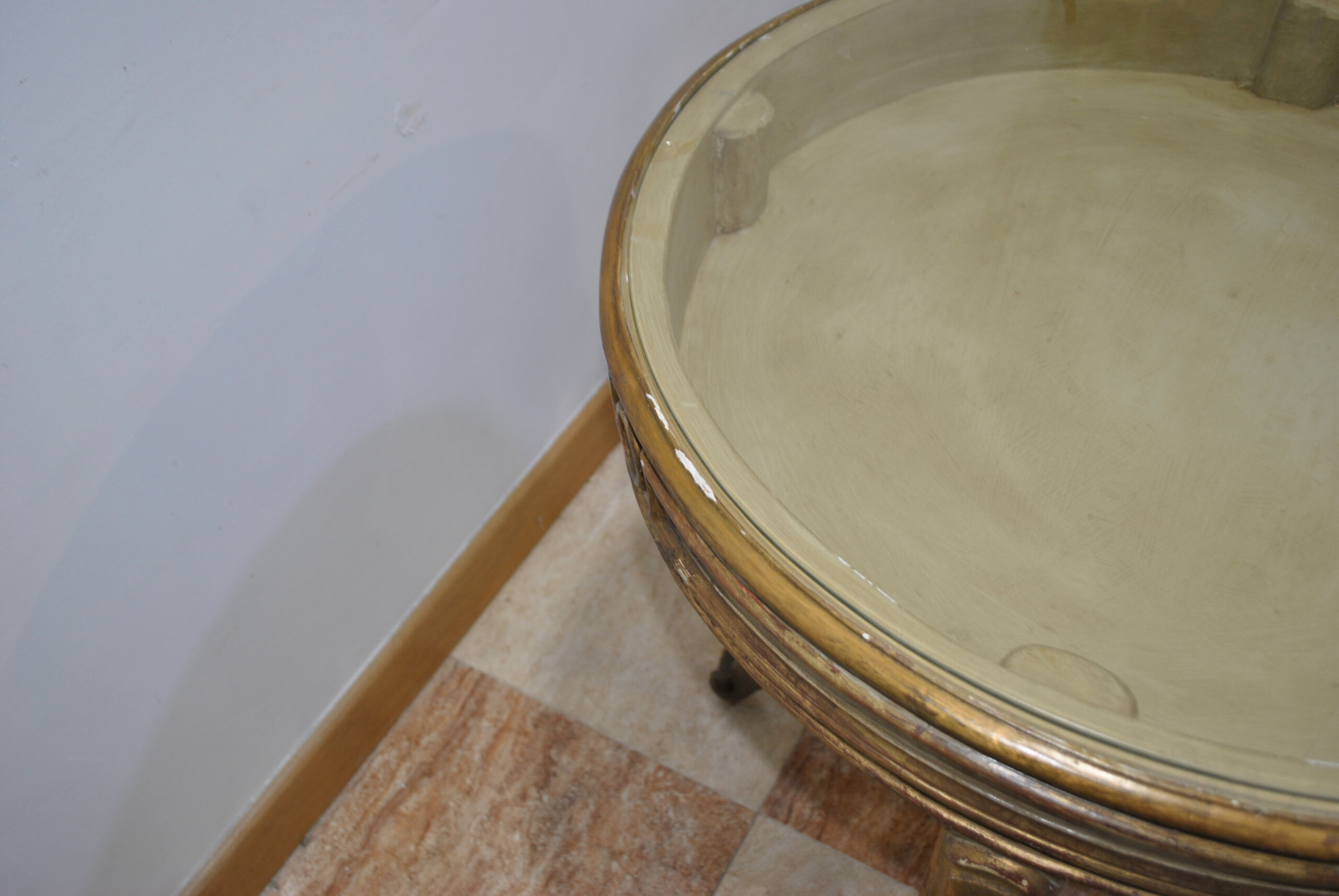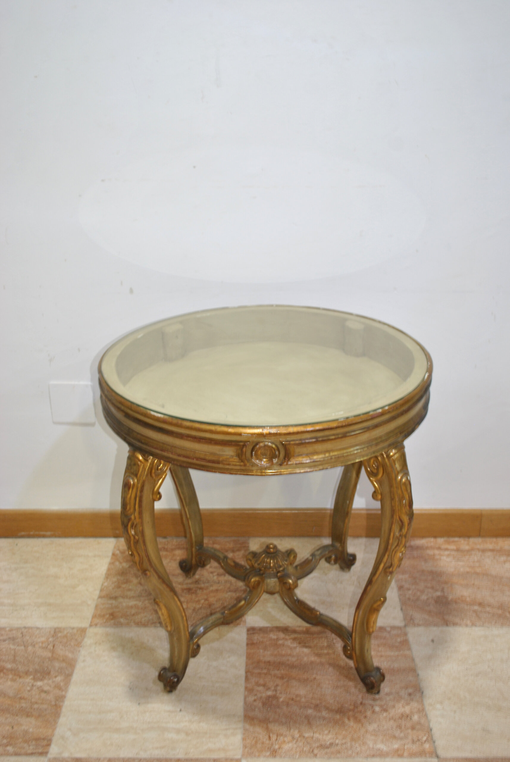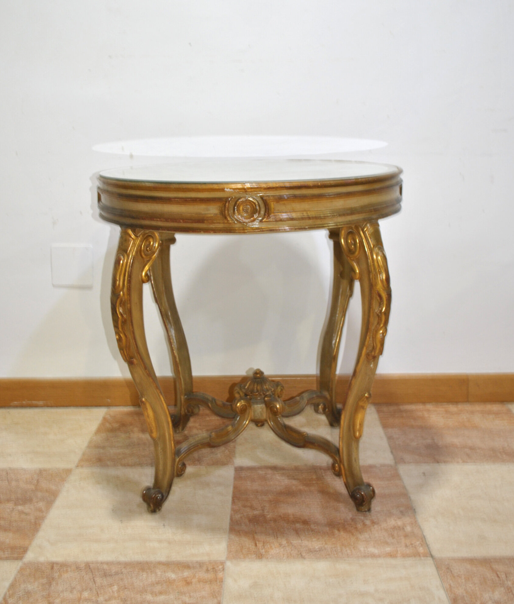 REF: 12071 -Mesa auxiliar antigua de estilo Luis XV, Siglo XVIII, realizada en madera tallada y dorada, de elegante silueta y gran riqueza ornamental. Presenta un sobre circular de cristal encajado en el aro superior, que permite ver el interior del aro y realza la ligereza visual de la pieza. El faldón está decorado con molduras clásicas y un motivo central en relieve. Se apoya sobre cuatro patas cabriolé finamente talladas con roleos y remates curvos, unidas por una cruceta inferior ondulada que aporta estabilidad y equilibrio al conjunto. Conserva su dorado original con pátina, mostrando pequeños desgastes y marcas propias del paso del tiempo, que aportan autenticidad y encanto.