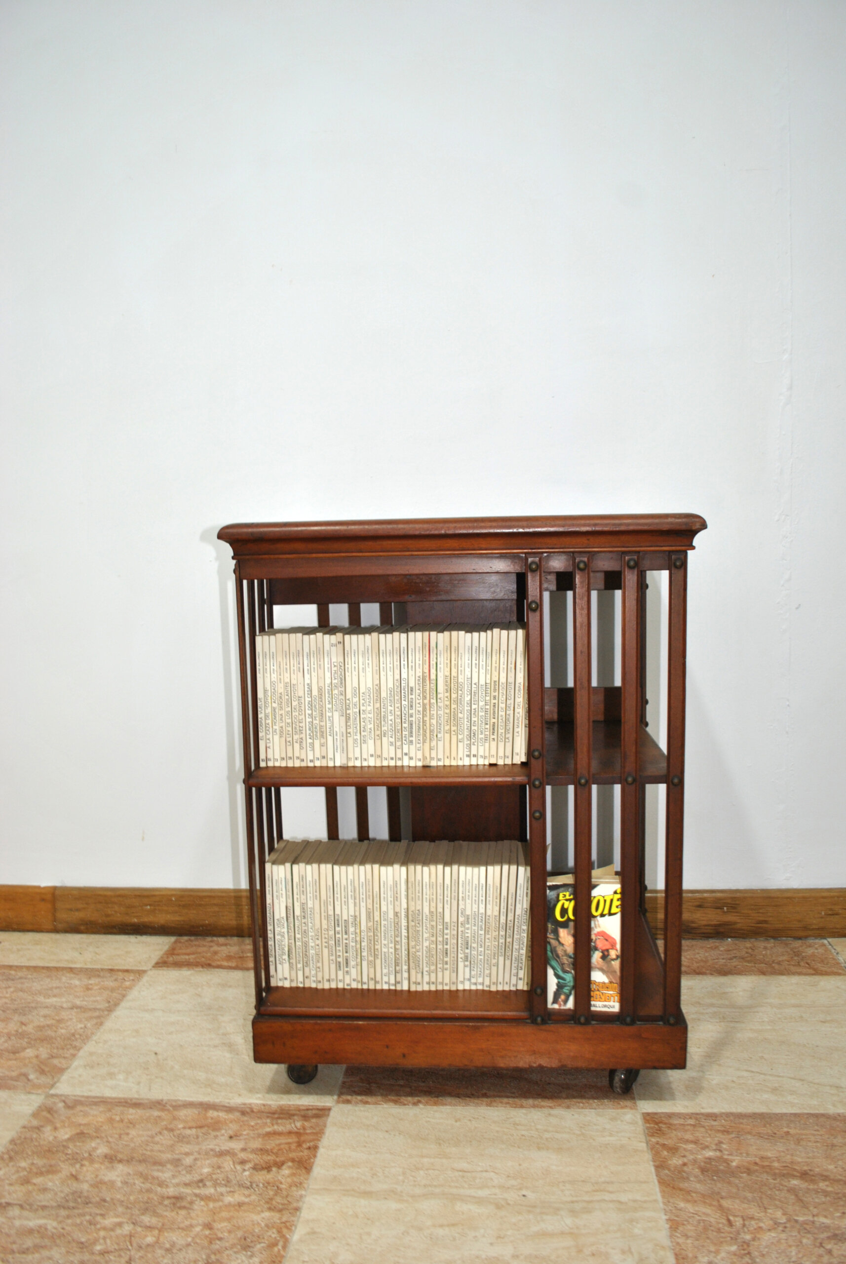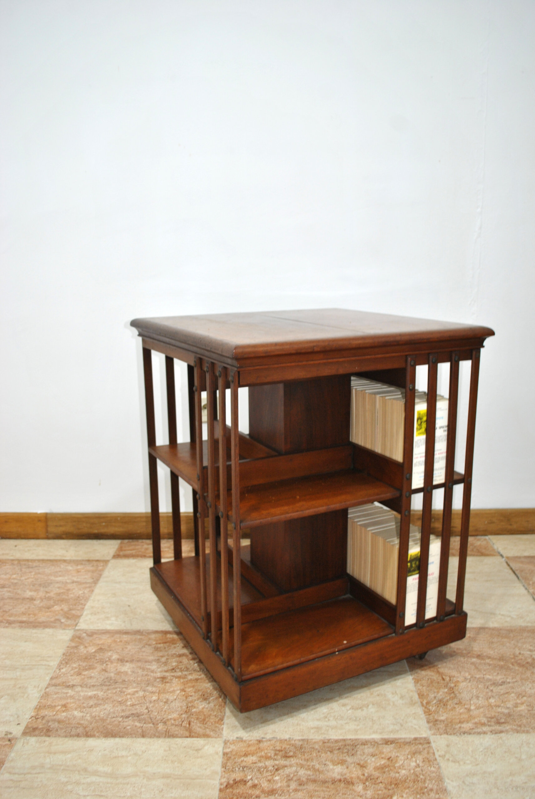 REF: 12292 – Original mesa librería giratoria de estilo clásico realizada en madera maciza con bonito acabado en tono nogal. Se trata de una pieza muy funcional y decorativa que combina mesa auxiliar con estantería para libros, revistas o pequeños objetos decorativos.