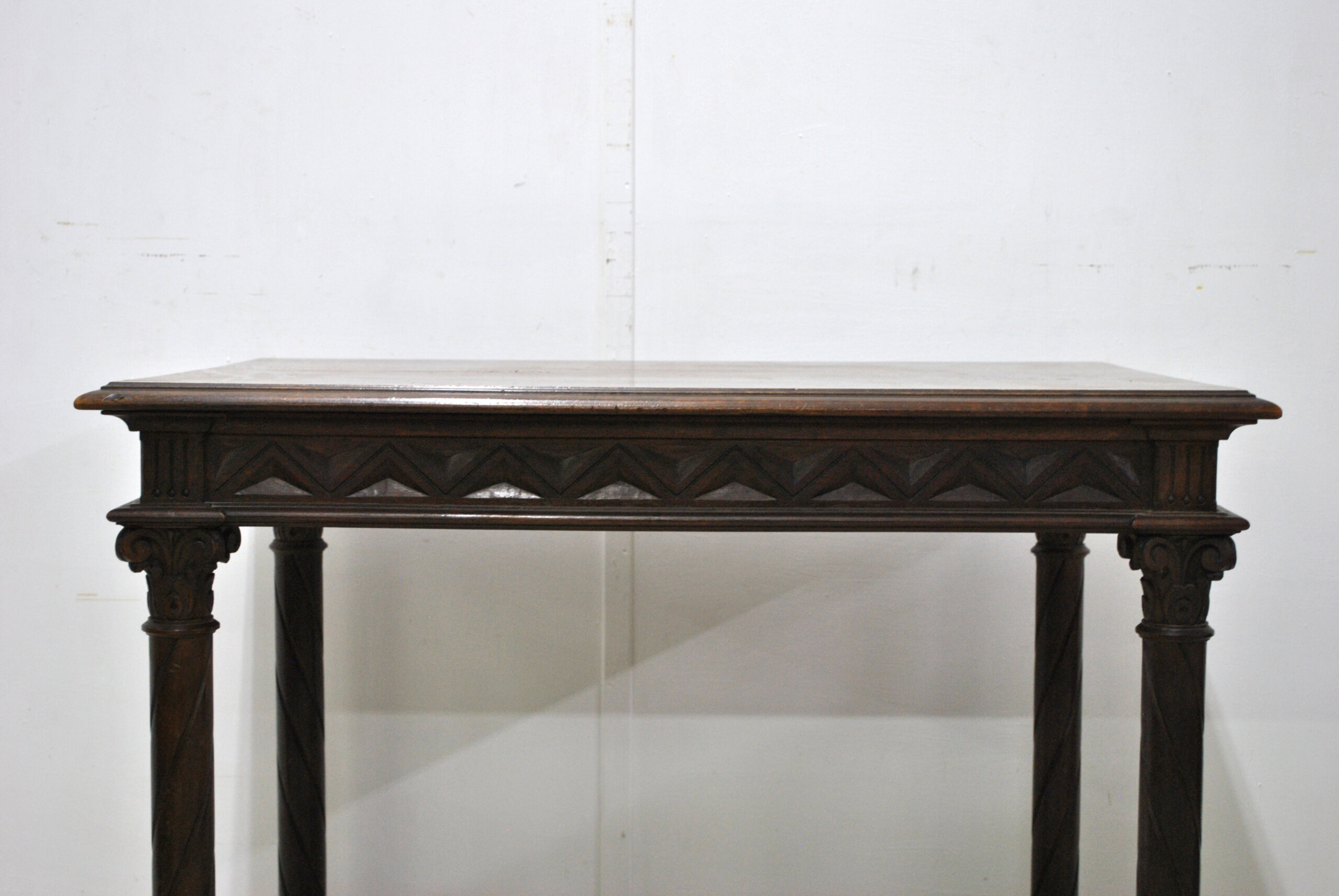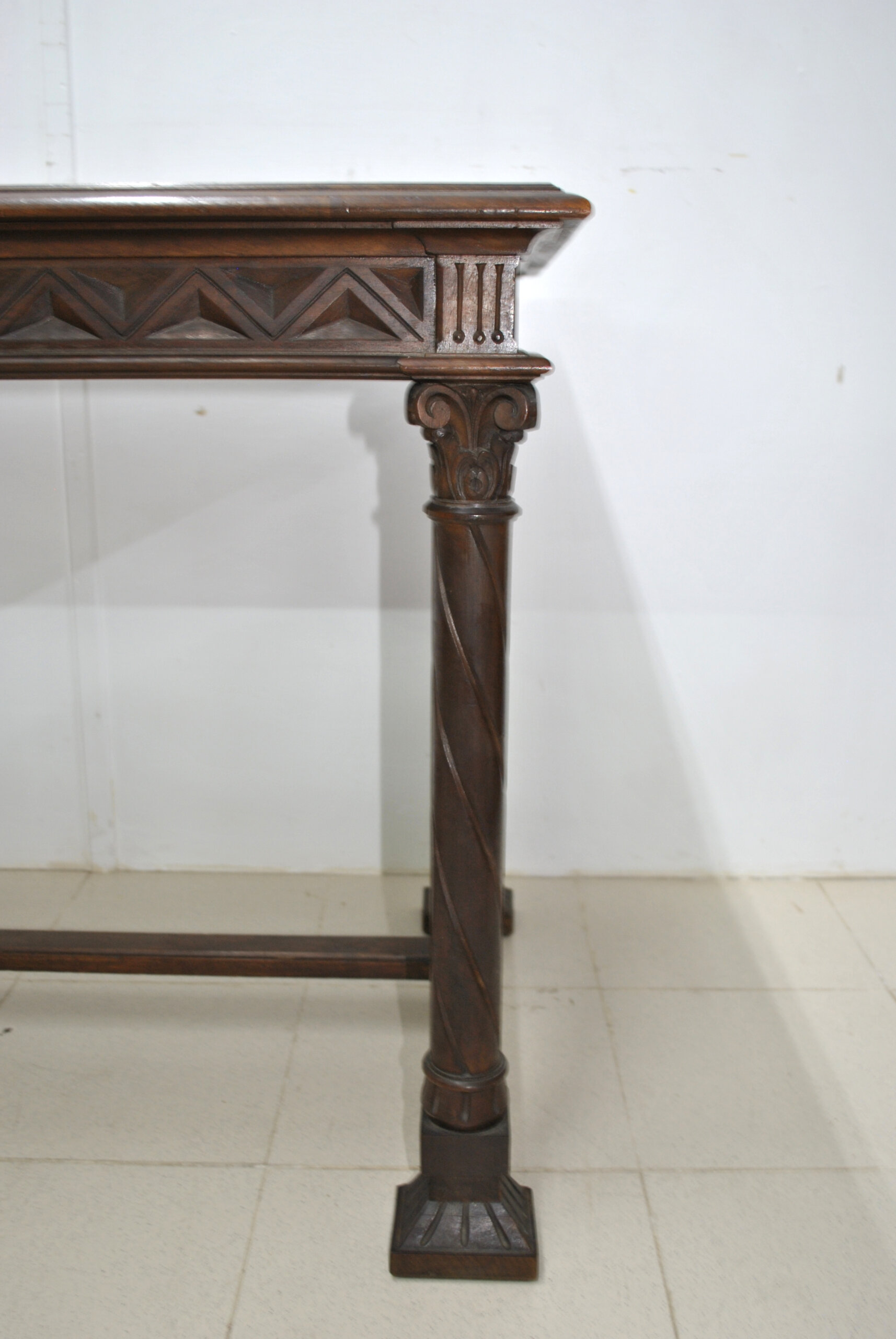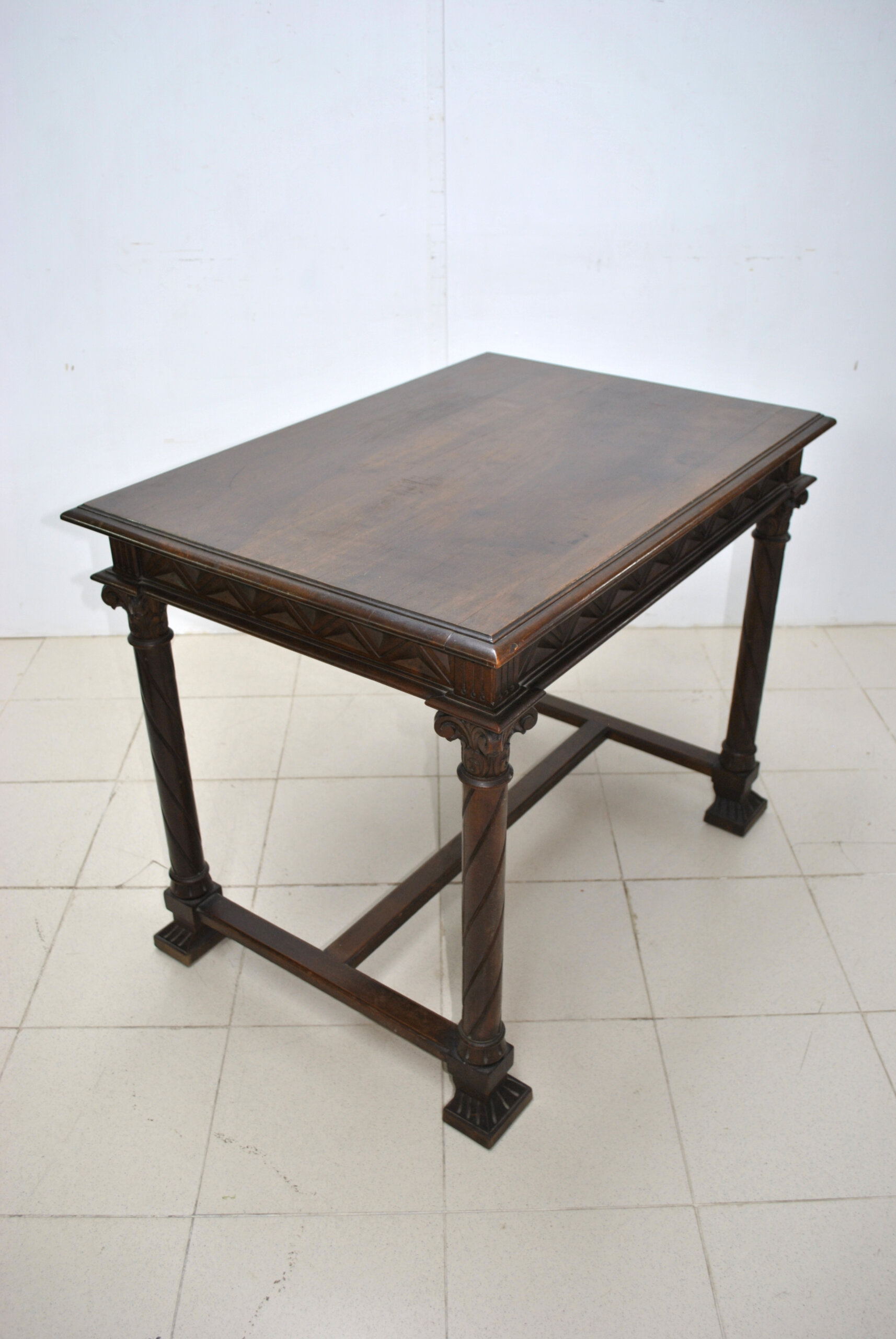 El tablero rectangular, de proporciones armoniosas, presenta un borde moldurado y un faldón ricamente decorado con un friso geométrico tallado en relieve, de diseño en zigzag, que añade ritmo visual y profundidad al conjunto. Las cuatro patas, robustas y de sección cilíndrica, están talladas con un delicado motivo helicoidal o de torsión, símbolo de dinamismo y refinamiento. Se rematan en la parte superior con capiteles de inspiración corintia, ricamente esculpidos con volutas y hojas de acanto, y se apoyan sobre bases cuadrangulares estriadas que aportan estabilidad y presencia. Una travesaña inferior une las patas, reforzando la estructura y asegurando su solidez, a la vez que equilibra el diseño con un sentido arquitectónico característico del estilo renacentista. El tono oscuro y profundo de la madera, con su pátina original, realza la nobleza del material y subraya su carácter histórico. Pequeños signos del tiempo atestiguan su autenticidad y su conservación.