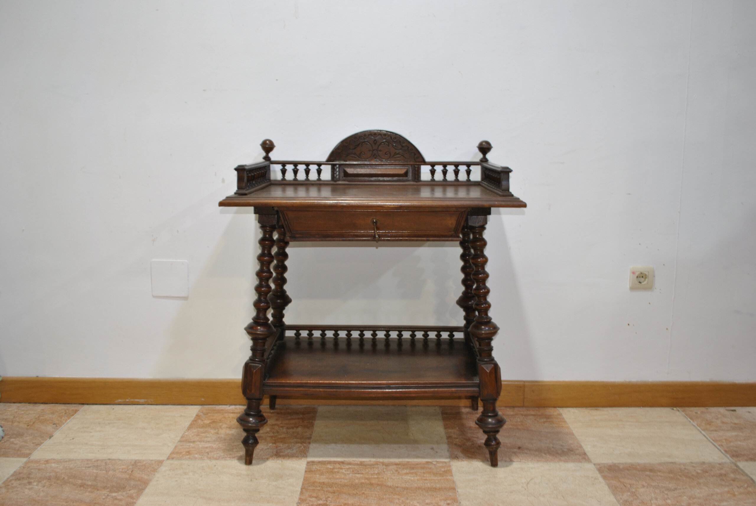 Cuenta con una amplia superficie superior en forma de bandeja, con barandilla decorativa y un respaldo tallado en la parte trasera, perfecto para dar un toque distintivo y decorativo. Incluye además un cajón frontal amplio, ideal para guardar llaves, correspondencia, mandos o pequeños objetos, y una bandeja inferior que aporta estabilidad y espacio extra de almacenaje.