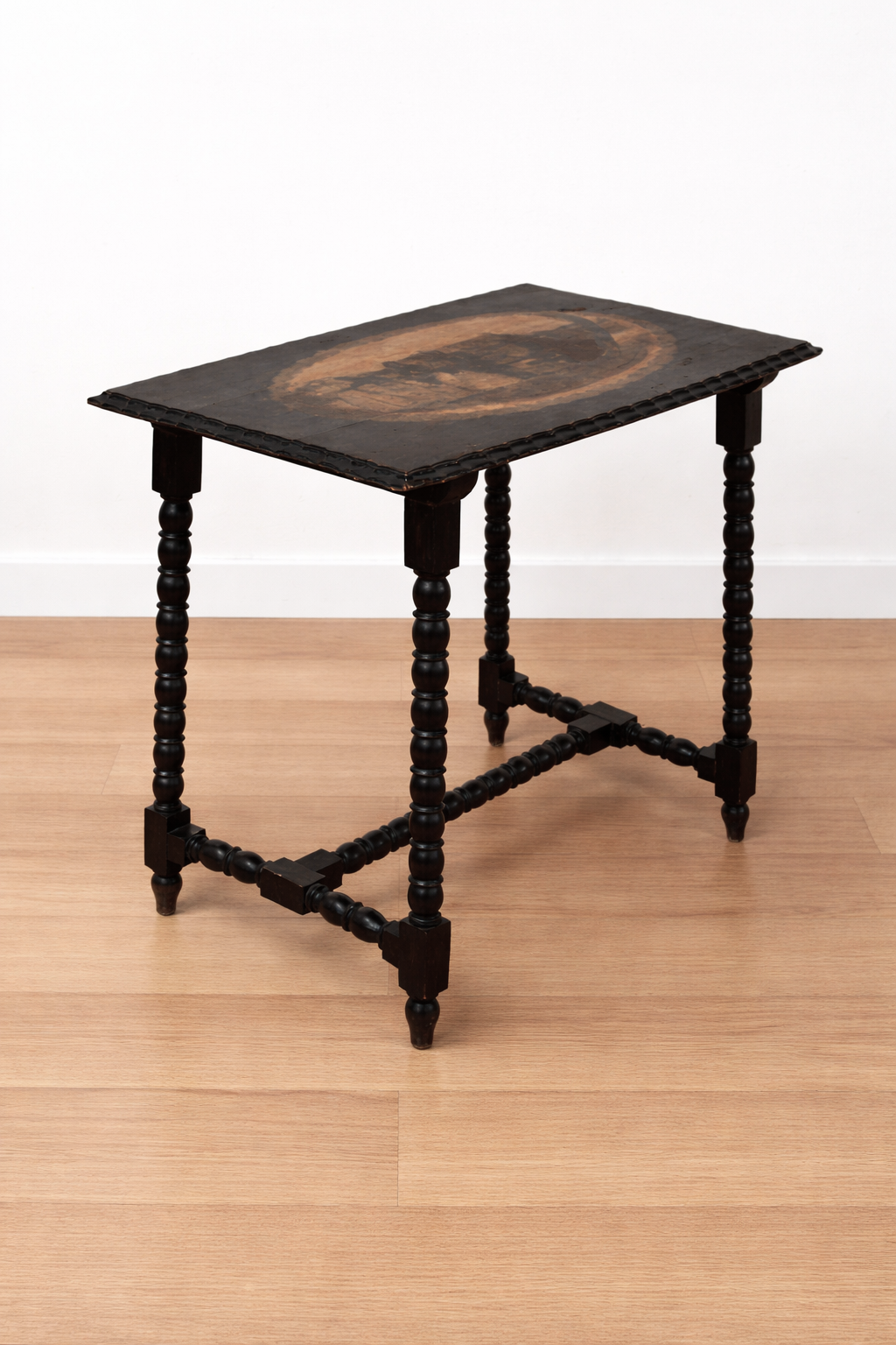 REF: 12324 – Magnífica mesa antigua de estilo castellano, una pieza con gran personalidad que combina artesanía tradicional y valor decorativo. Destaca especialmente su tablero con una escena central decorativa tipo marquetería o técnica pictórica, representando una escena clásica de época, lo que la convierte en una pieza única y muy especial.