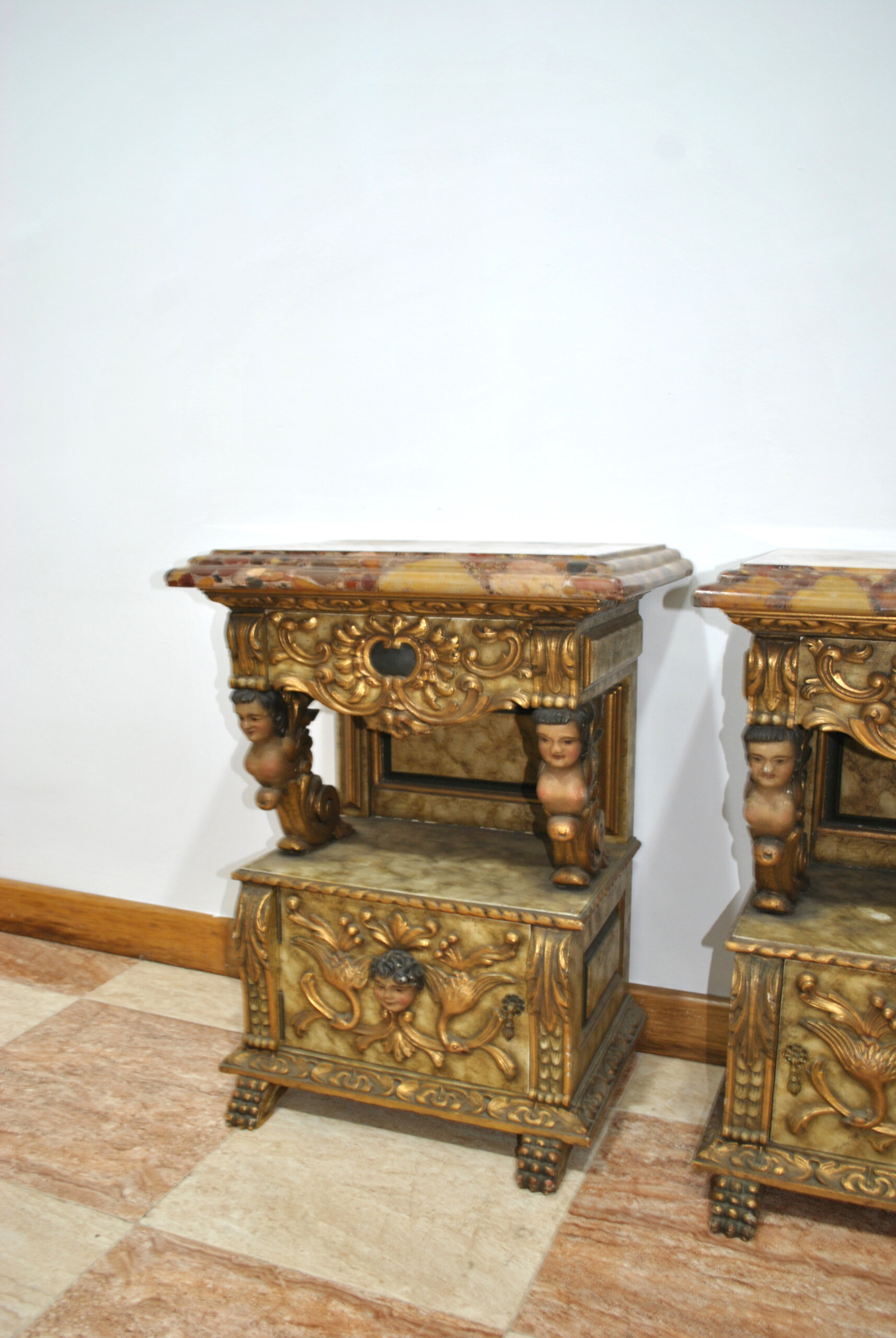 REF: 12244 – Espectacular pareja de mesillas antiguas de gran carácter decorativo, realizadas en madera tallada y ricamente ornamentadas con motivos barrocos y figuras de querubines. Destacan por su cuidada talla artesanal y su elegante policromía en tonos dorados que realza los relieves.