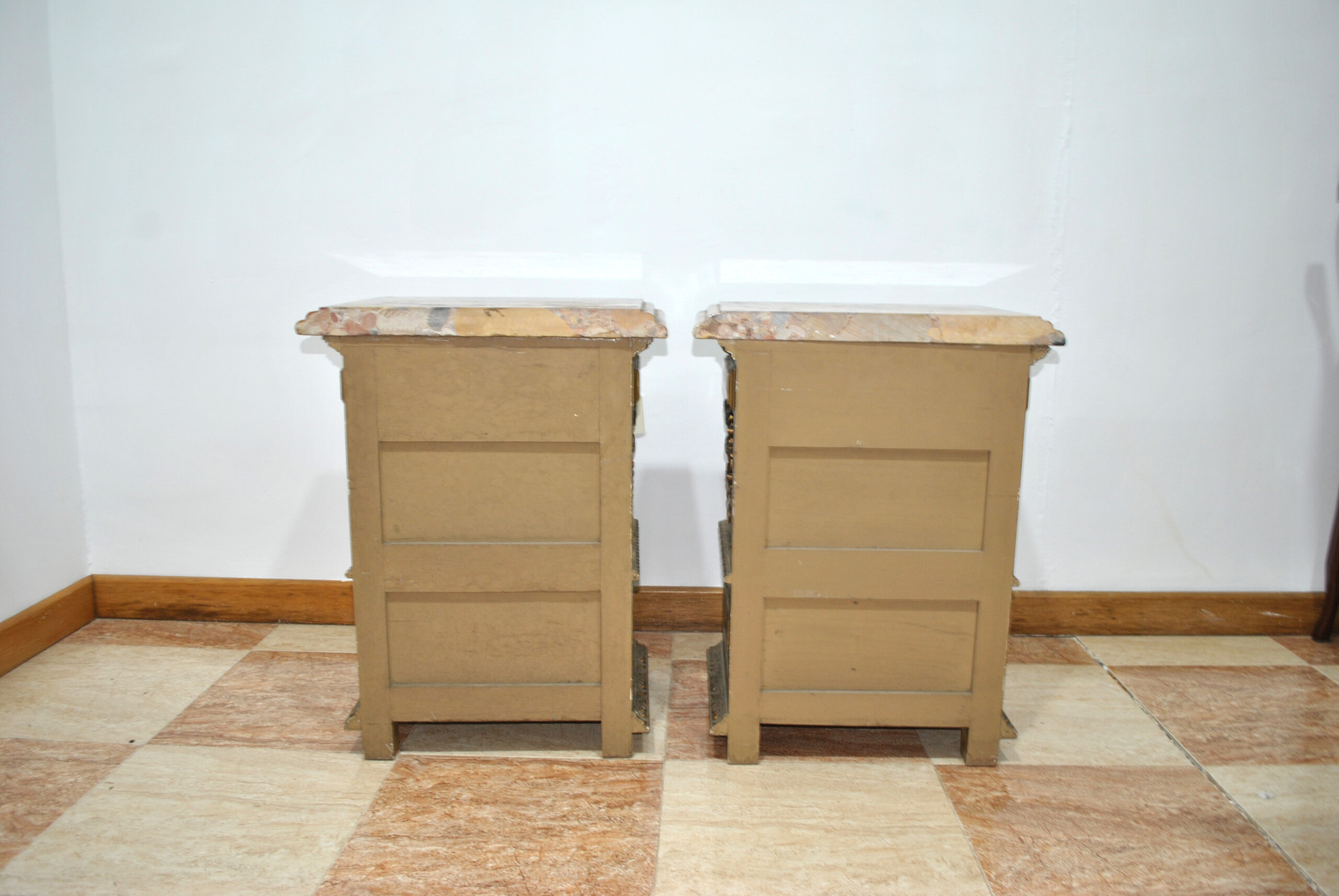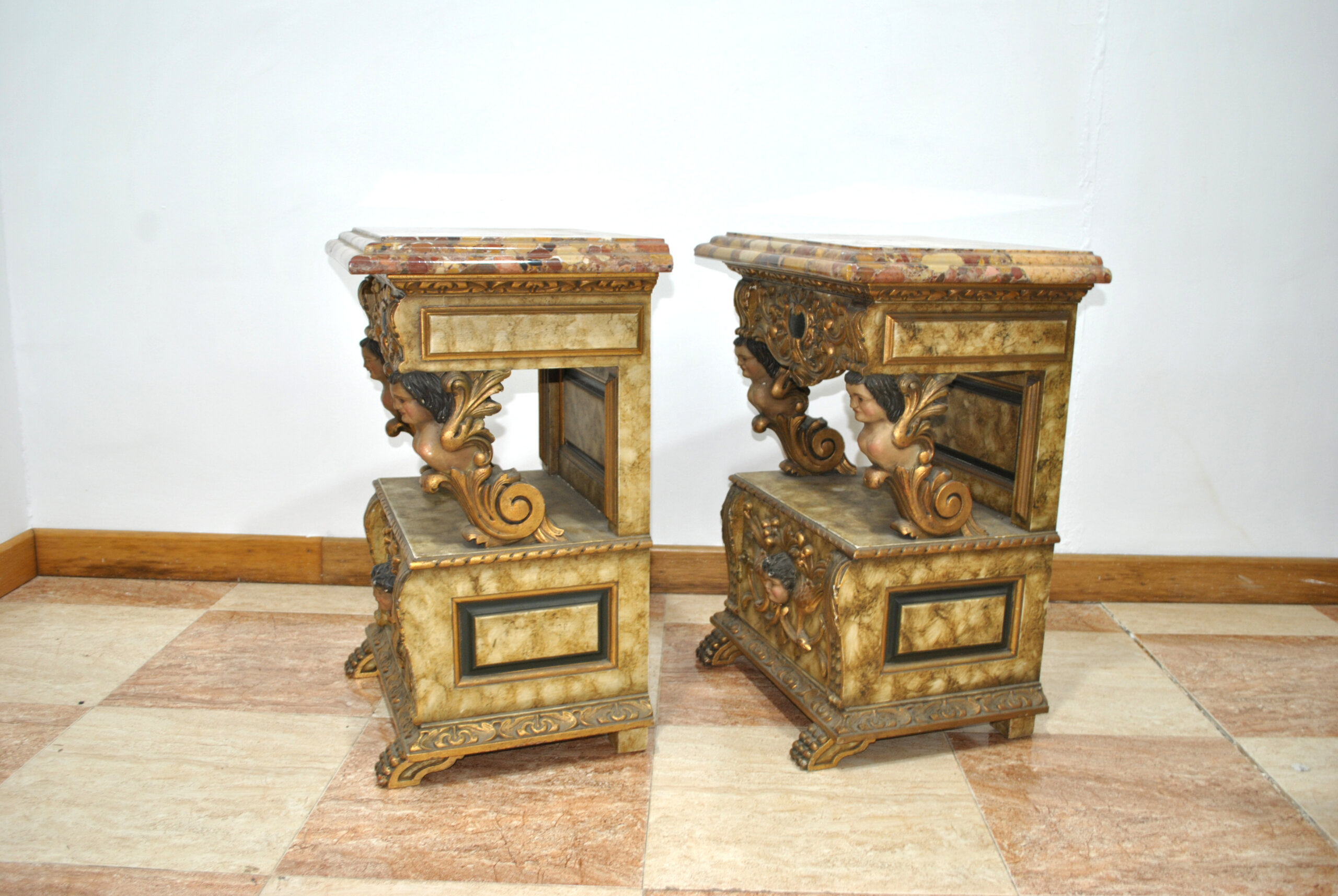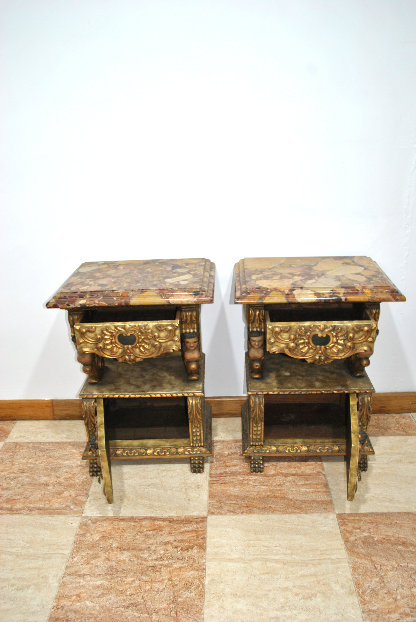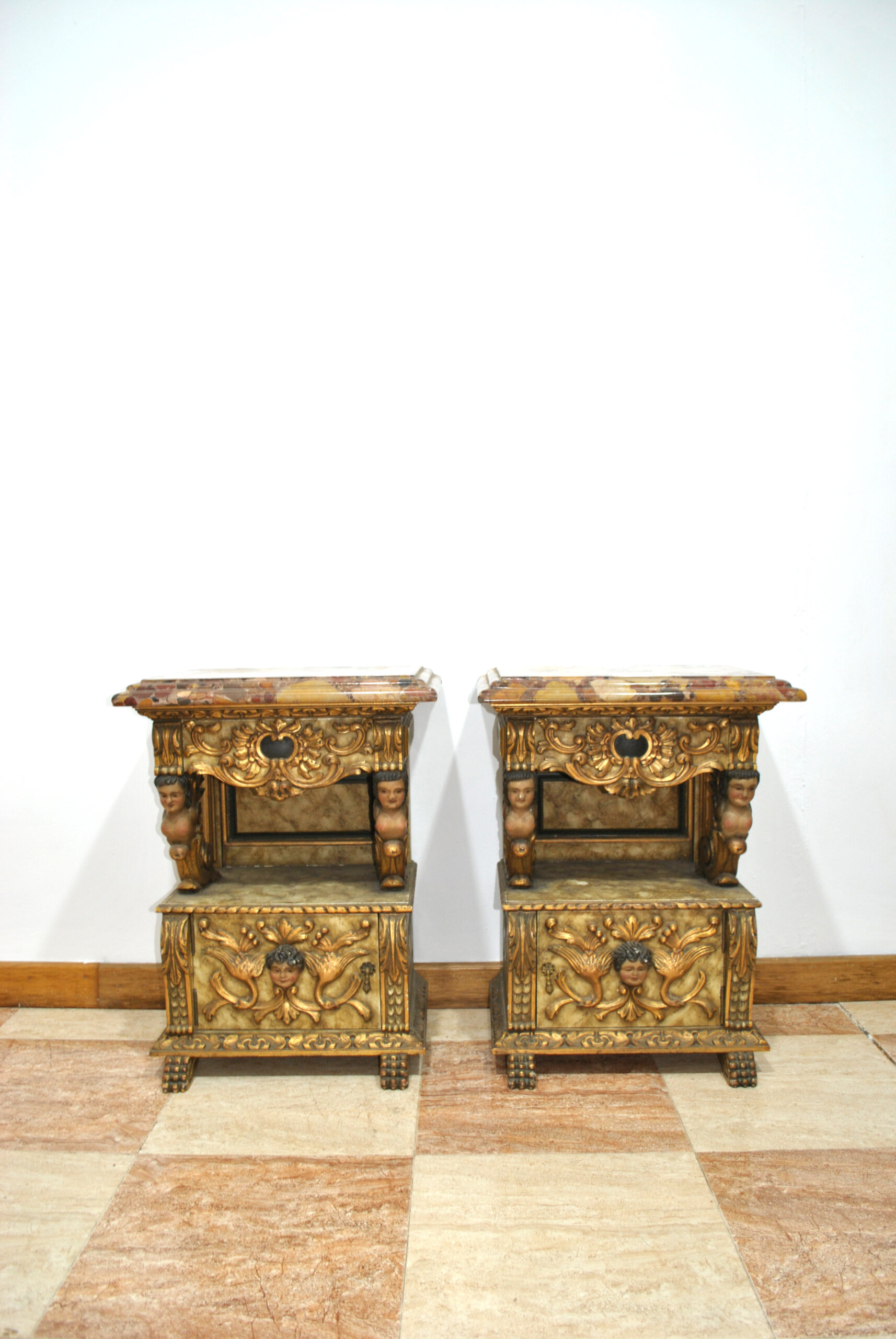 La parte superior está rematada con una vistosa tapa de mármol policromado, que aporta solidez y un toque distinguido. Cada mesilla dispone de un cajón superior y un pequeño armario inferior con puerta, ofreciendo espacio de almacenaje y funcionalidad además de su valor decorativo.