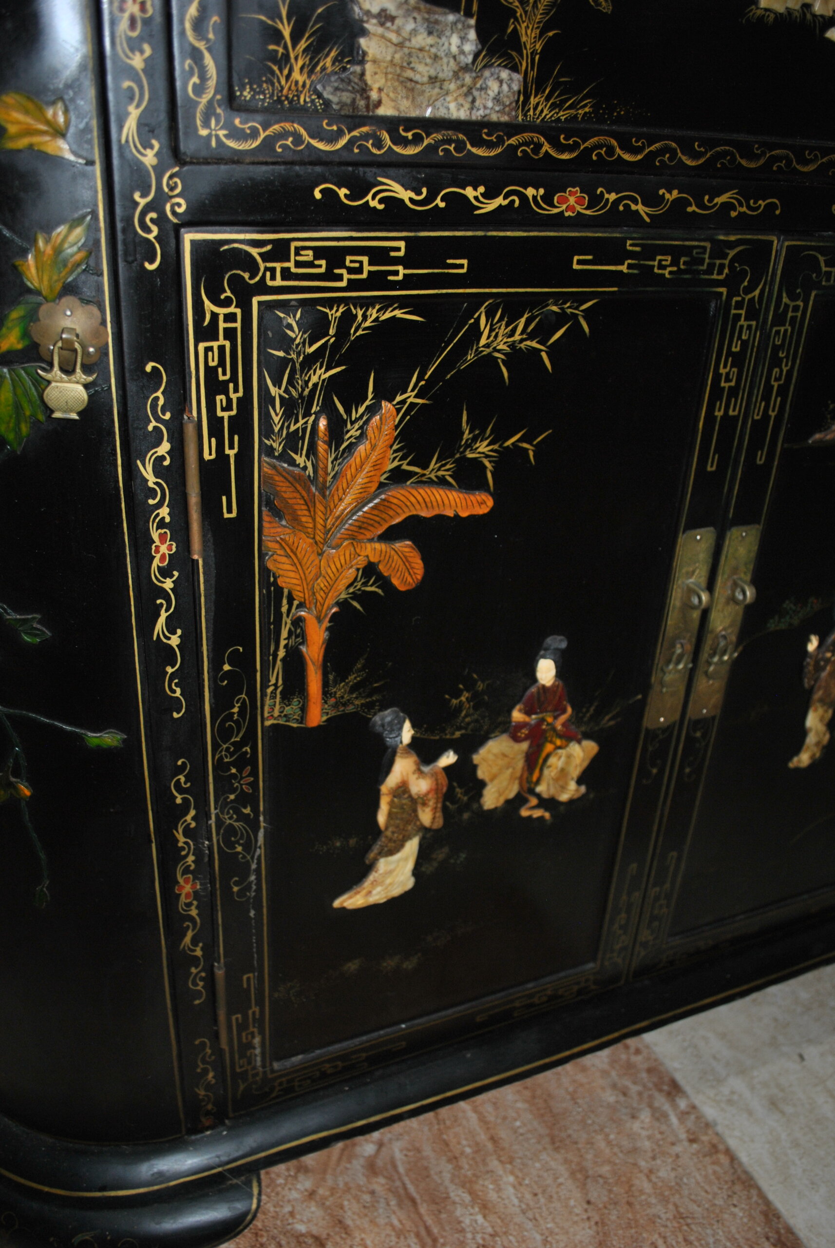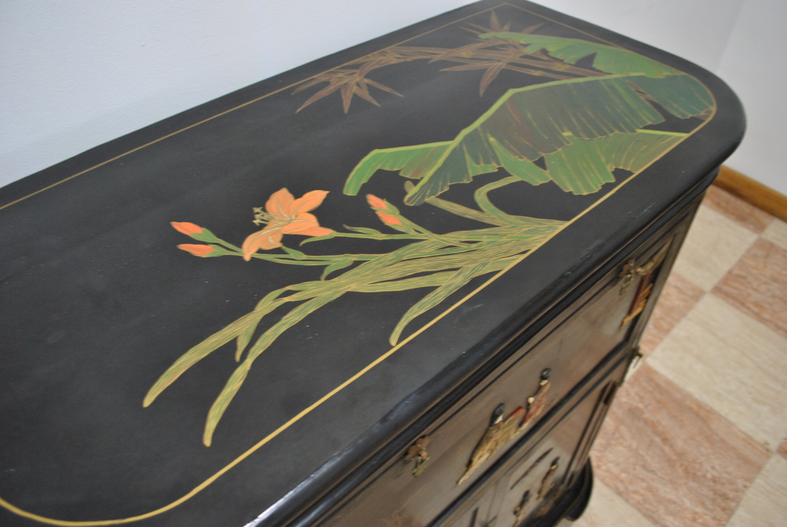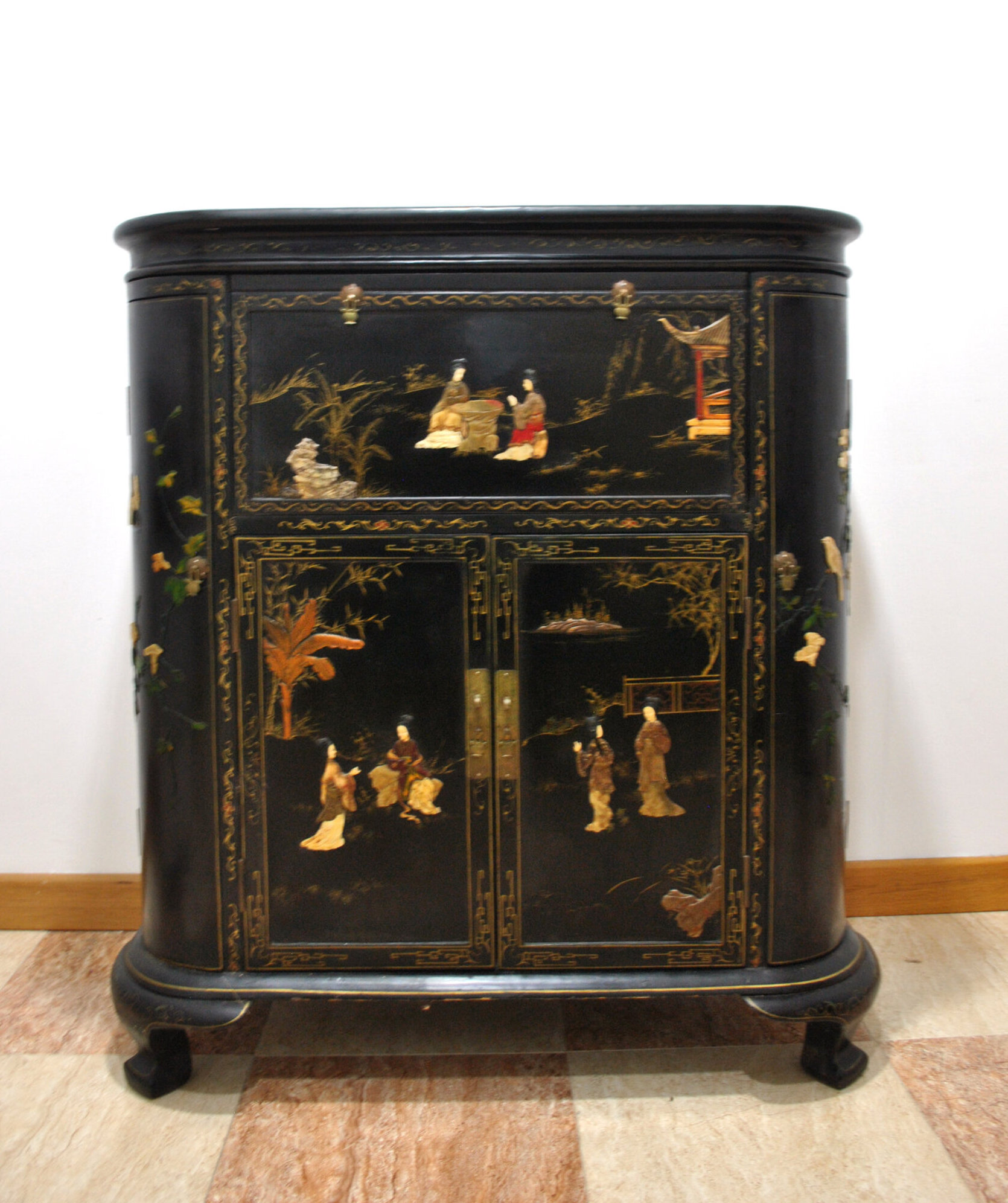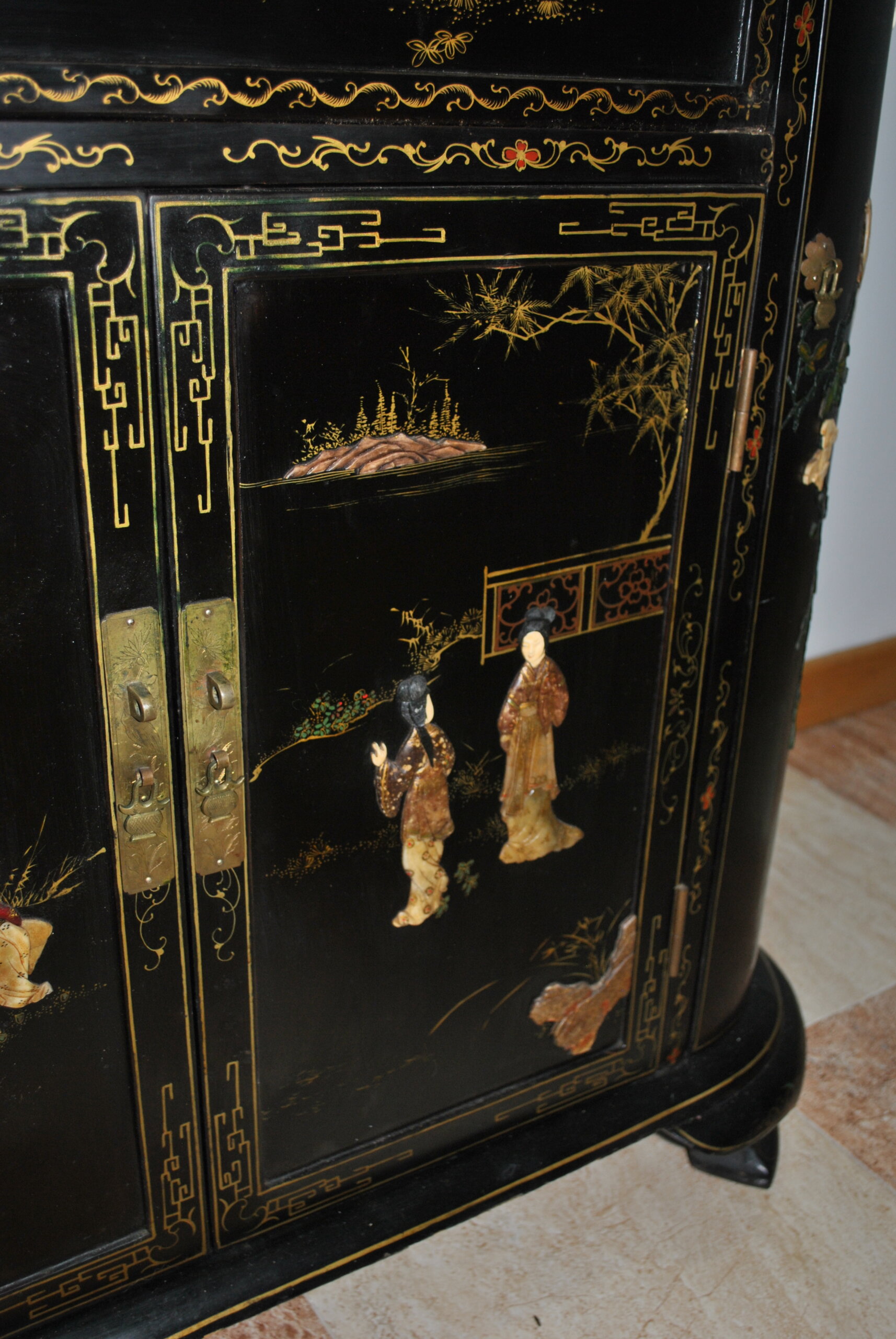 REF: 12417 – Elegante mueble bar de estilo oriental, realizado en madera lacada en negro con una exquisita decoración artesanal. Destaca por sus escenas tradicionales chinas con figuras en relieve, finos detalles dorados y motivos vegetales pintados a mano, que le aportan gran personalidad y valor decorativo.