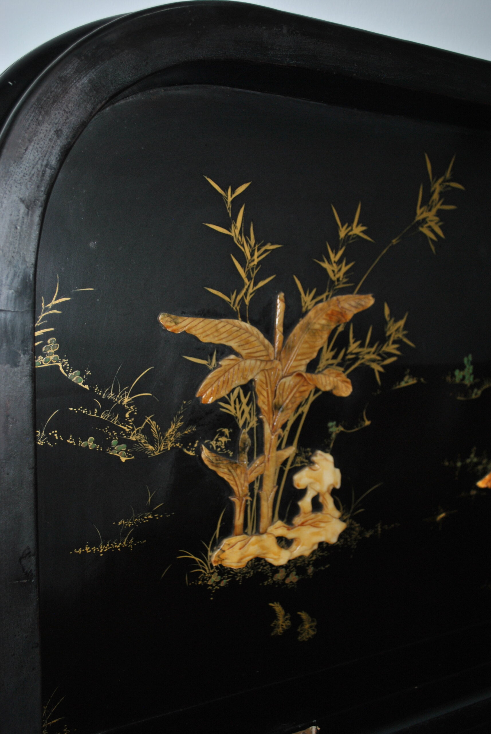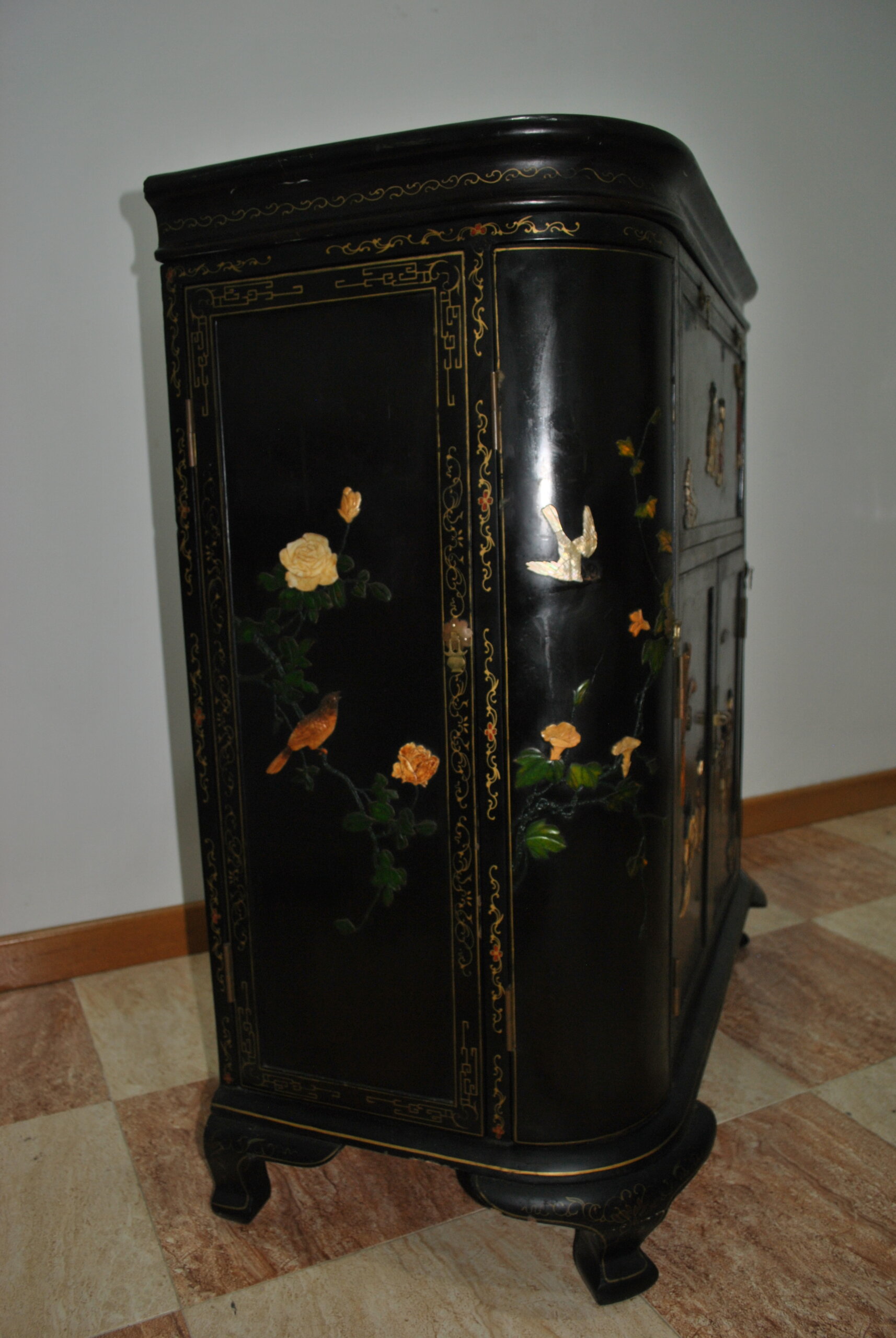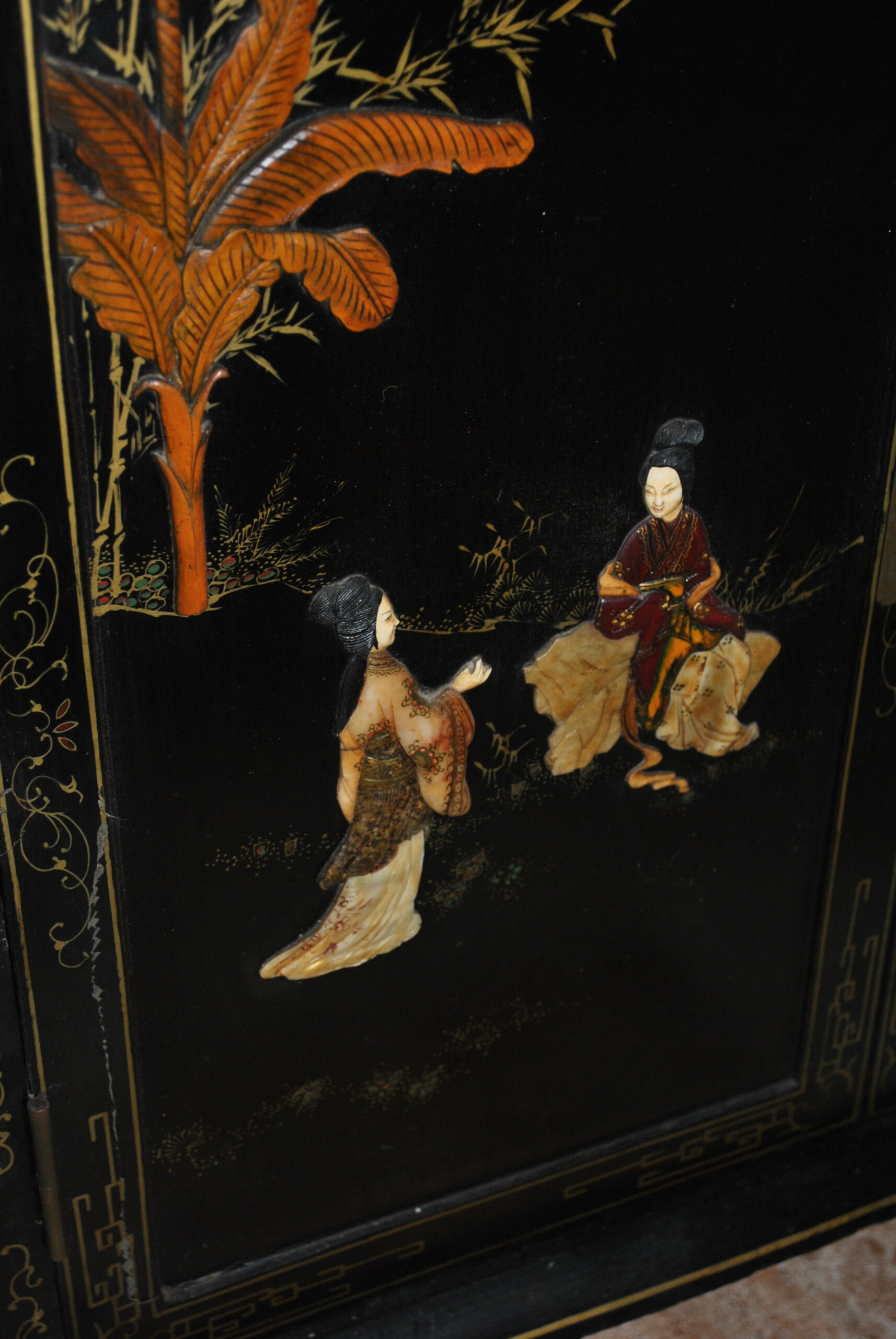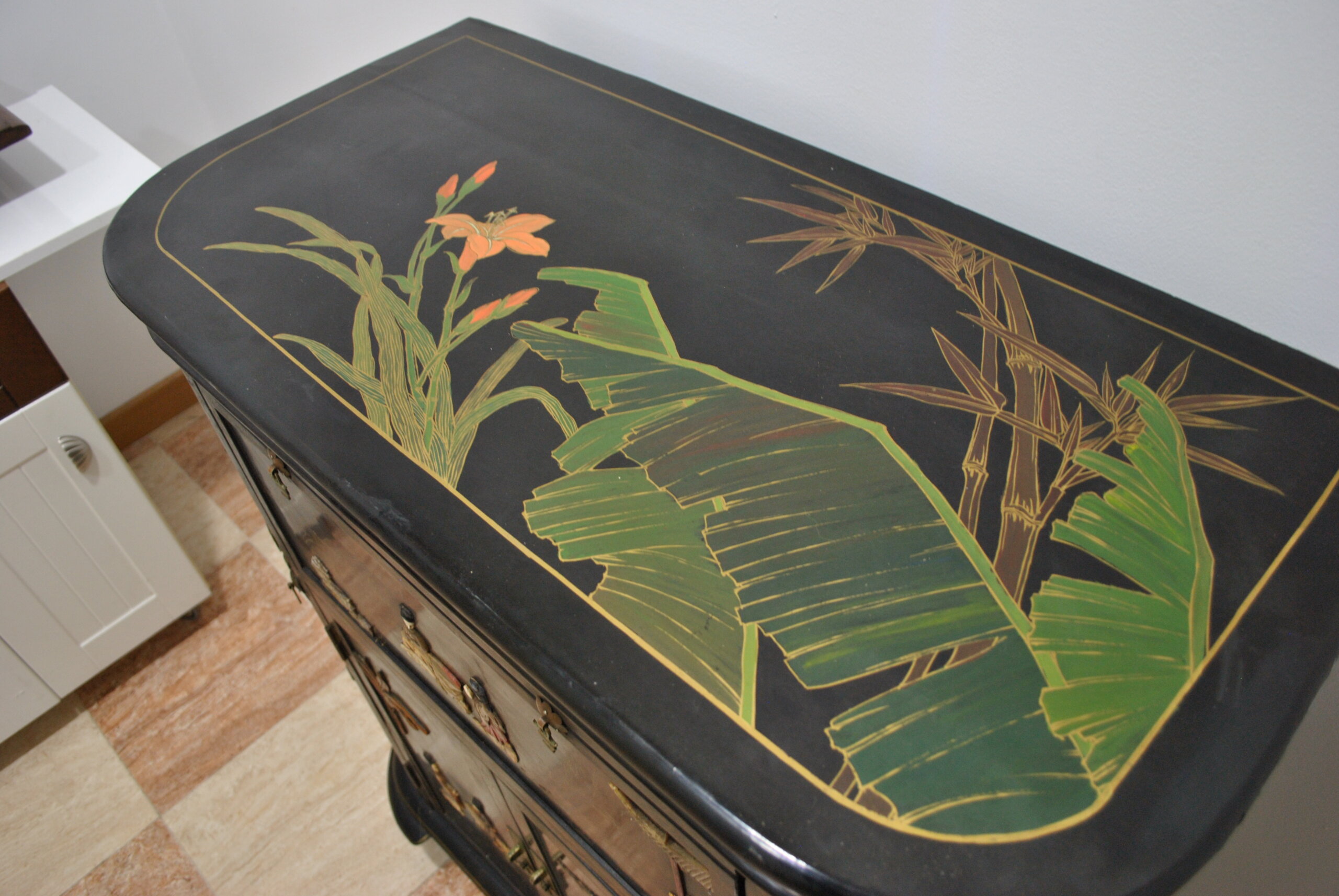 REF: 12417 – Elegante mueble bar de estilo oriental, realizado en madera lacada en negro con una exquisita decoración artesanal. Destaca por sus escenas tradicionales chinas con figuras en relieve, finos detalles dorados y motivos vegetales pintados a mano, que le aportan gran personalidad y valor decorativo.