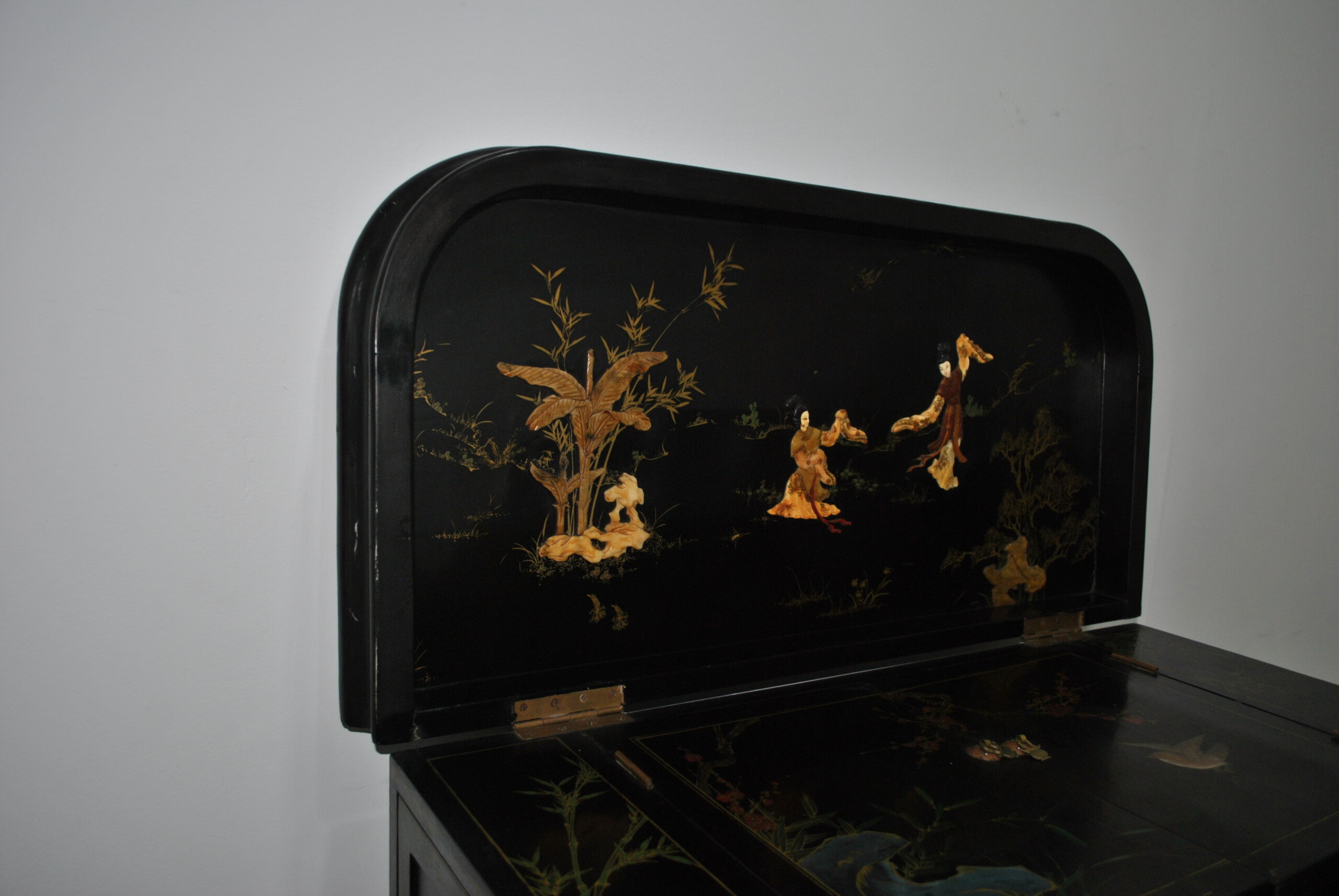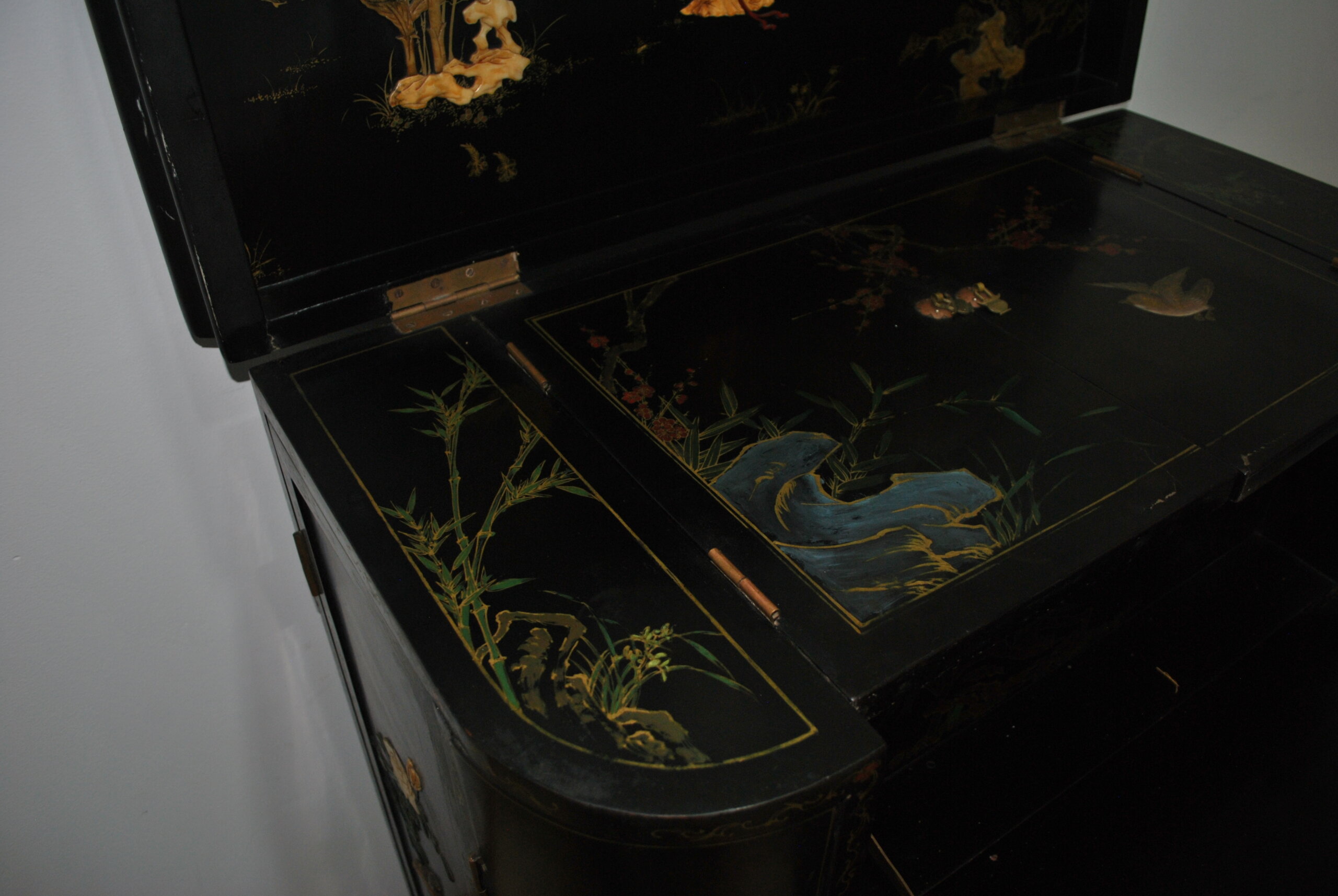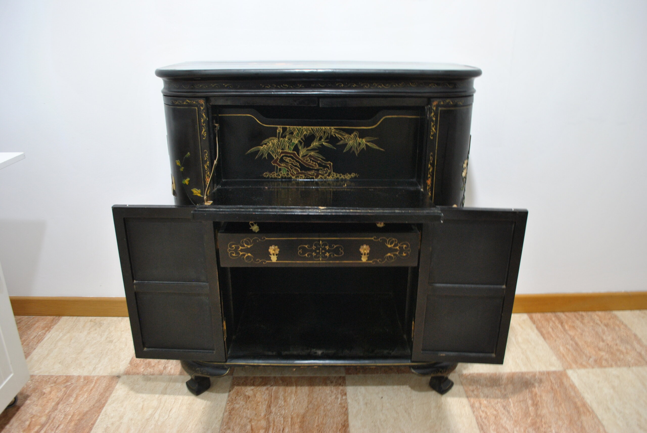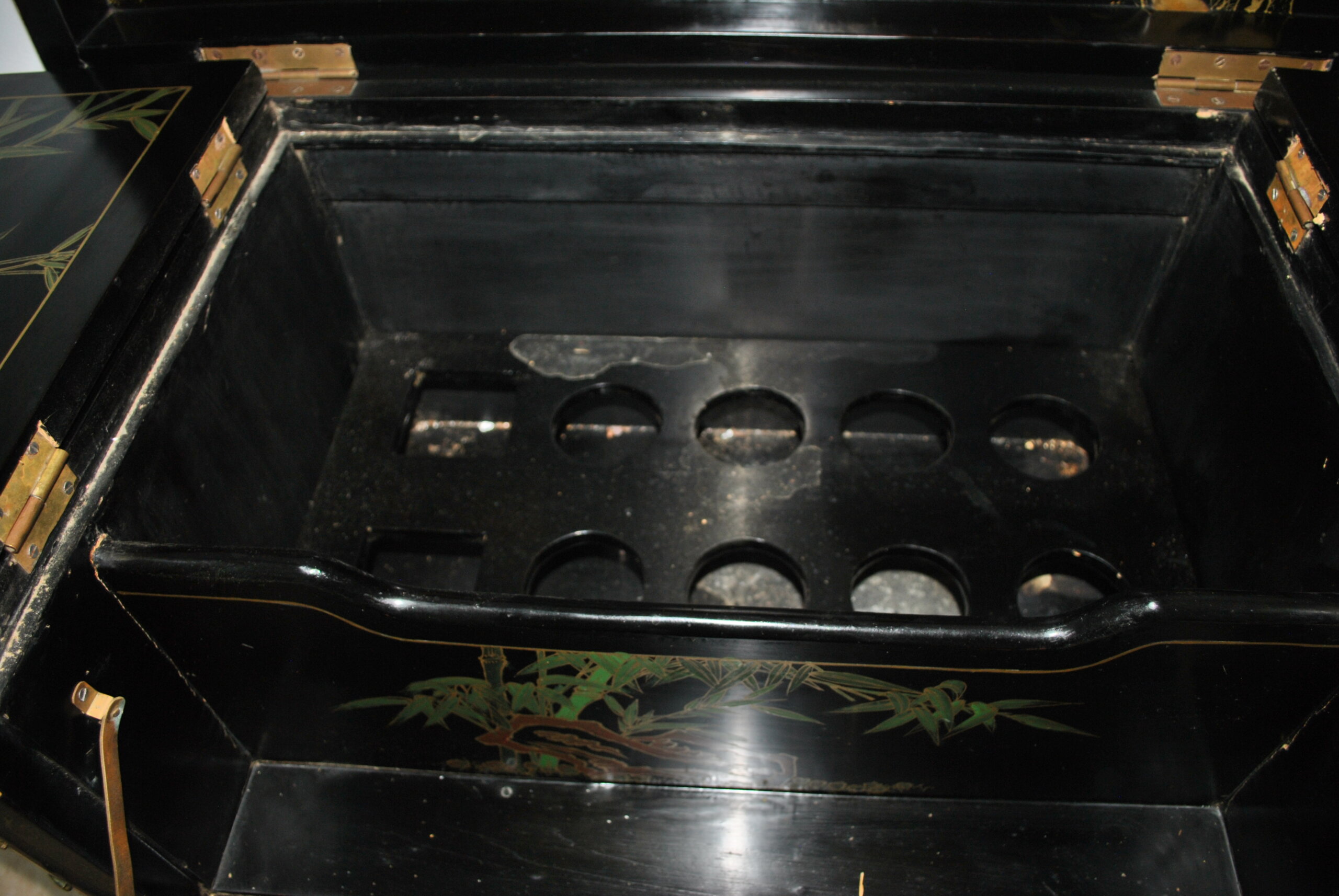 El interior también está decorado con escenas orientales, lo que refleja la calidad y el cuidado en cada detalle, incluso en las partes menos visibles. Incluye espacio para botellas y accesorios, convirtiéndolo en una pieza tanto decorativa como funcional.