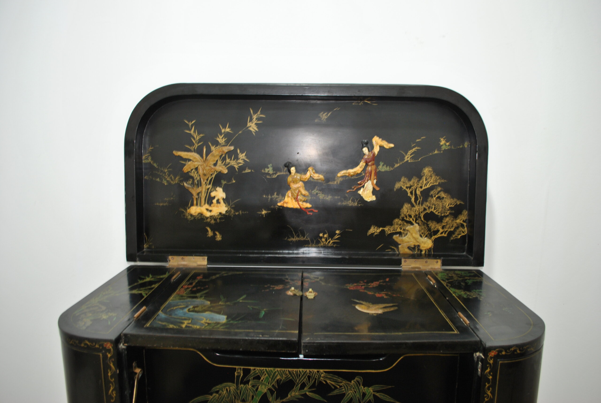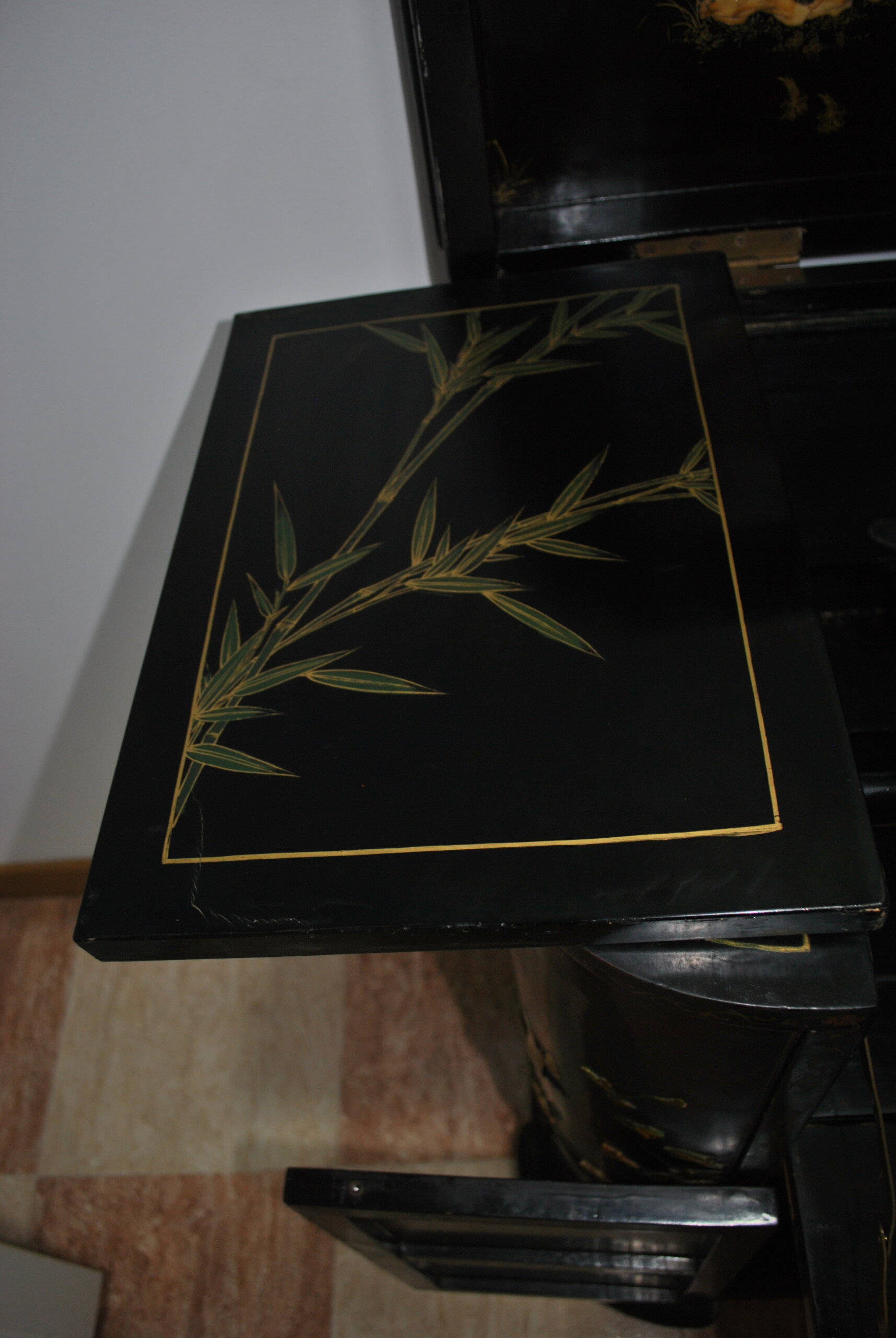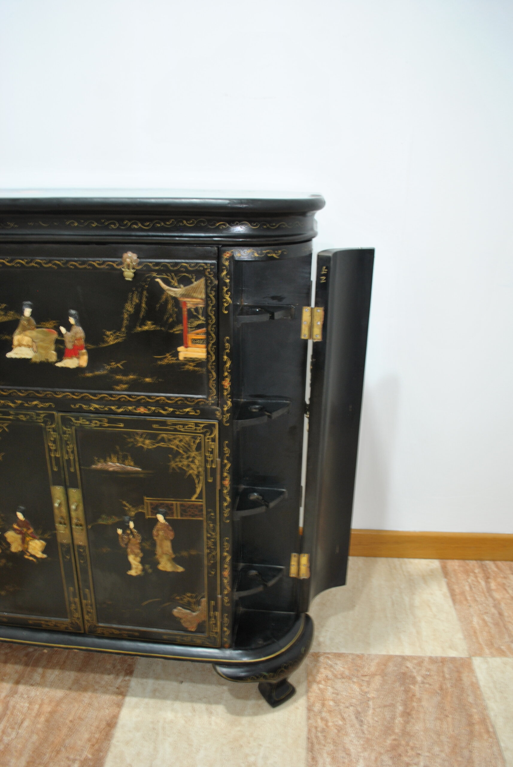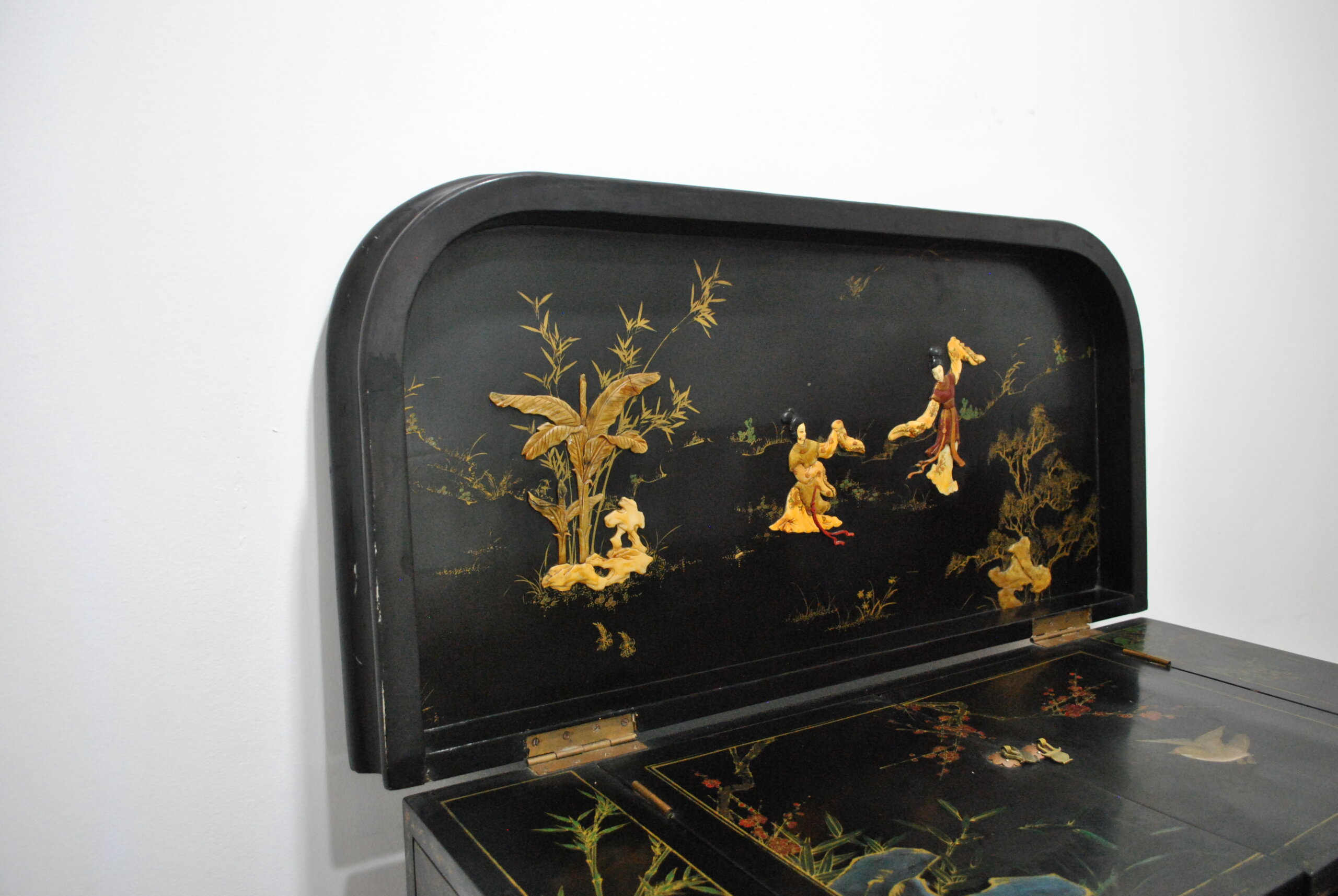 El interior también está decorado con escenas orientales, lo que refleja la calidad y el cuidado en cada detalle, incluso en las partes menos visibles. Incluye espacio para botellas y accesorios, convirtiéndolo en una pieza tanto decorativa como funcional.