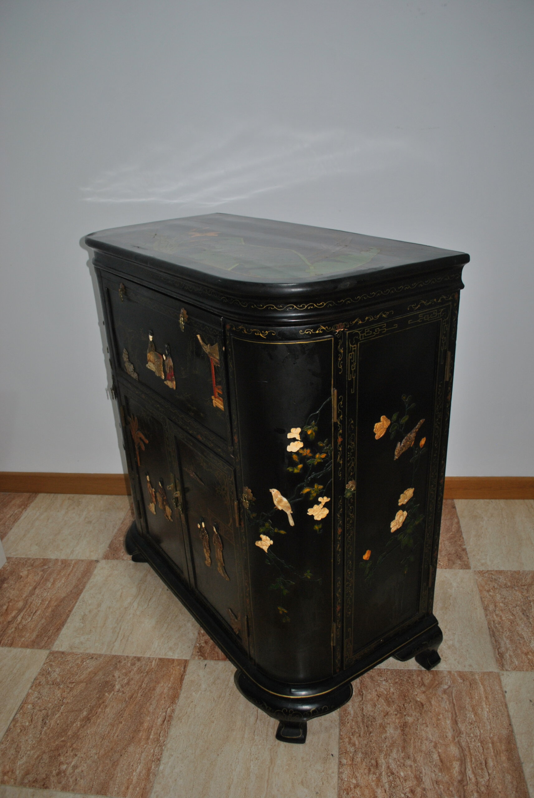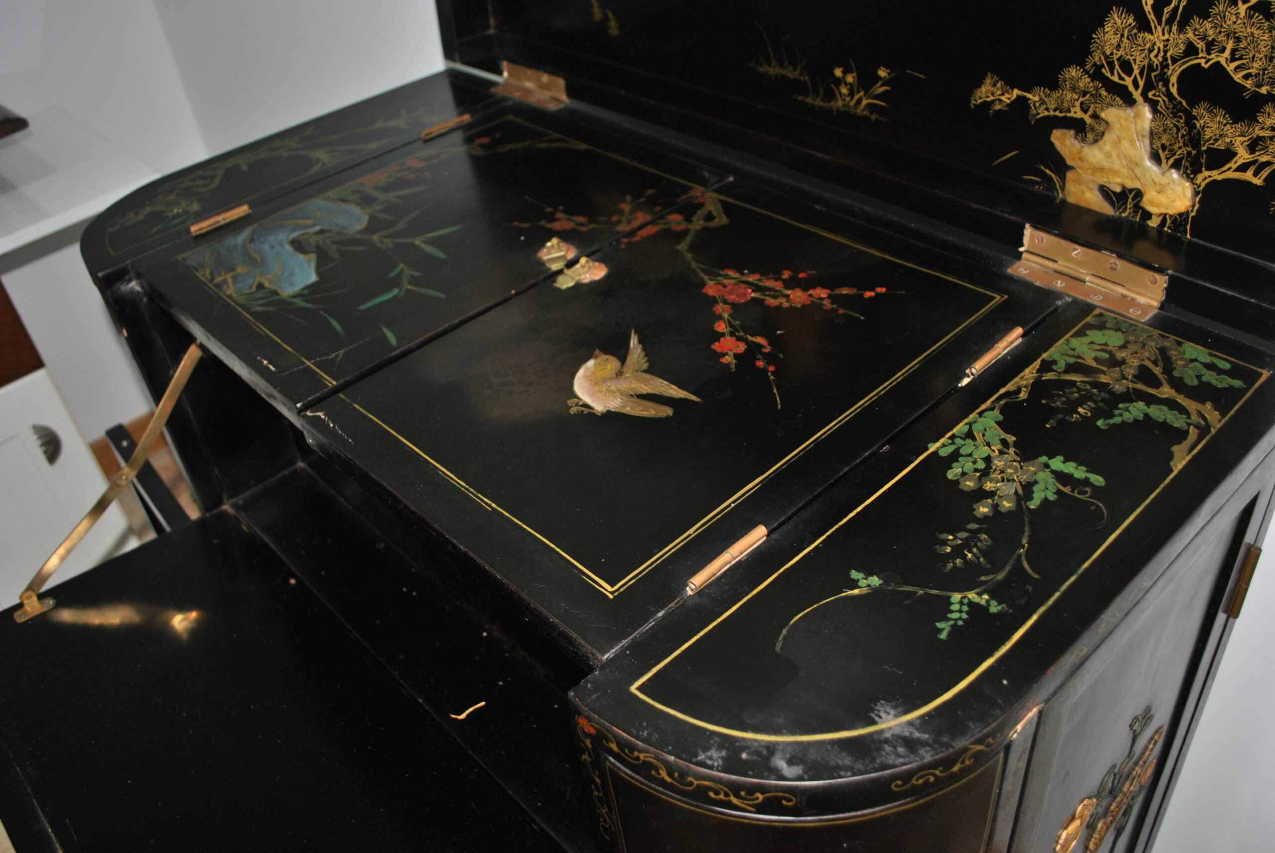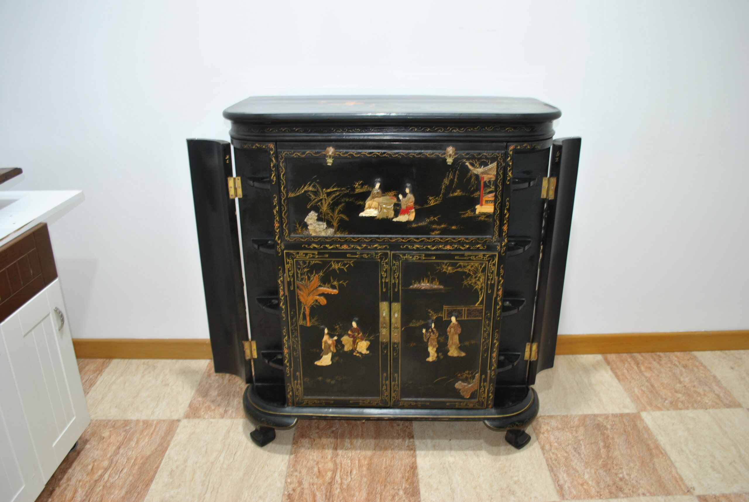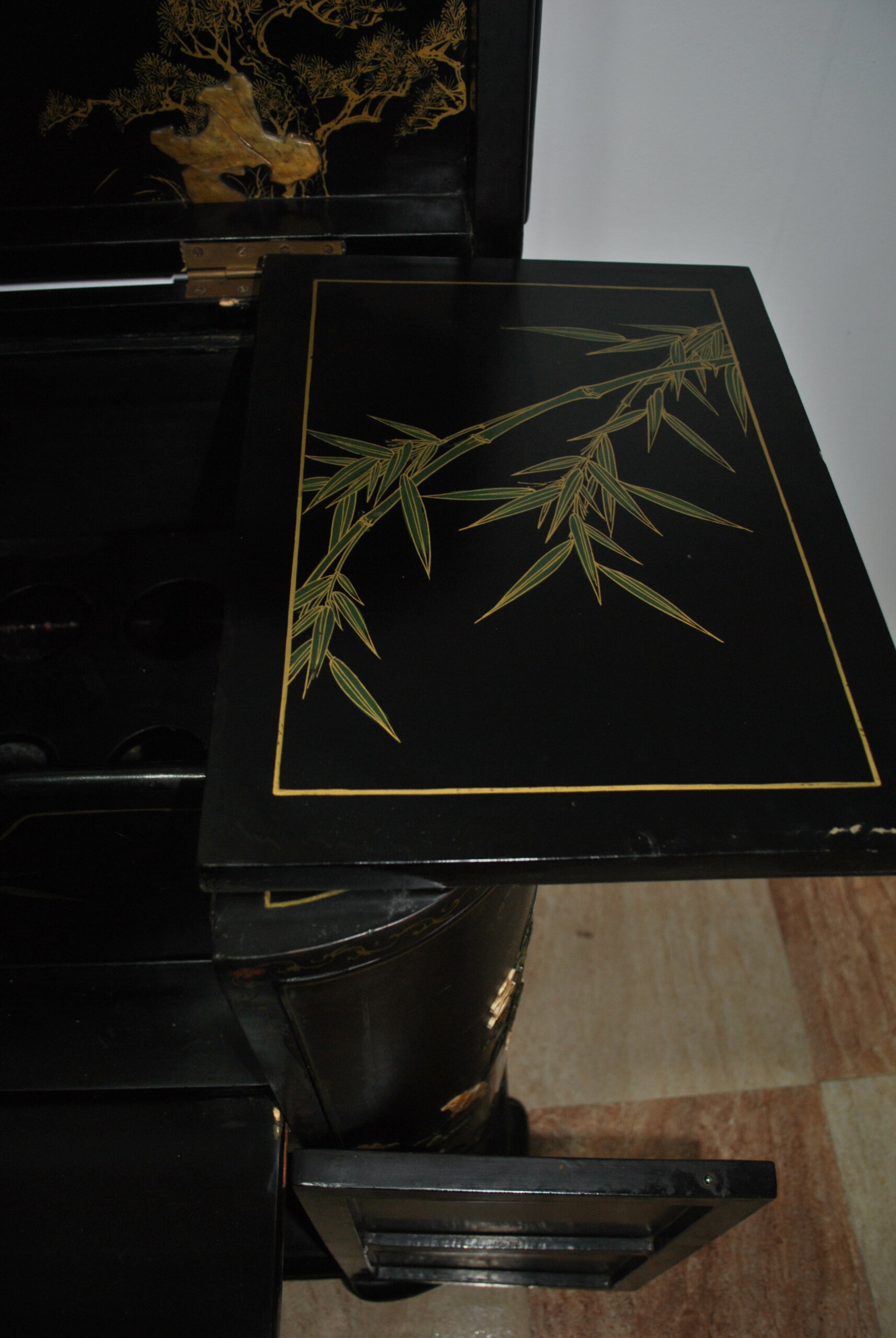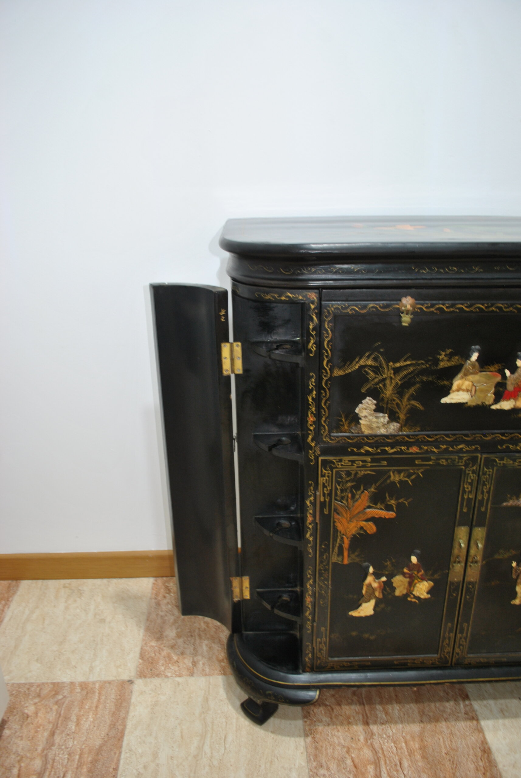 El interior también está decorado con escenas orientales, lo que refleja la calidad y el cuidado en cada detalle, incluso en las partes menos visibles. Incluye espacio para botellas y accesorios, convirtiéndolo en una pieza tanto decorativa como funcional.