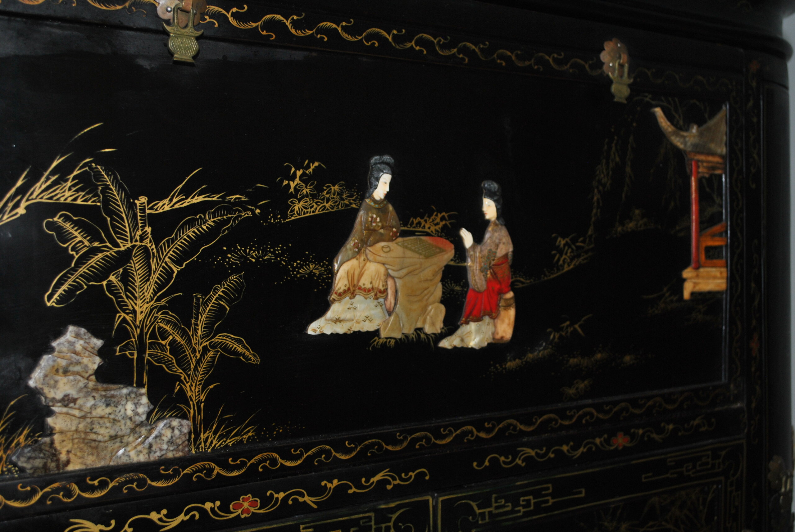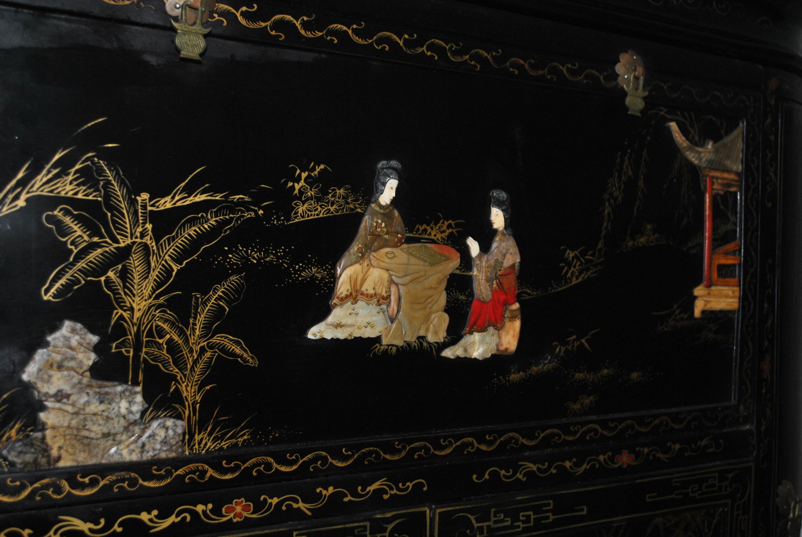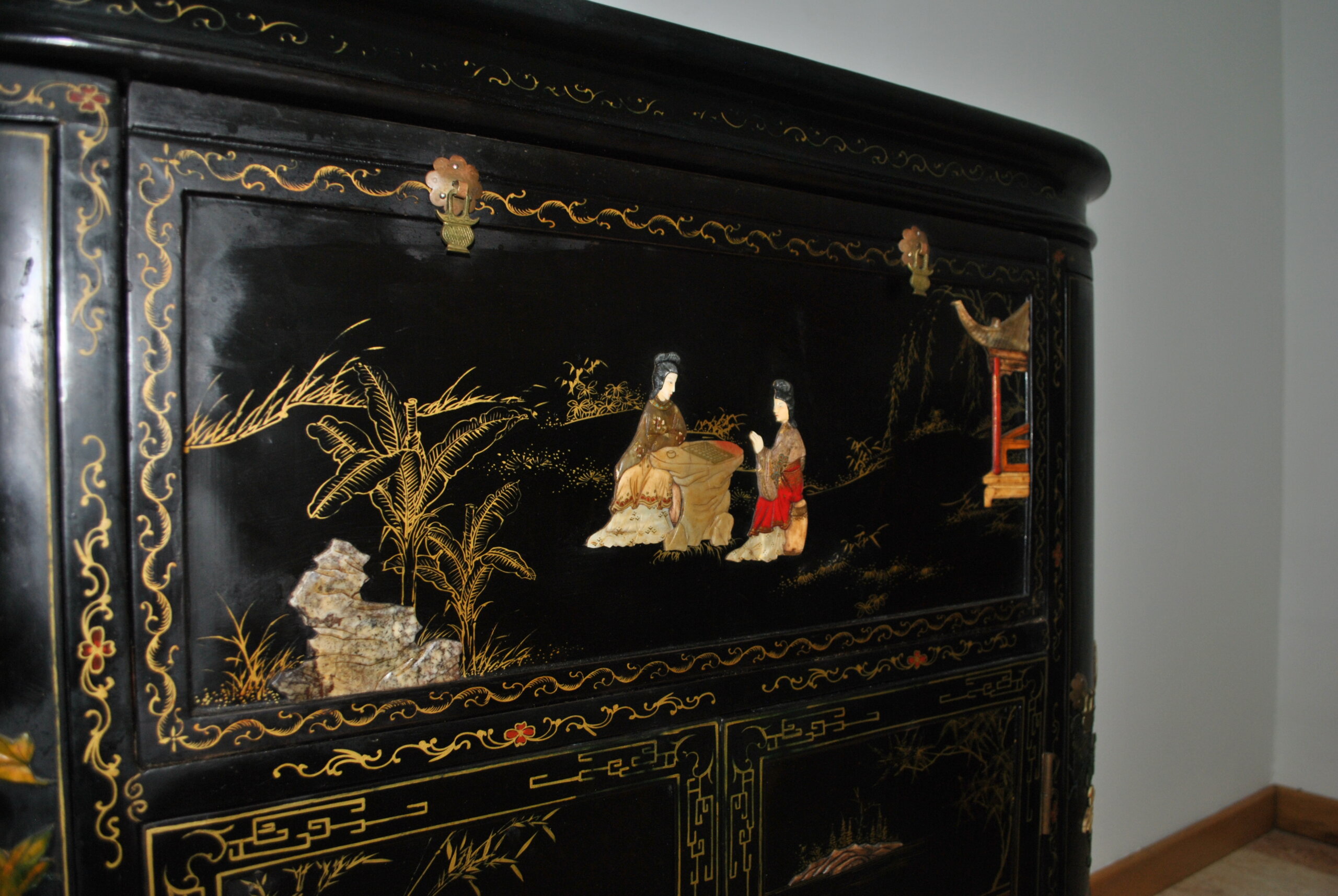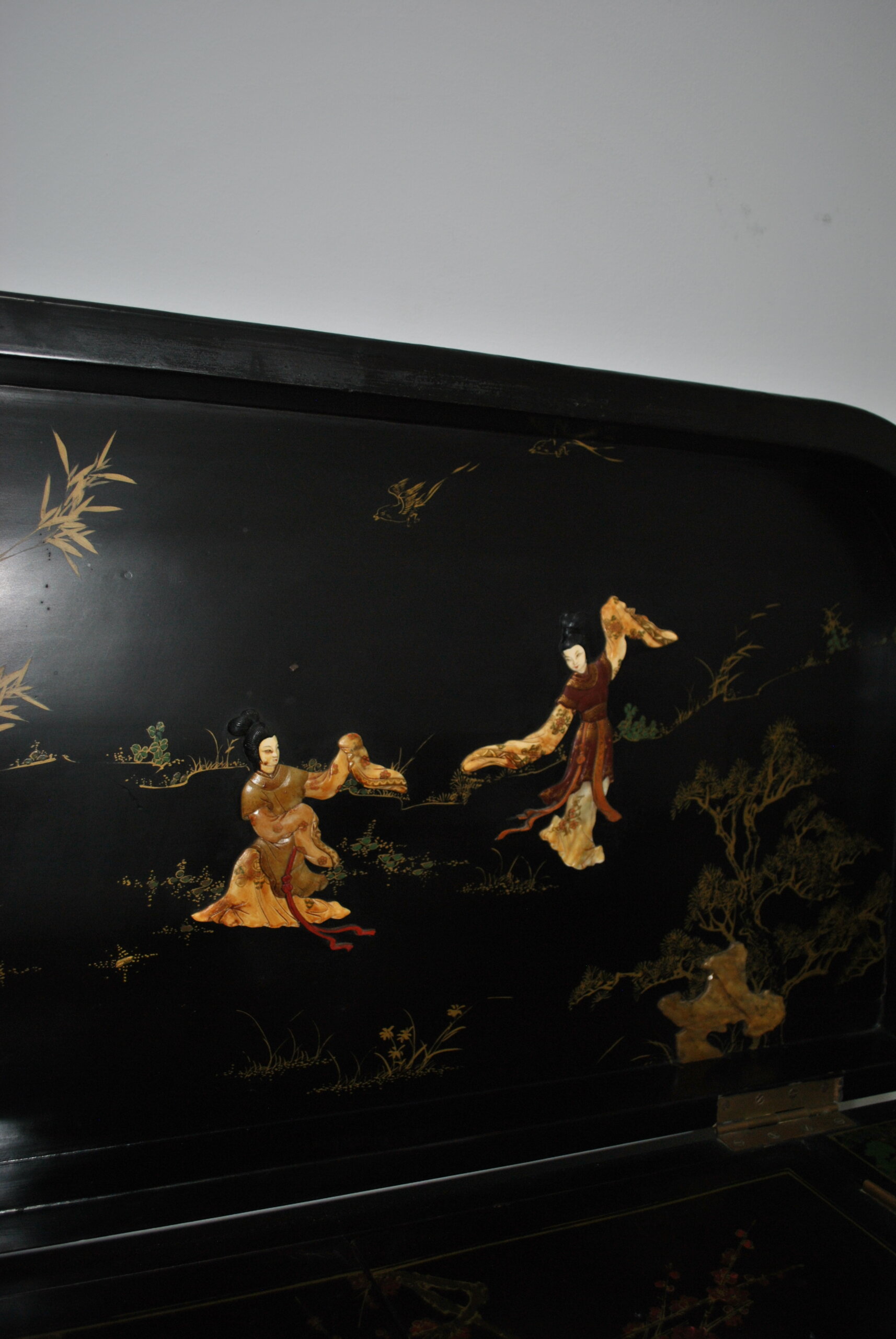 El interior también está decorado con escenas orientales, lo que refleja la calidad y el cuidado en cada detalle, incluso en las partes menos visibles. Incluye espacio para botellas y accesorios, convirtiéndolo en una pieza tanto decorativa como funcional.