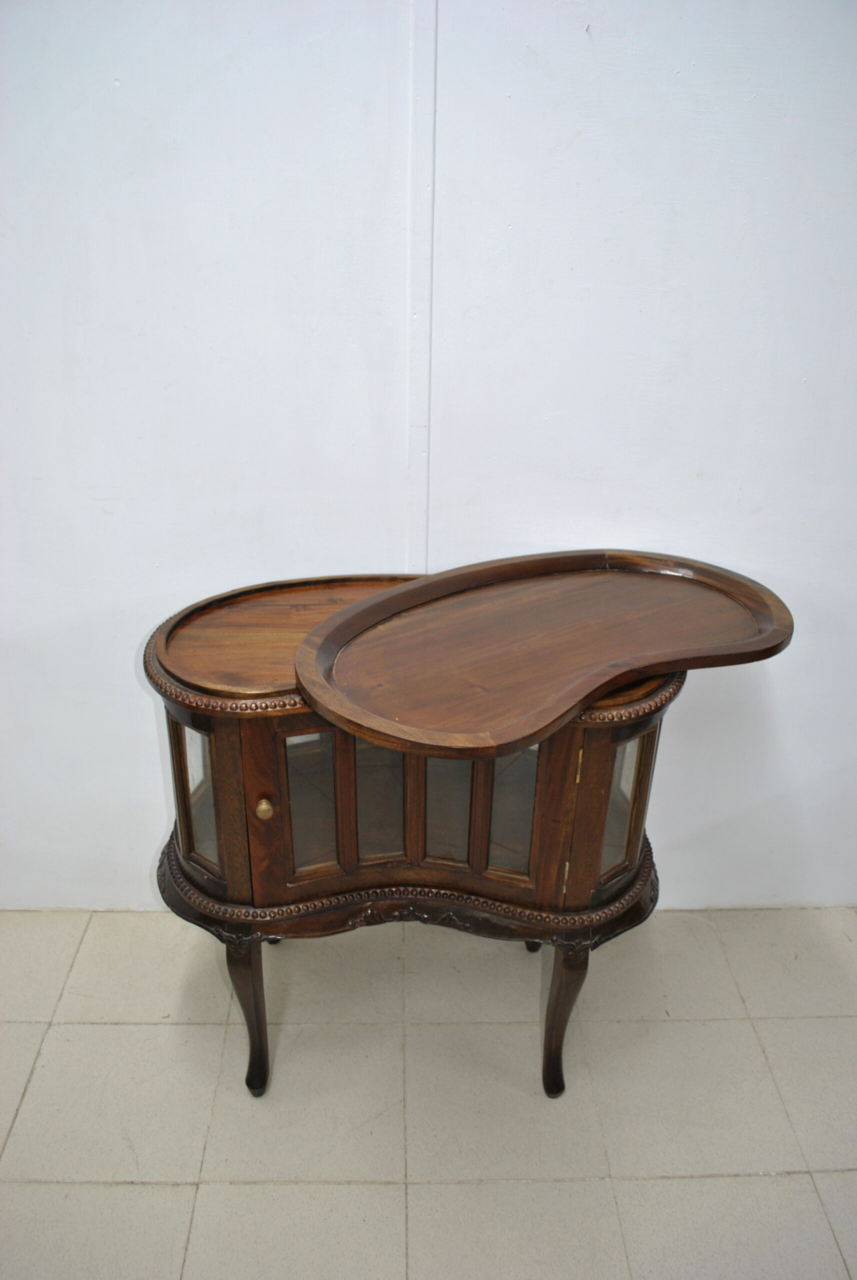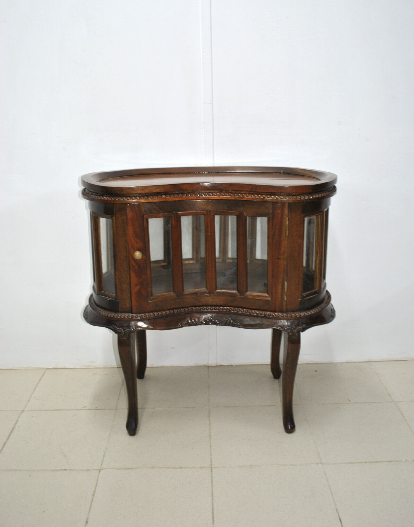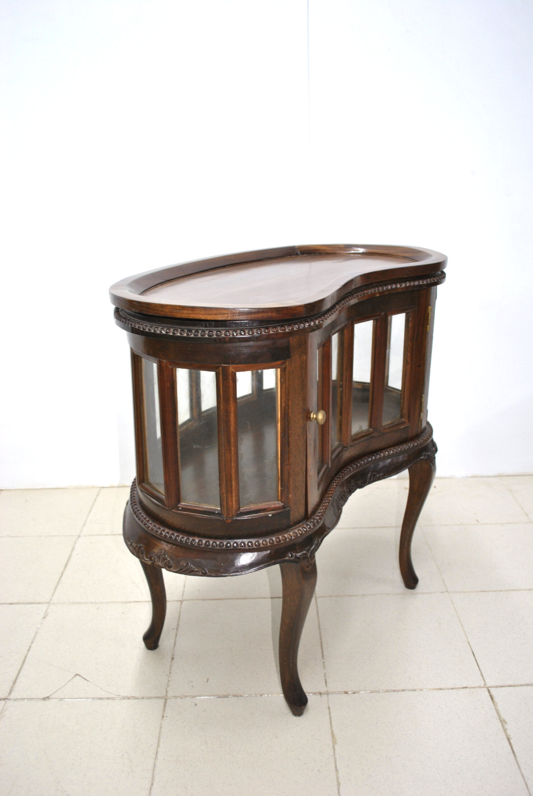 REF: 12407 – Precioso mueble bar antiguo tipo licorera, hecho en madera con un diseño muy elegante y clásico. Cuenta con vitrina de cristal en el frontal y lateral, ideal para guardar y lucir botellas, copas o licores.