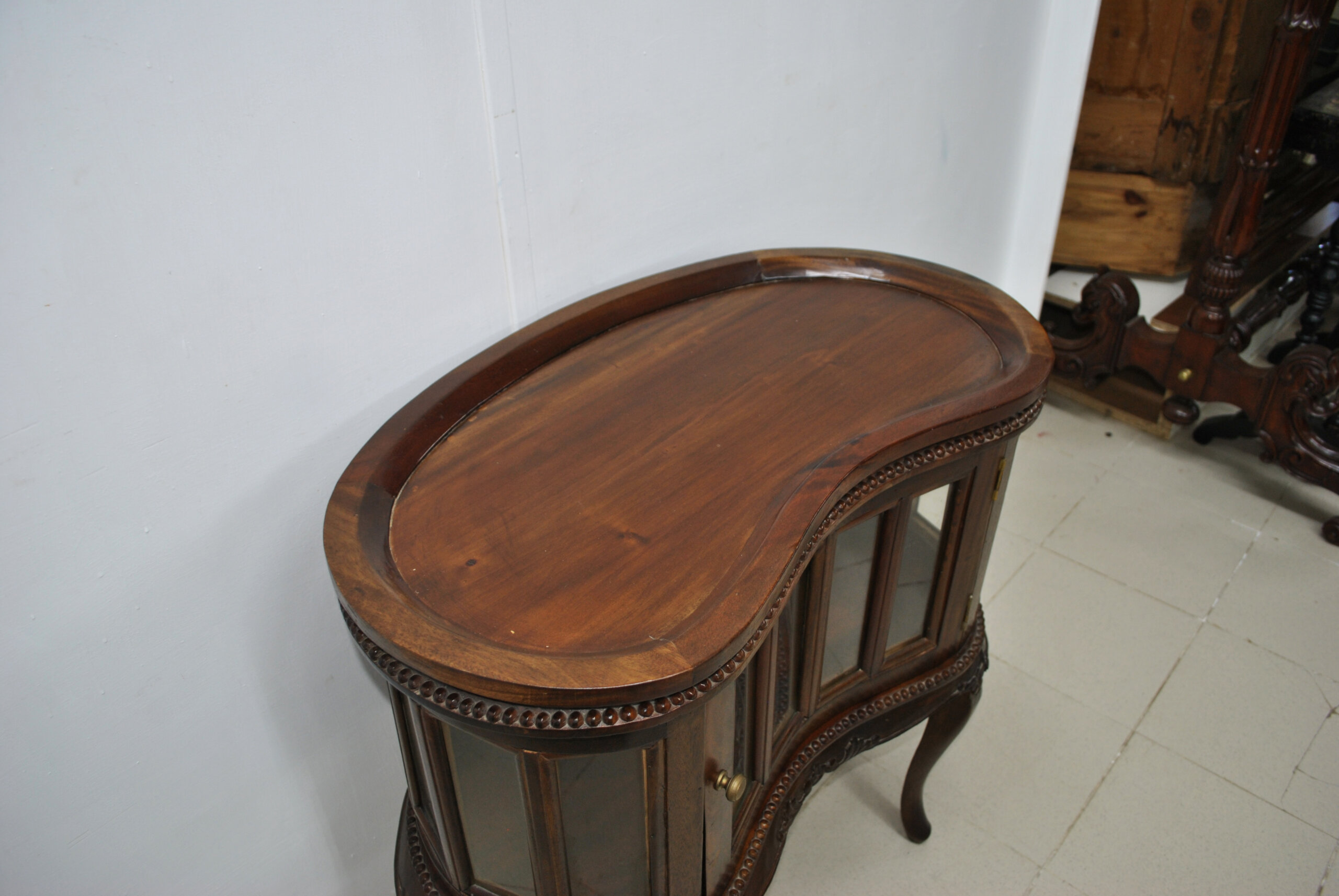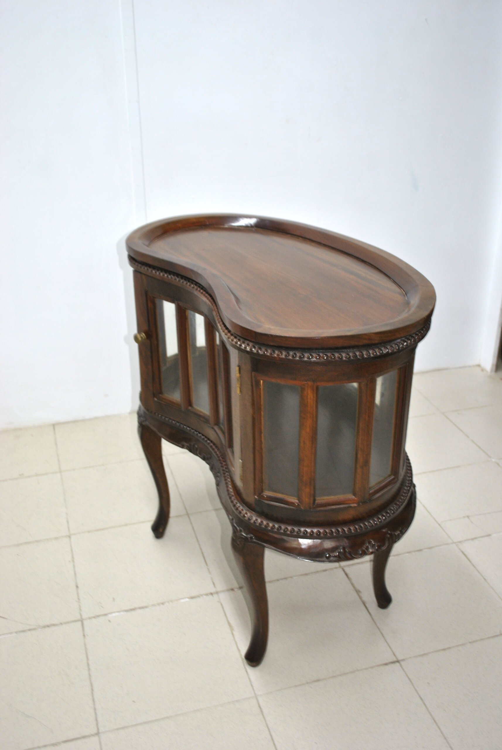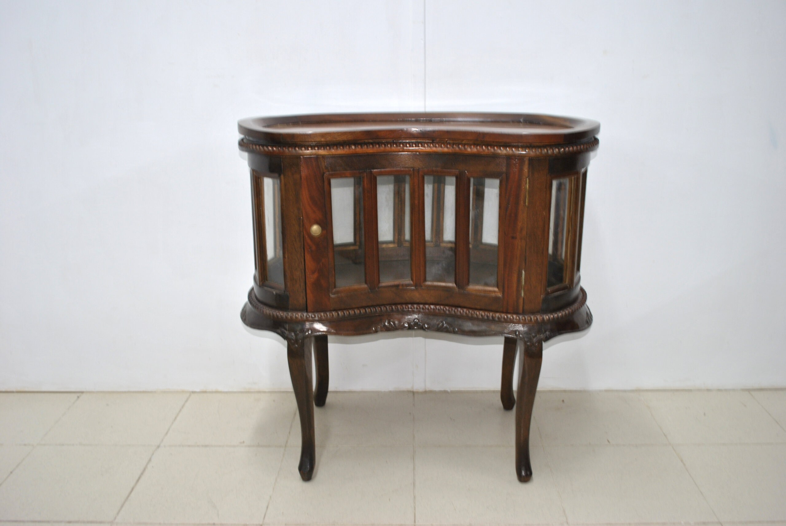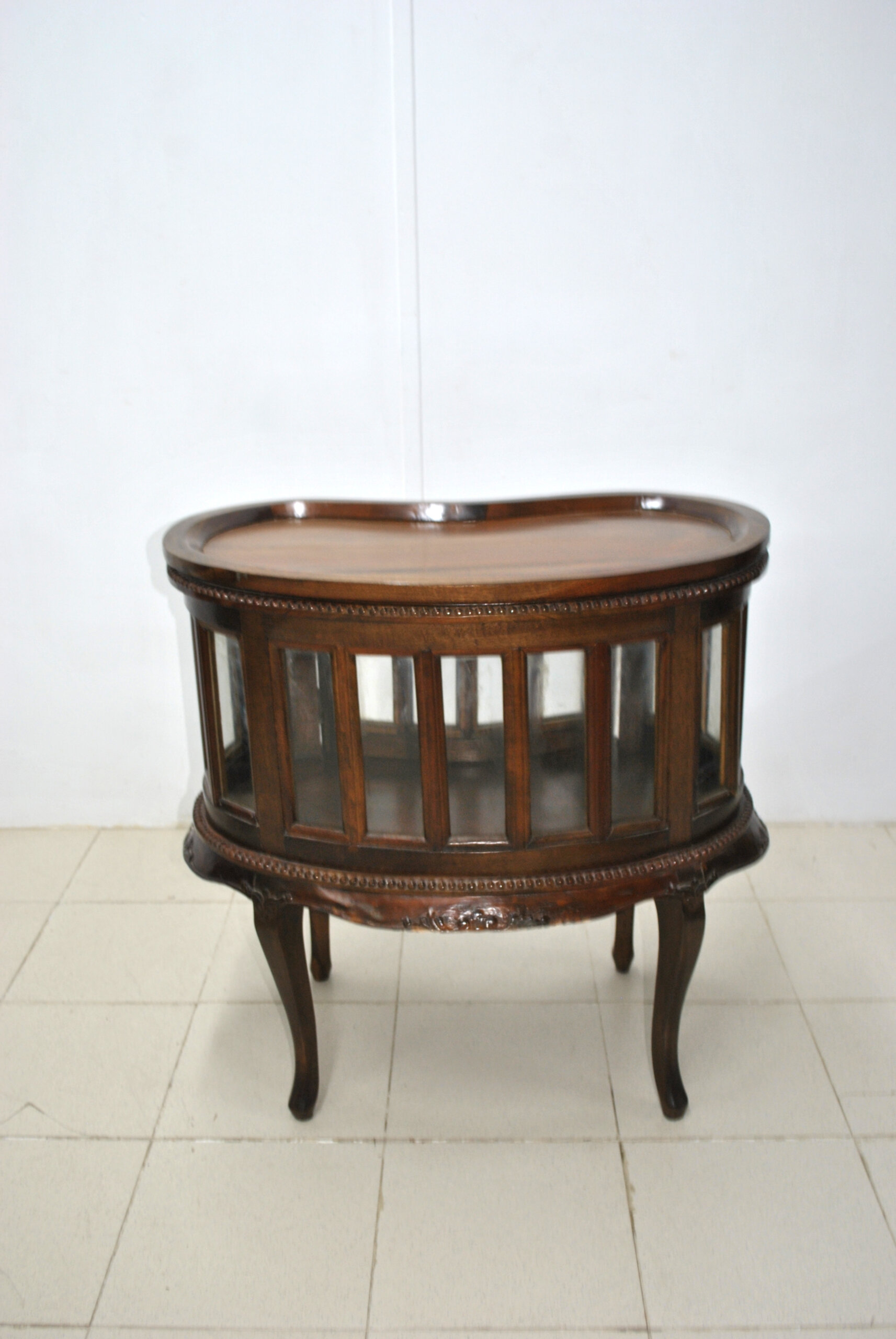 REF: 12407 – Precioso mueble bar antiguo tipo licorera, hecho en madera con un diseño muy elegante y clásico. Cuenta con vitrina de cristal en el frontal y lateral, ideal para guardar y lucir botellas, copas o licores.