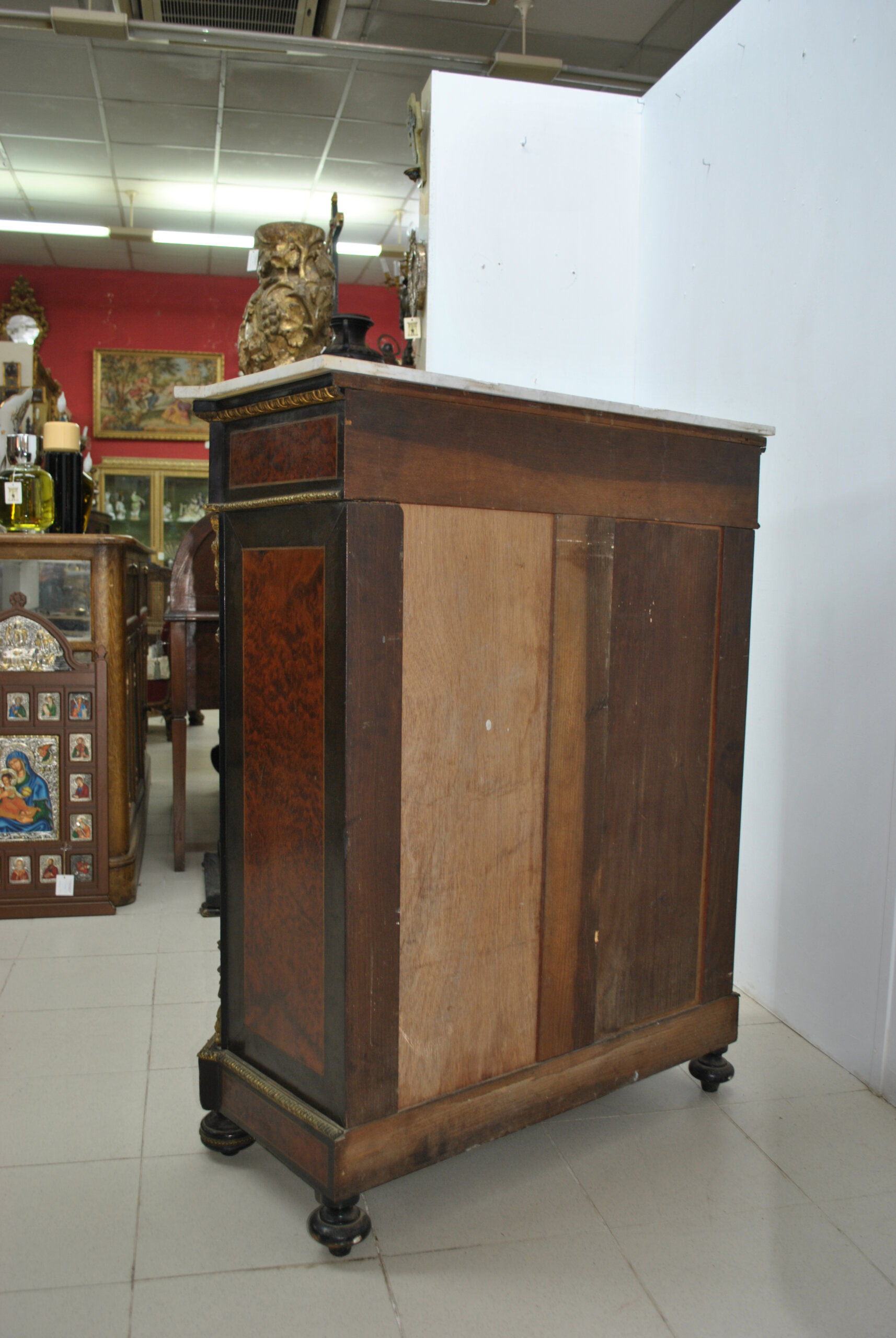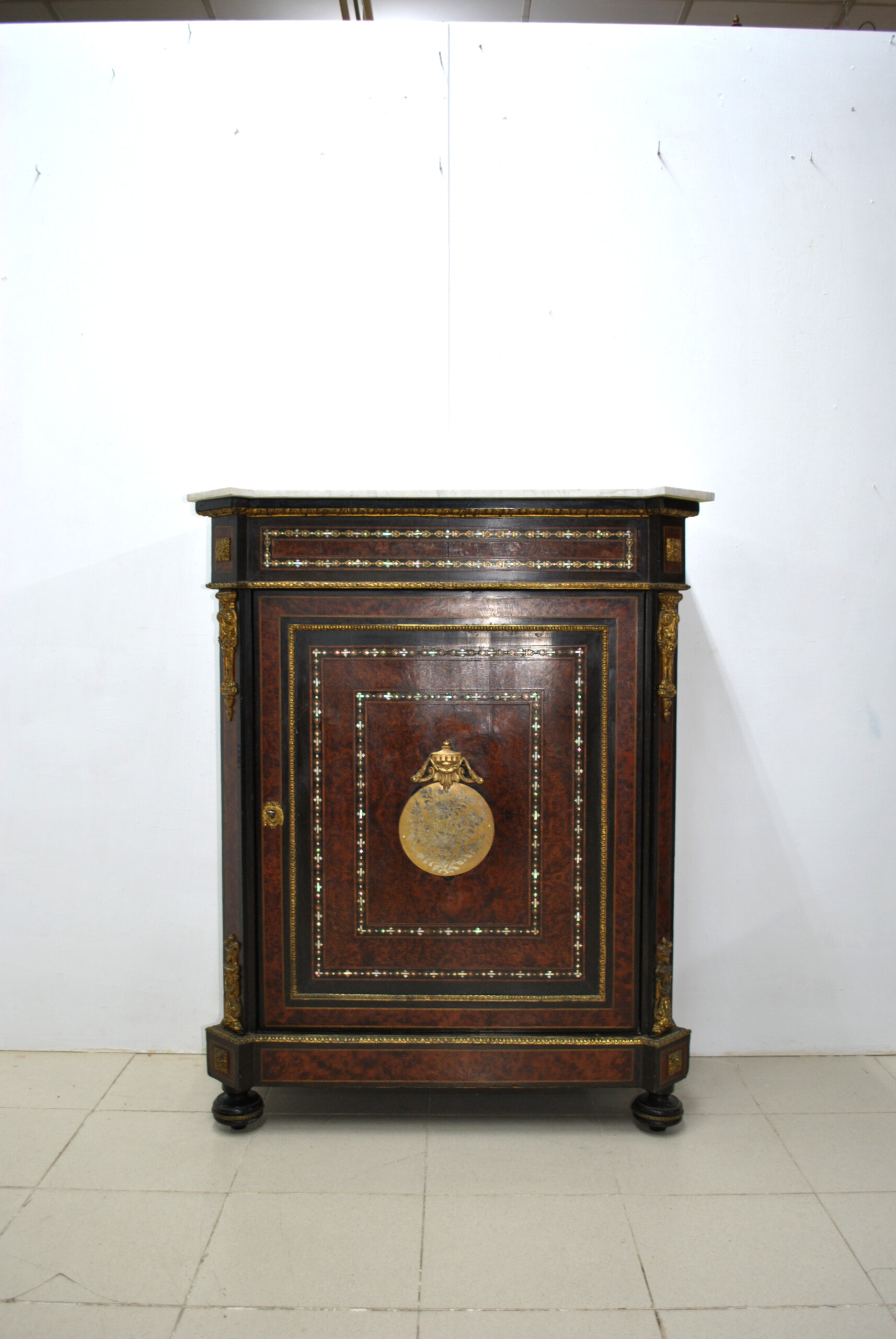 El mueble presenta una estructura robusta en madera noble, decorada con una espectacular chapa de raíz de nogal, que crea un dibujo natural único y muy llamativo. Está finamente ornamentado con marquetería e incrustaciones geométricas que recorren todo el frontal, aportando sofisticación y un acabado artesanal de alta calidad.