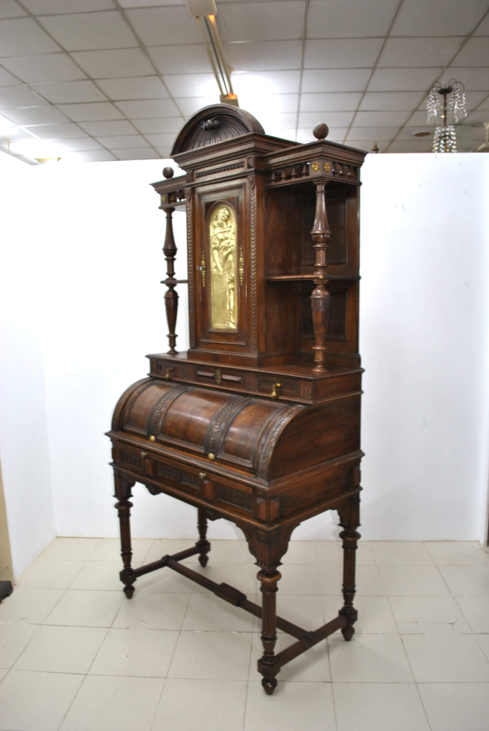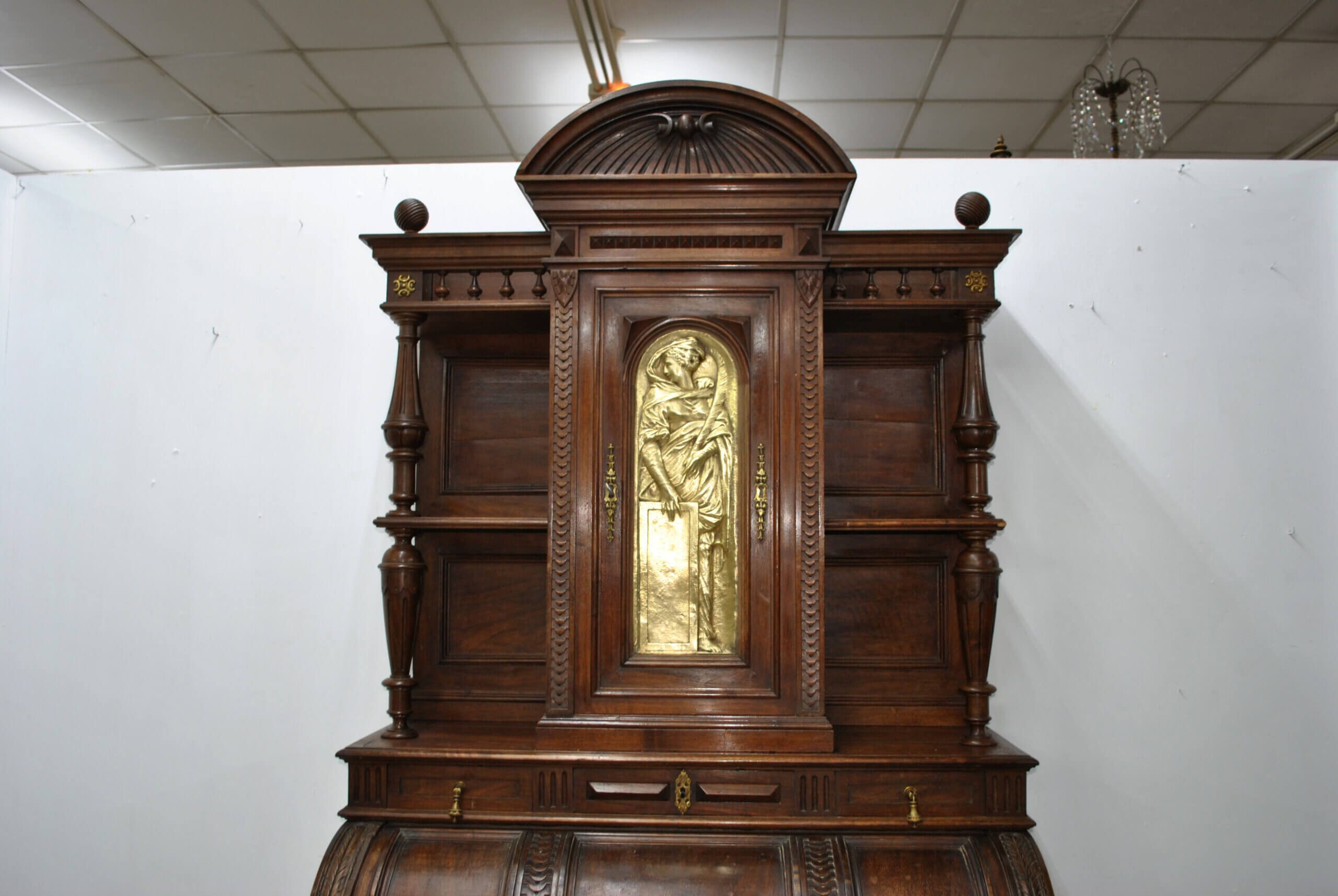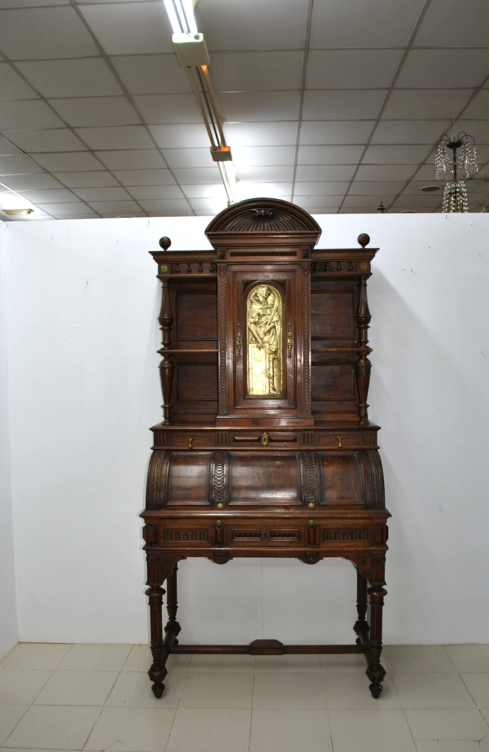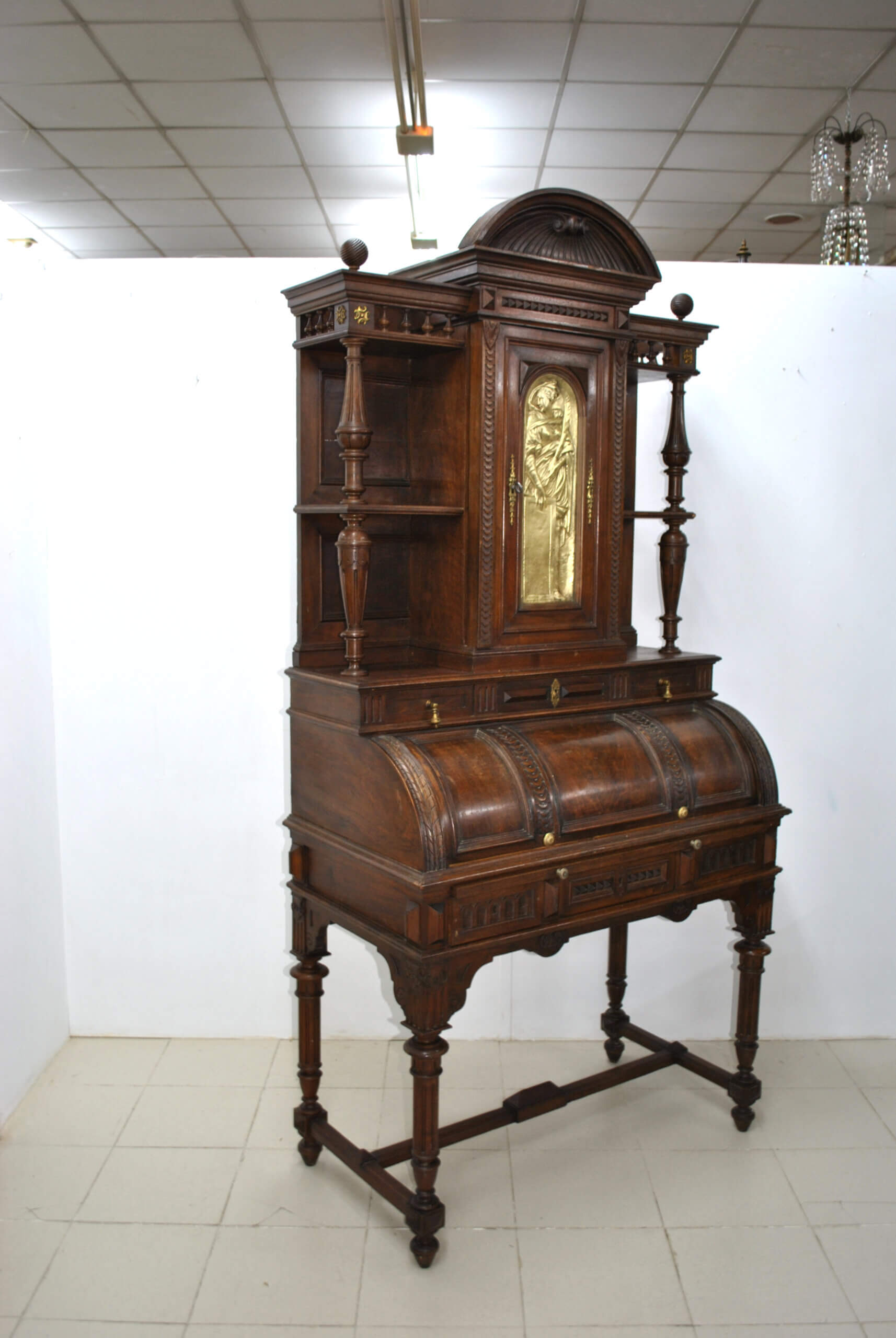 REF: PA-329 : Precioso mueble escritorio antiguo de gran presencia, realizado en madera maciza con una cuidada talla artesanal y elegantes detalles de estilo renacentista.