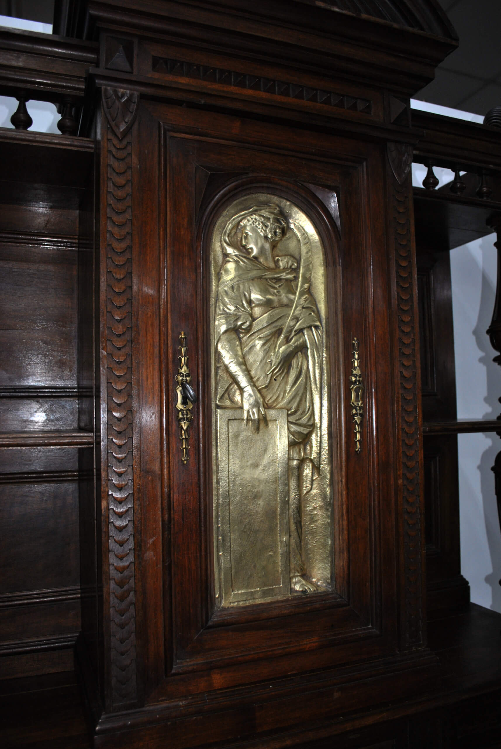 Destaca su puerta central con espectacular relieve dorado en alto relieve que representa una figura clásica, aportando un toque único, decorativo y muy exclusivo. El mueble cuenta con estanterías laterales, interior amplio con compartimentos, escritorio abatible funcional y cajones inferiores, combinando perfectamente estética y utilidad. Sus patas altas y proporciones estilizadas lo convierten en una pieza ideal para salón, despacho o negocio, aportando carácter y distinción.