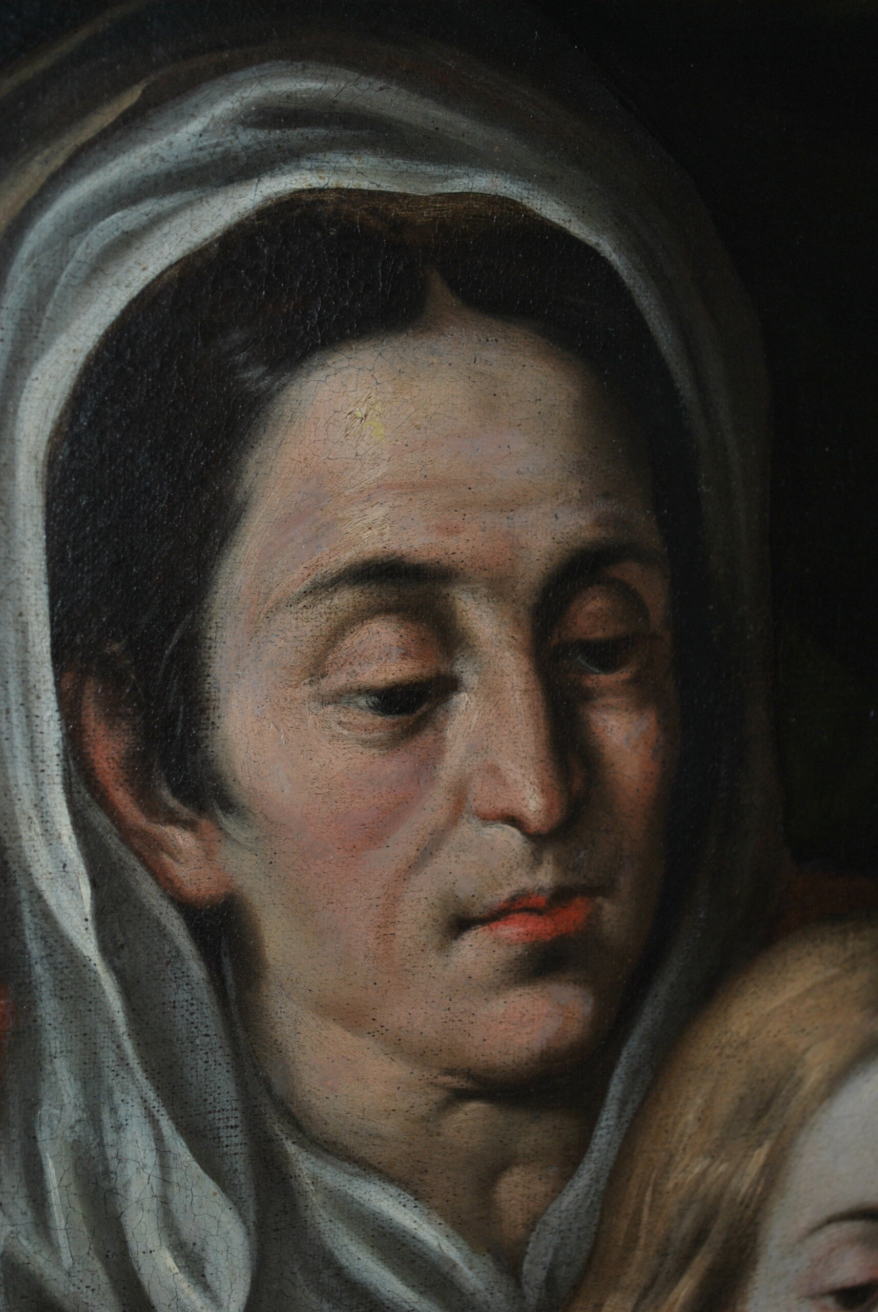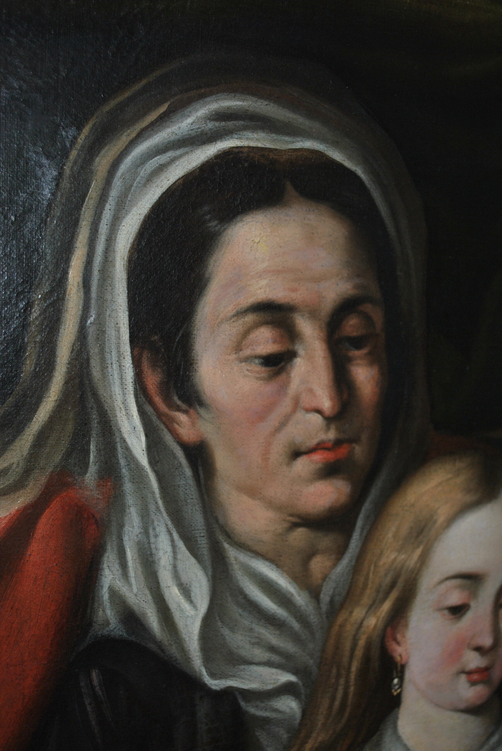 La obra destaca por su cuidada composición, con un tratamiento delicado de los rostros, la expresividad de las figuras y un bello juego de luces y sombras. El intenso manto en tonos rojizos aporta fuerza visual, contrastando con el fondo oscuro de gran profundidad.