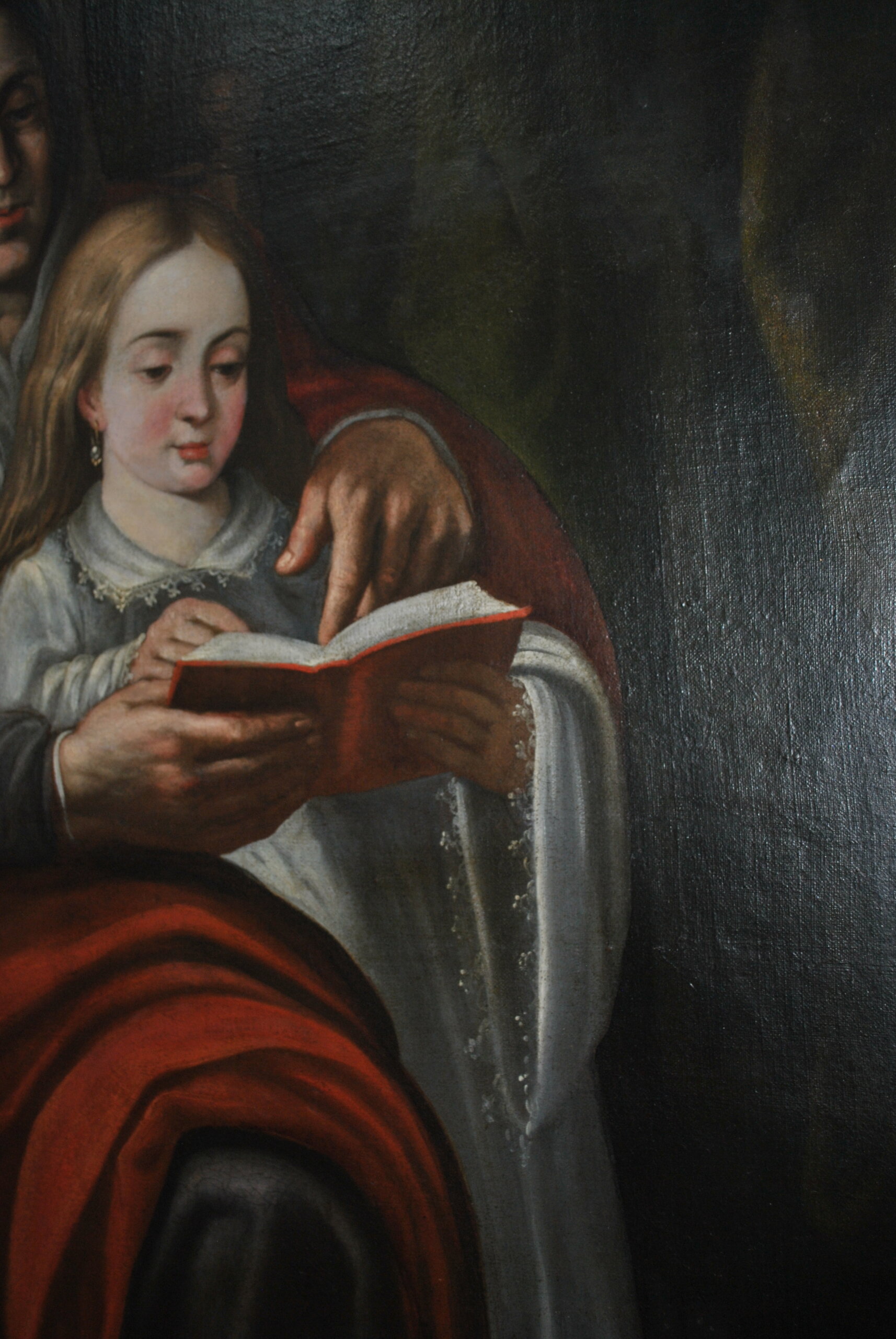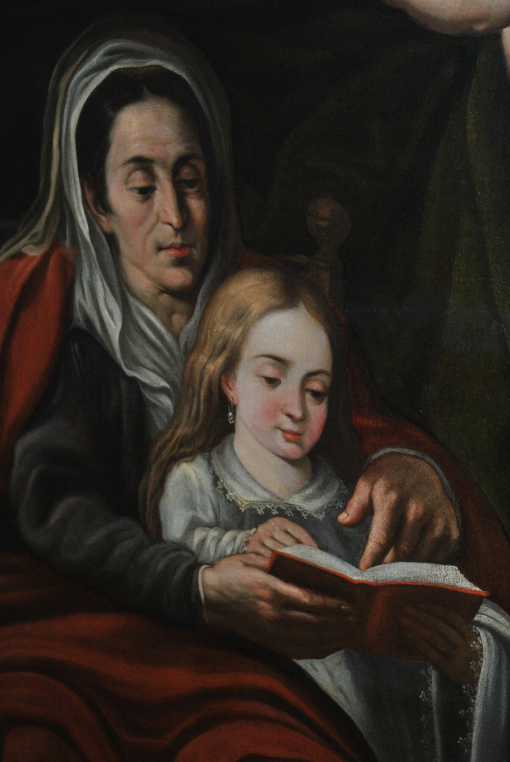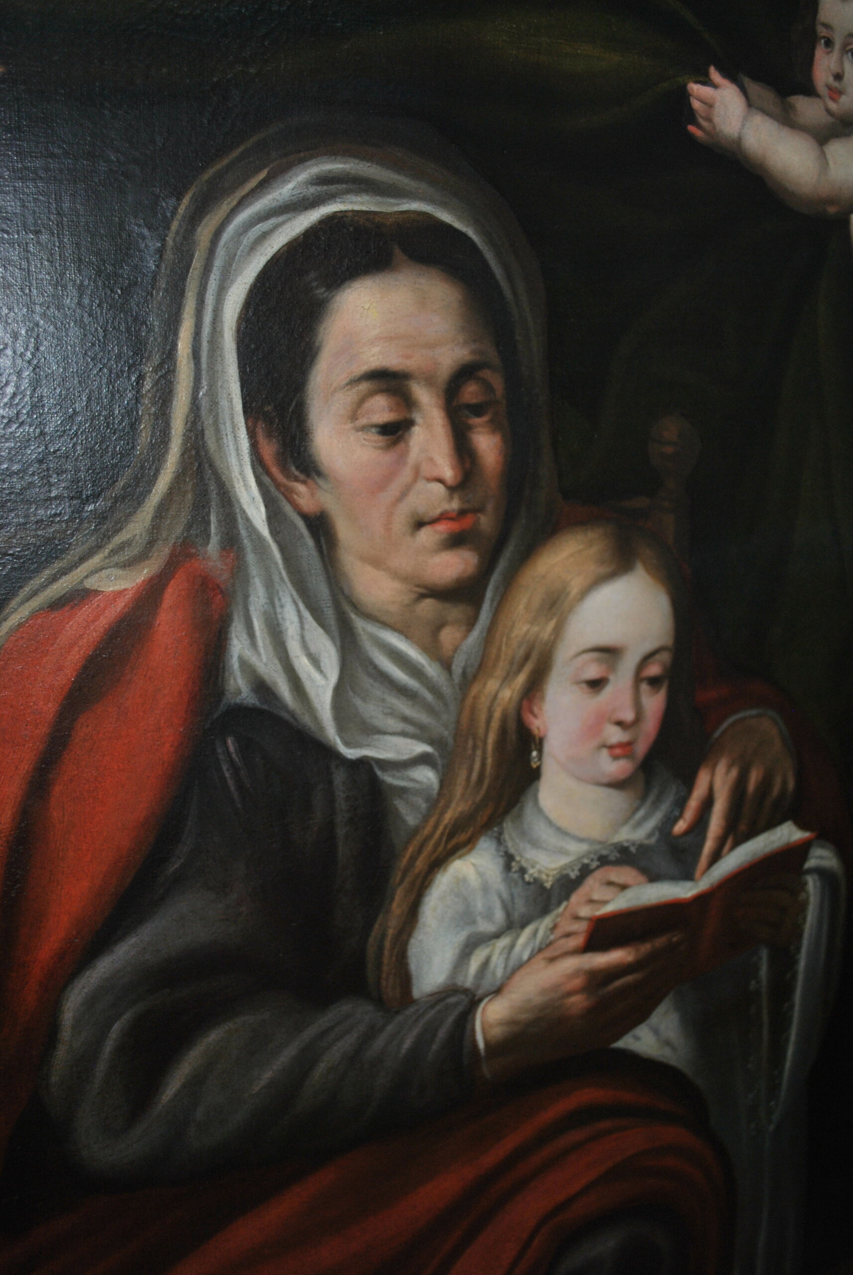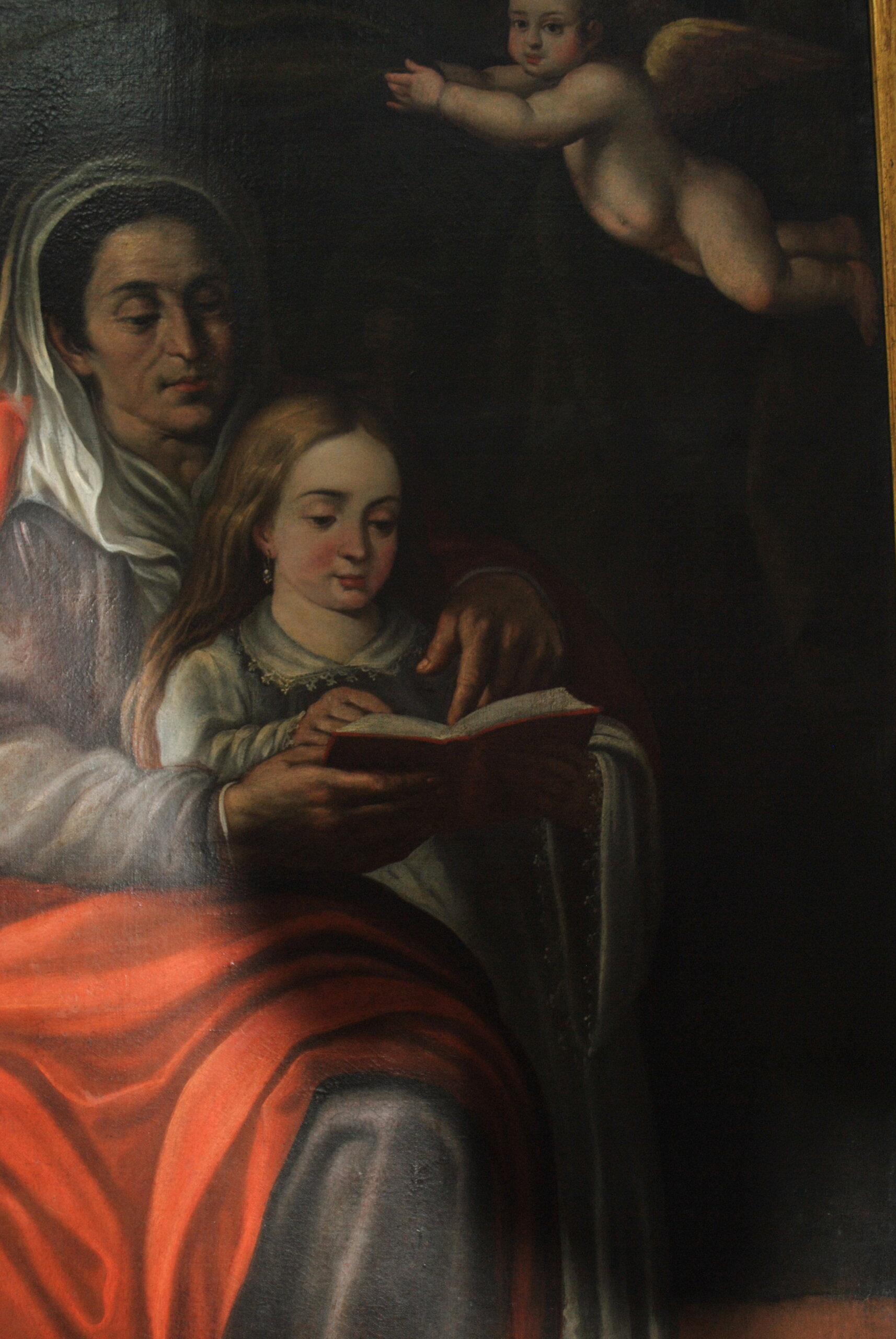 REF: PA-323 : Magnífica pintura al óleo sobre lienzo de temática religiosa que representa a Santa Ana enseñando a leer a la Virgen María en su infancia, acompañadas por dos angelitos en actitud celestial. Una escena clásica cargada de simbolismo, ternura y espiritualidad, muy apreciada en el arte devocional.