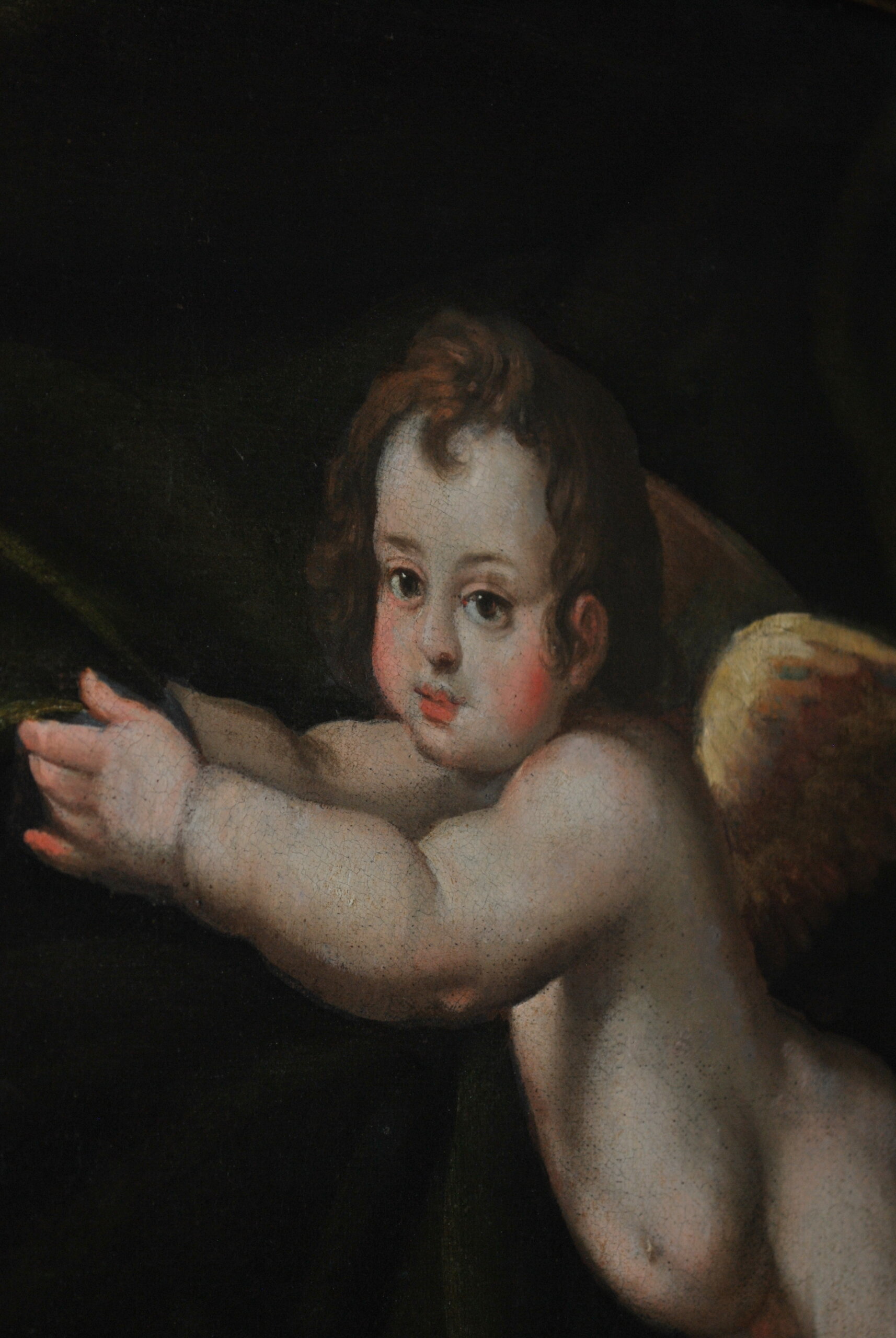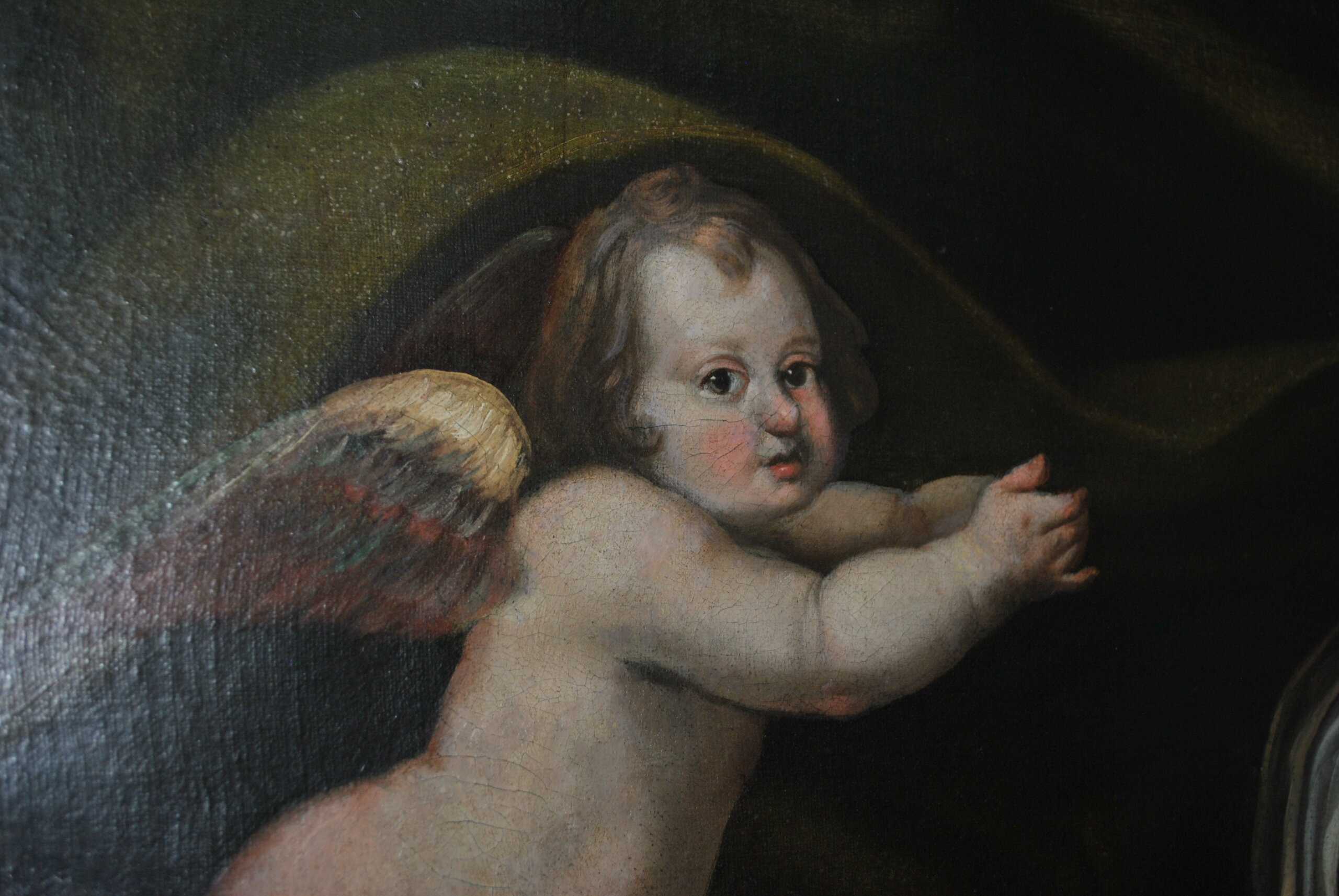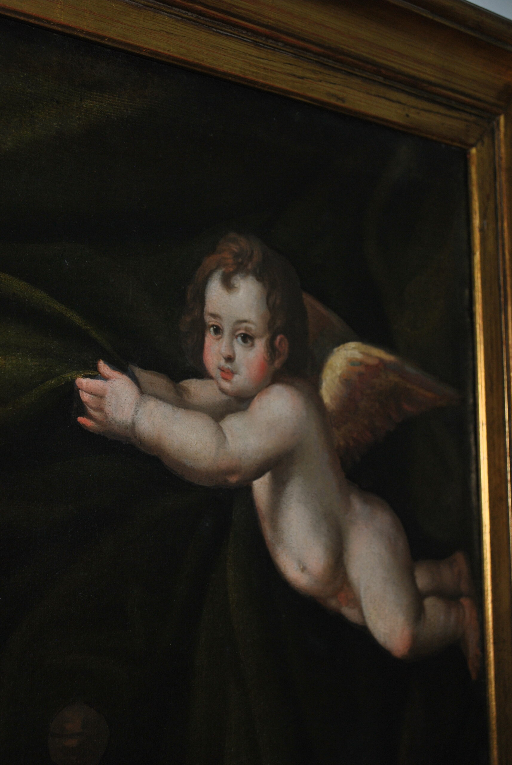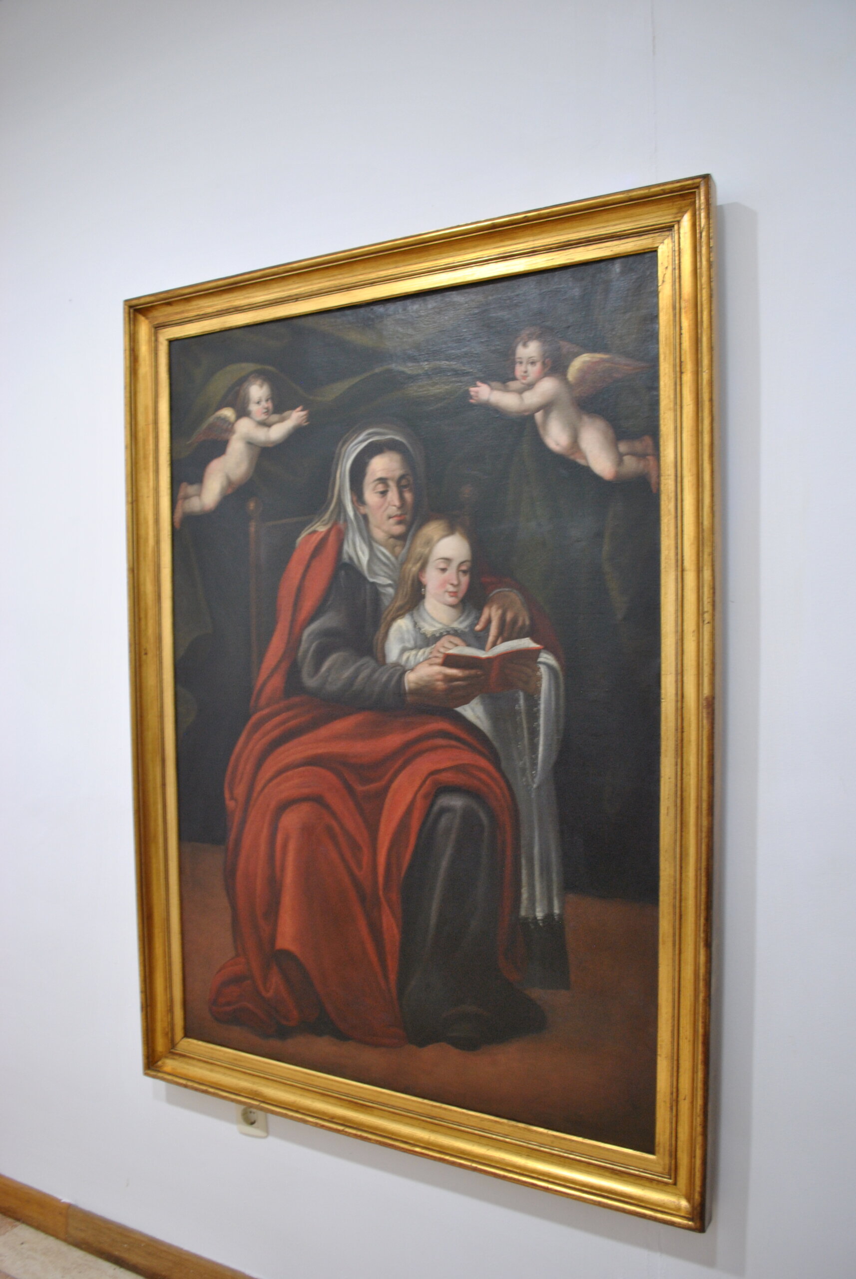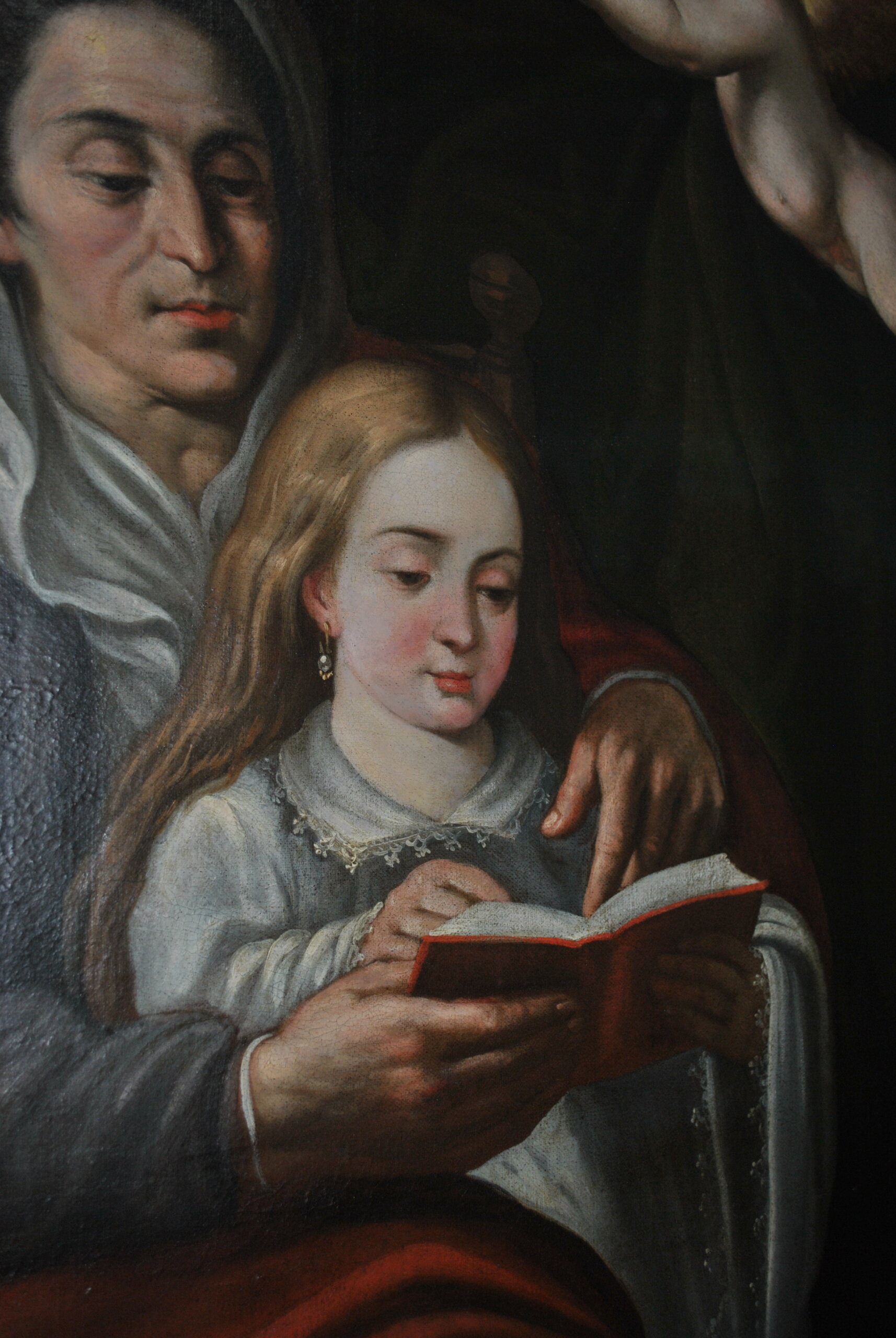 REF: PA-323 : Magnífica pintura al óleo sobre lienzo de temática religiosa que representa a Santa Ana enseñando a leer a la Virgen María en su infancia, acompañadas por dos angelitos en actitud celestial. Una escena clásica cargada de simbolismo, ternura y espiritualidad, muy apreciada en el arte devocional.