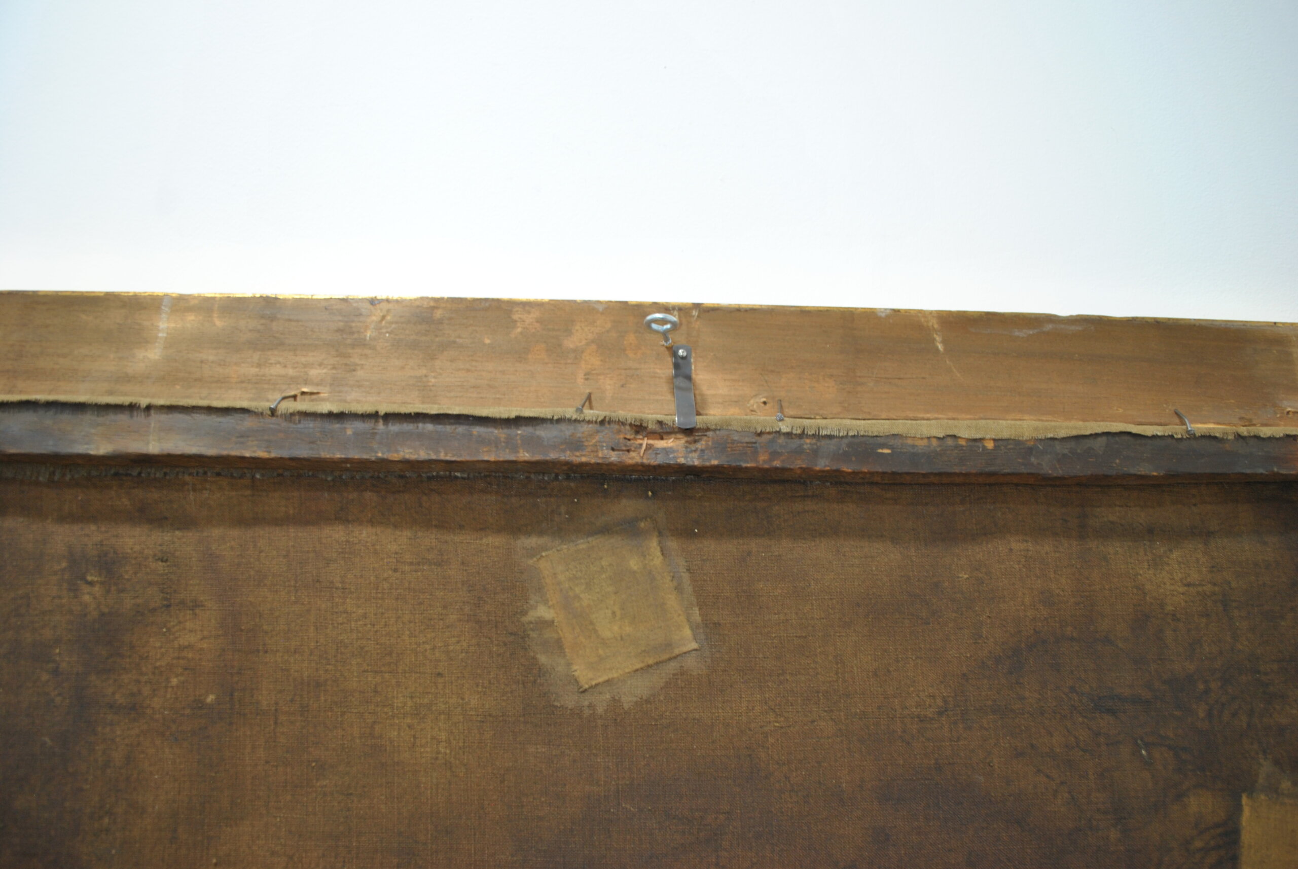 En la parte trasera se aprecia un bastidor antiguo con señales propias del paso del tiempo, lo que refuerza su autenticidad.