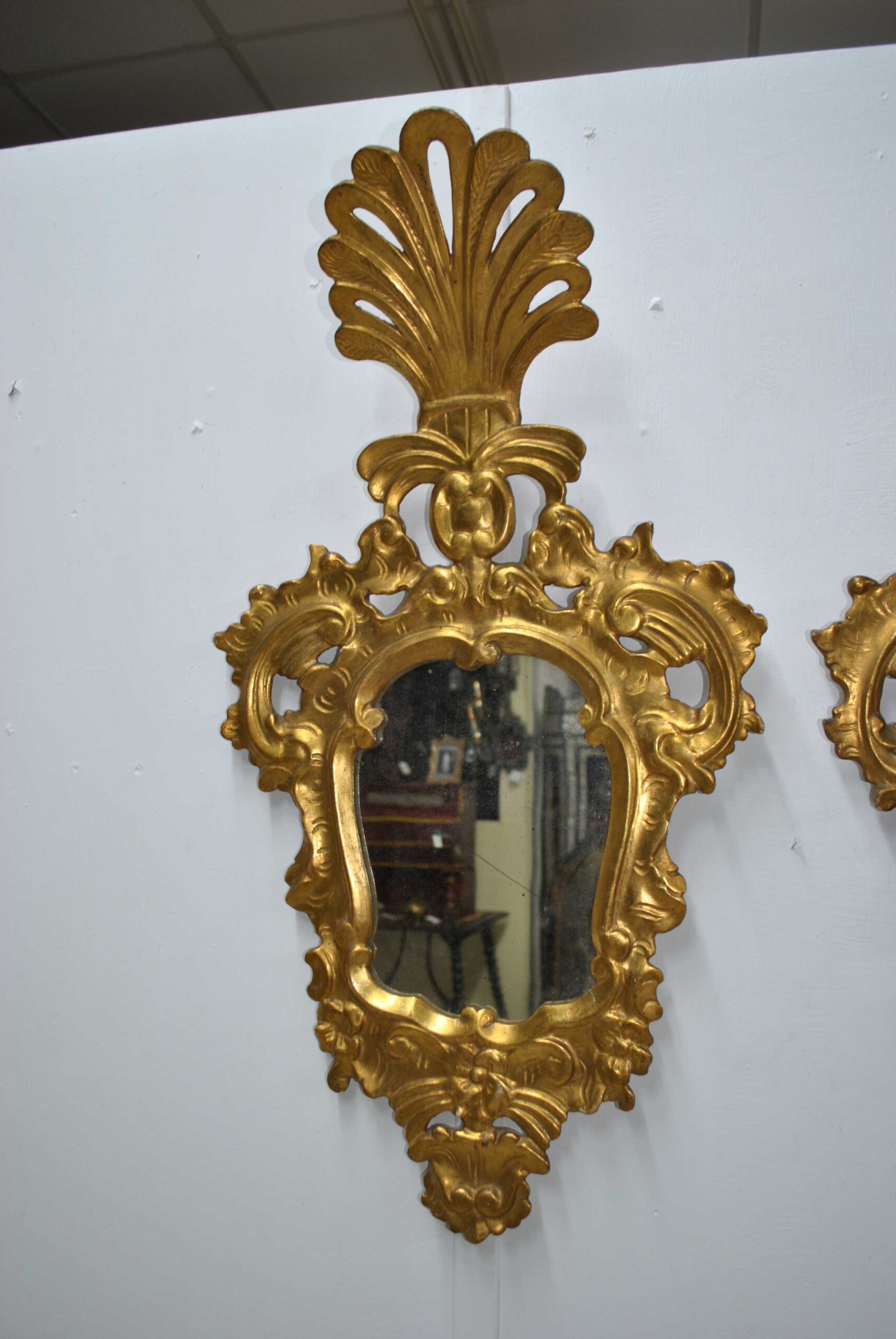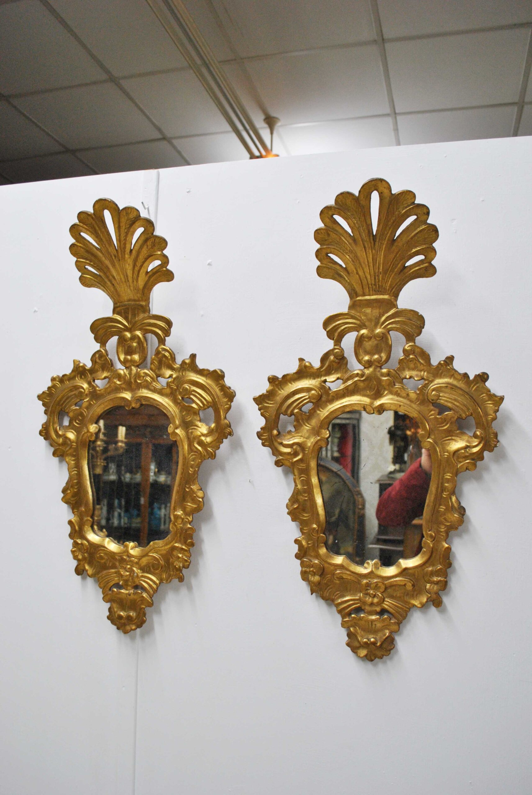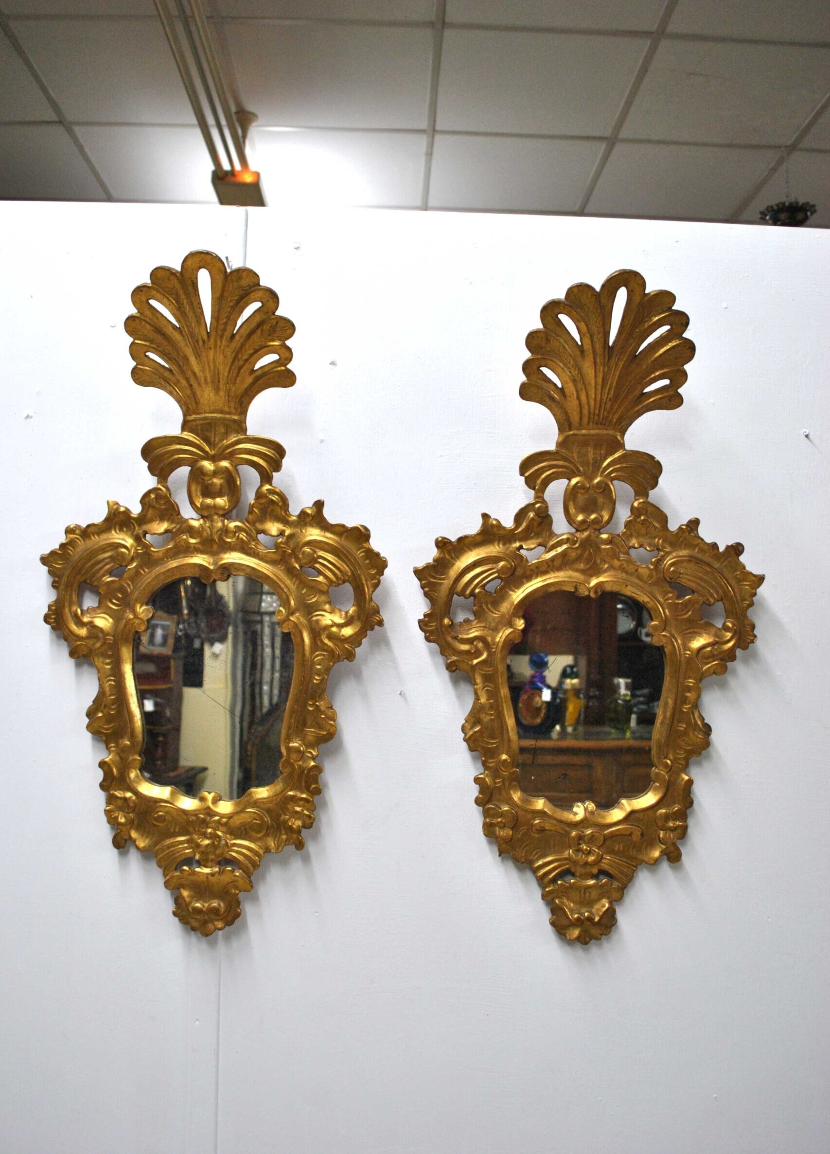 REF: 001 – Pareja de espejos antiguos de madera tallada y dorada, con elegante diseño de inspiración barroca. Presentan marcos ricamente decorados con roleos, hojas y un remate superior en forma de abanico, que les aporta gran presencia decorativa.