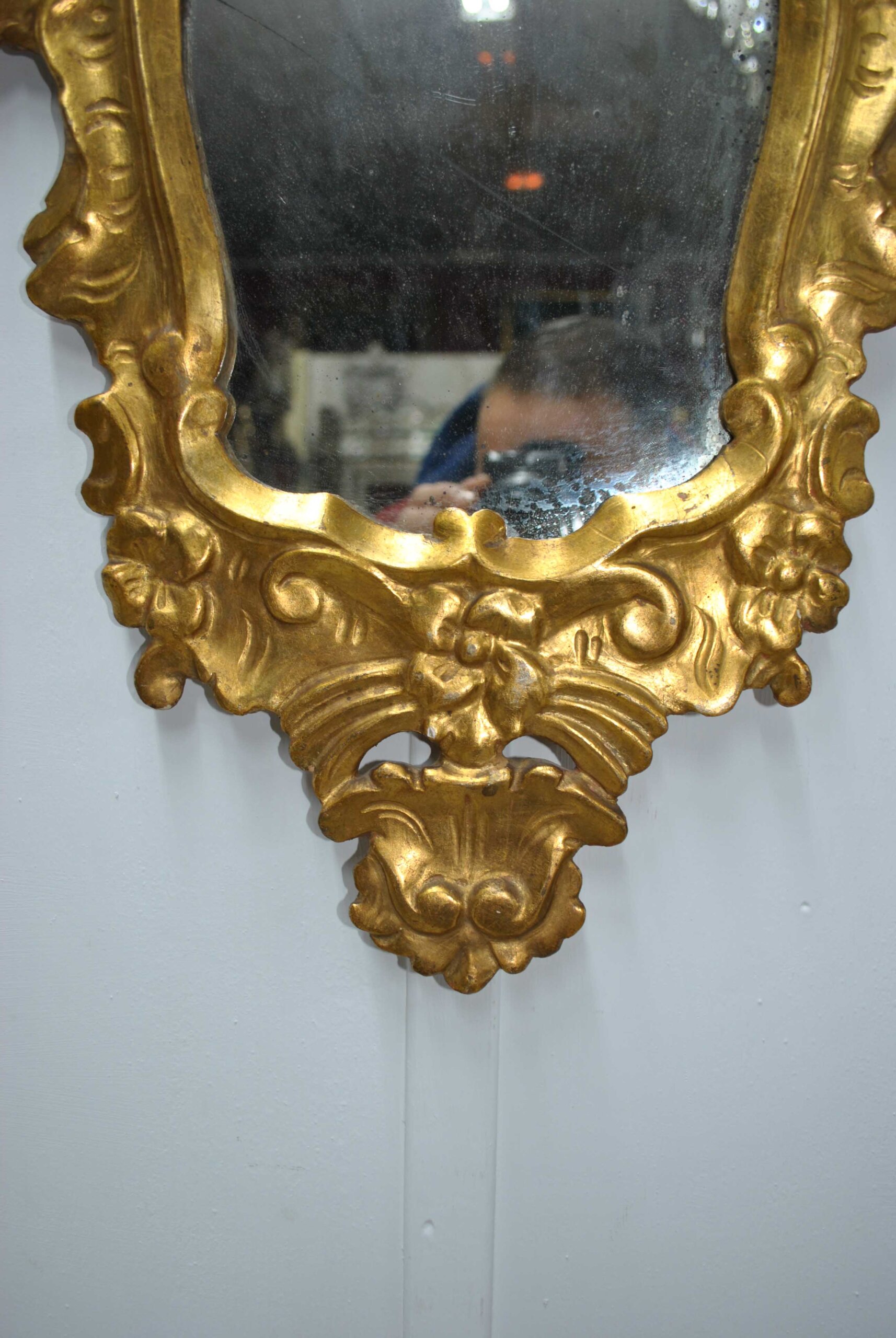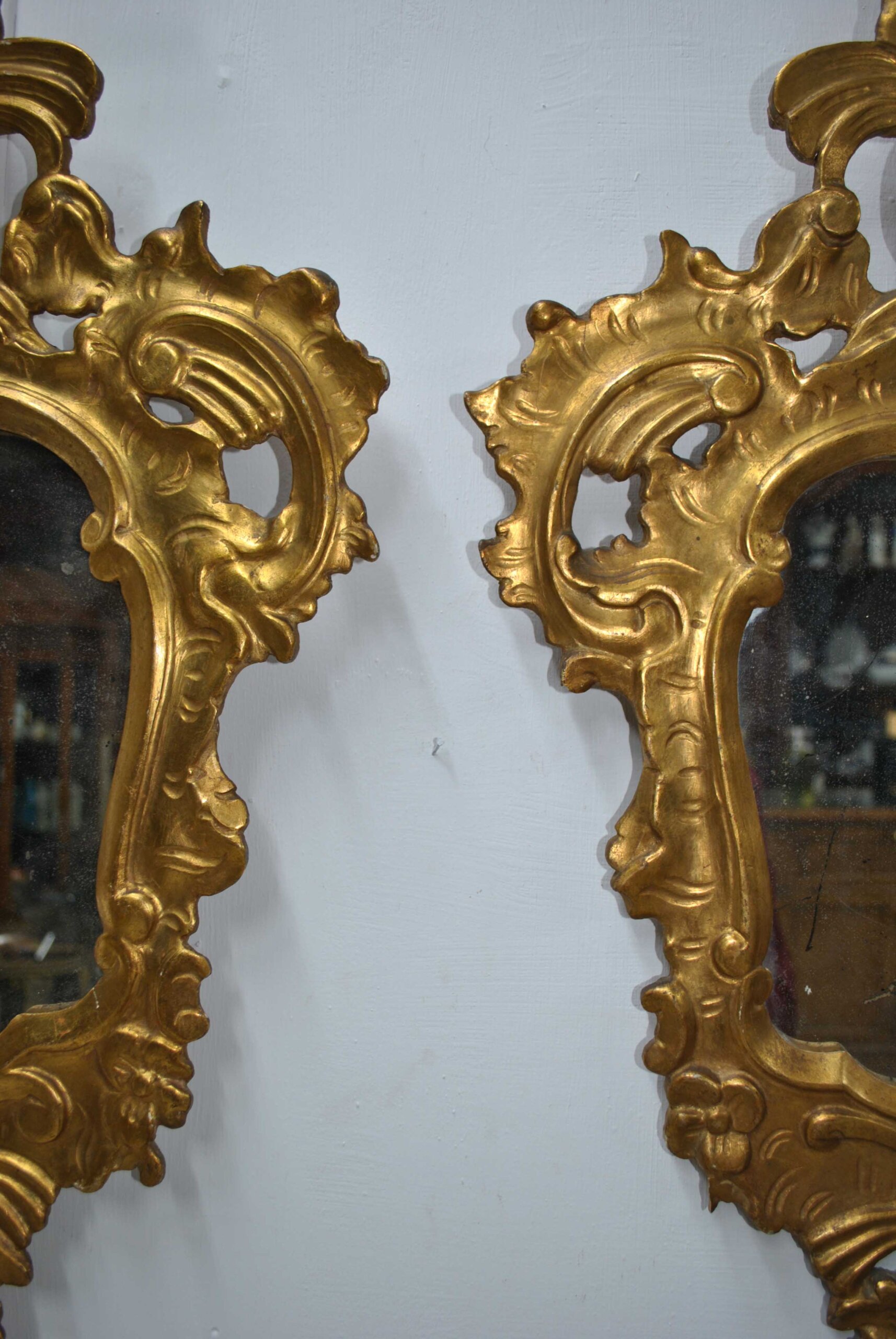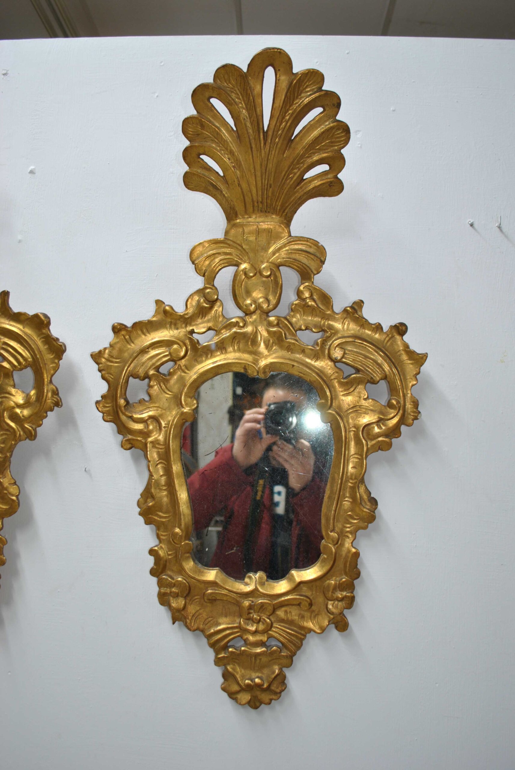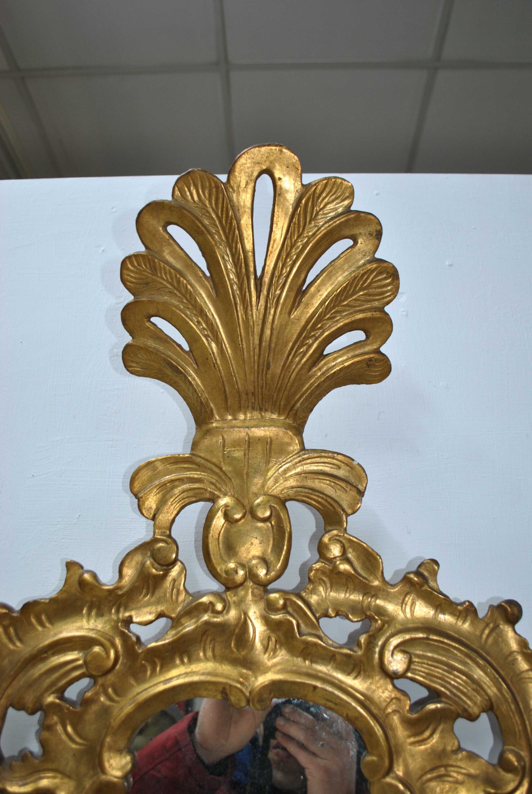 REF: 001 – Pareja de espejos antiguos de madera tallada y dorada, con elegante diseño de inspiración barroca. Presentan marcos ricamente decorados con roleos, hojas y un remate superior en forma de abanico, que les aporta gran presencia decorativa.