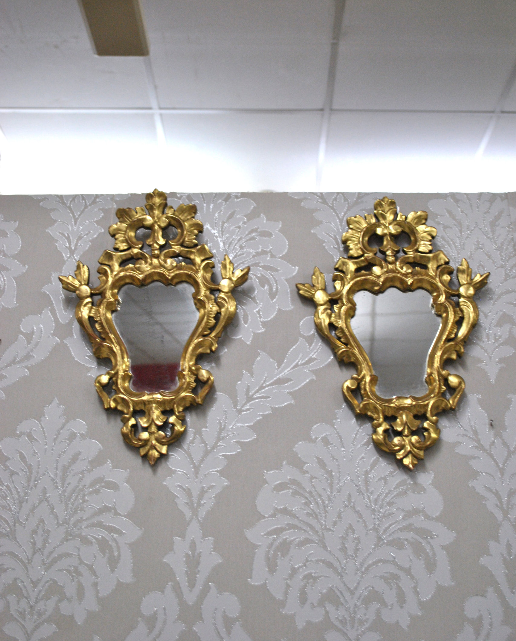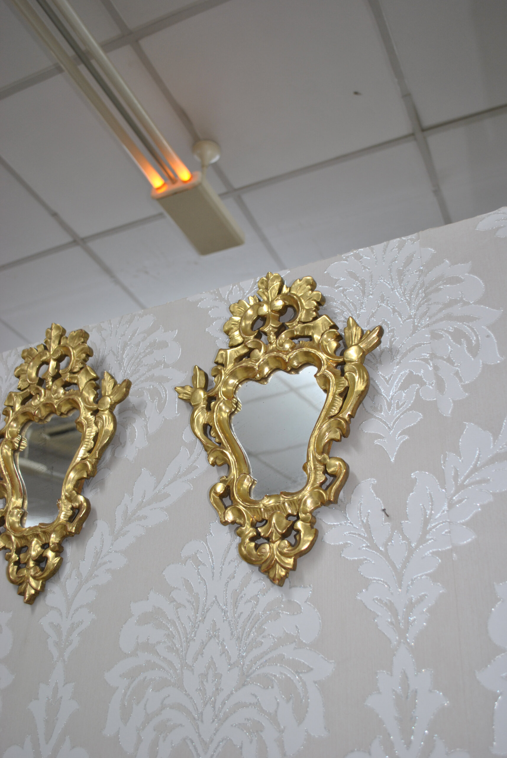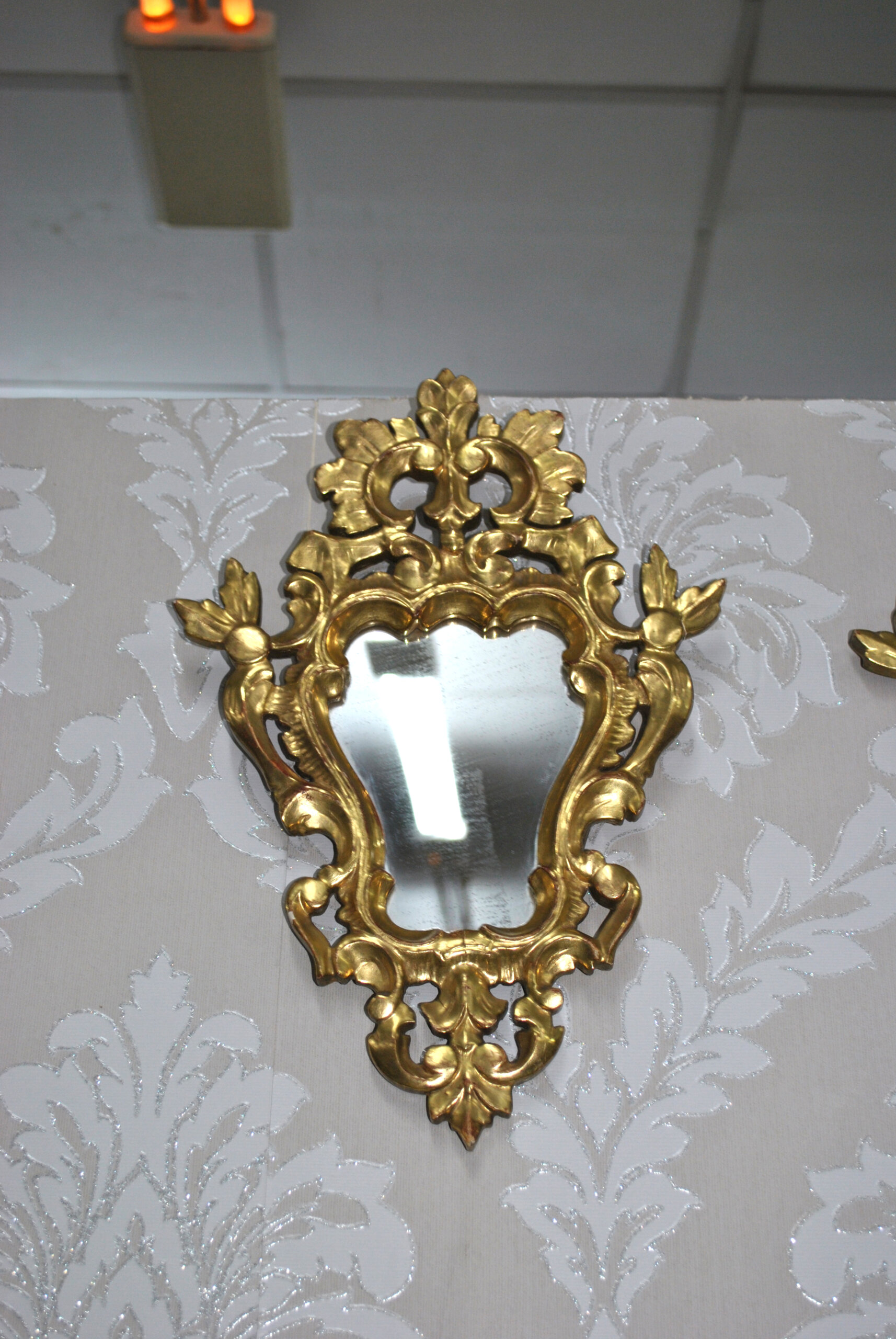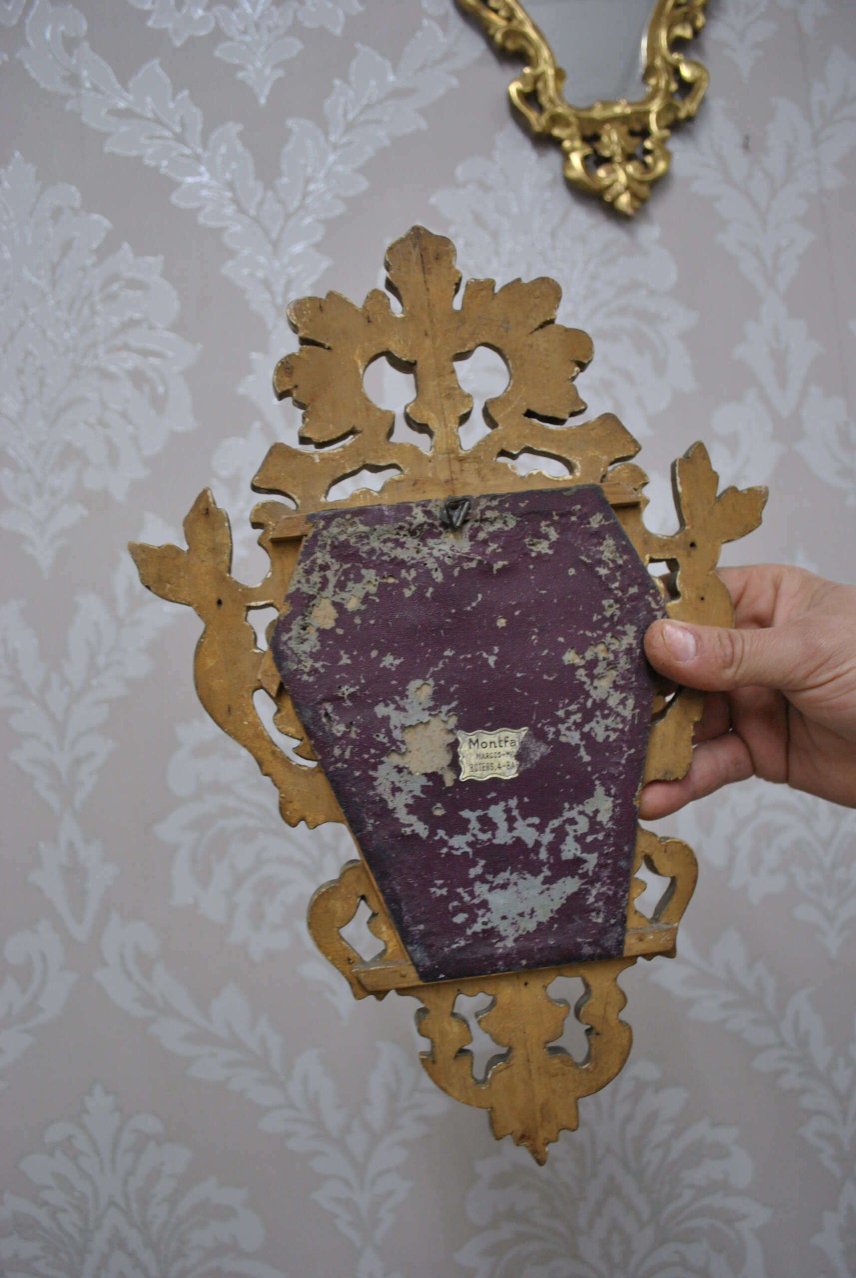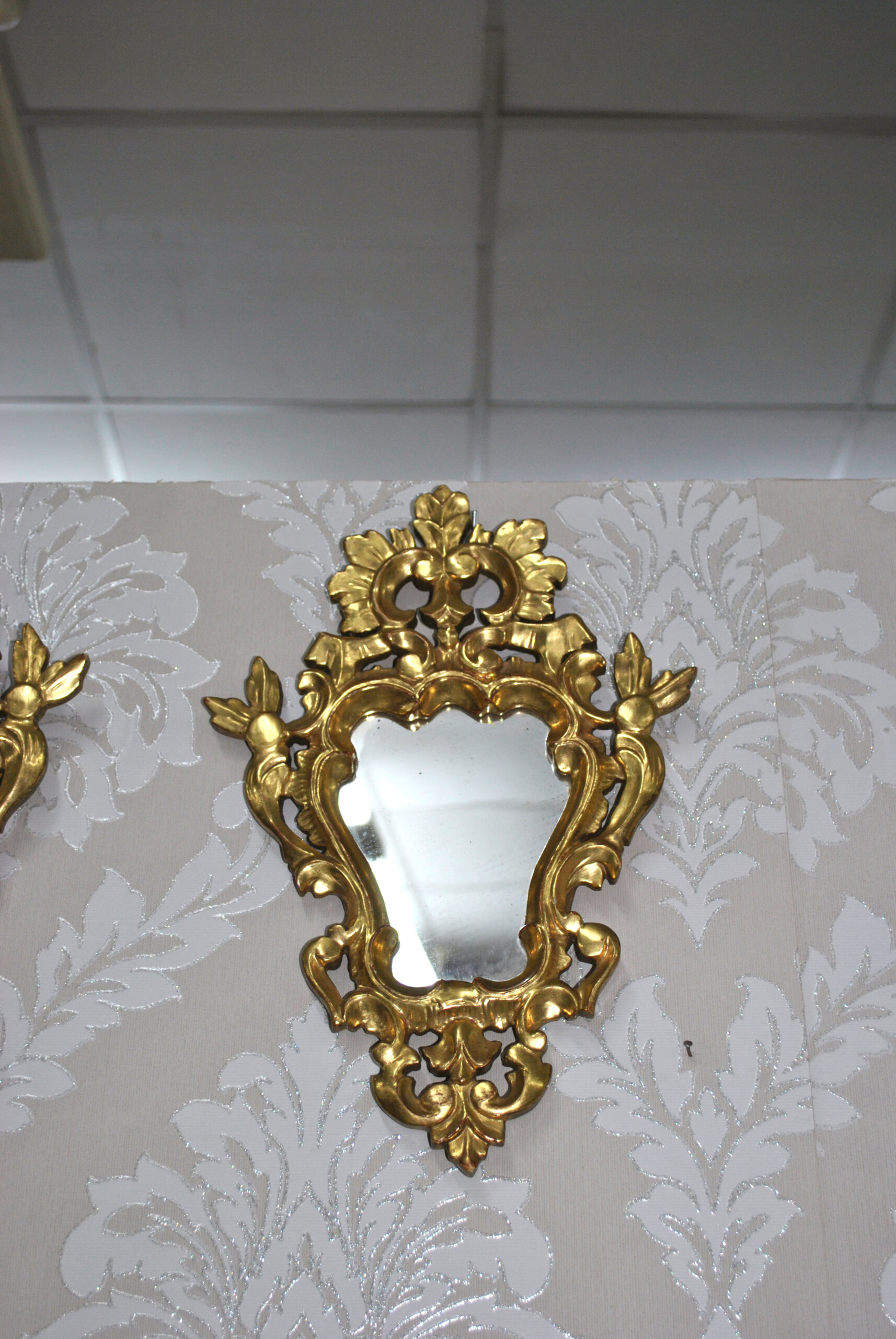 Cada cornucopia conserva su espejo central original, enmarcado por una estructura calada de gran detalle artesanal. El dorado presenta una pátina antigua muy atractiva, con ligeros desgastes propios del paso del tiempo que realzan su autenticidad y carácter vintage.