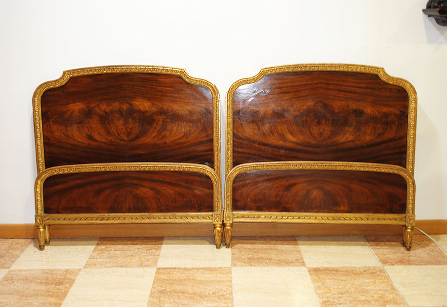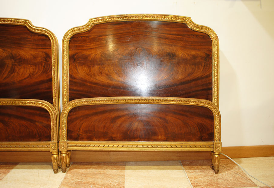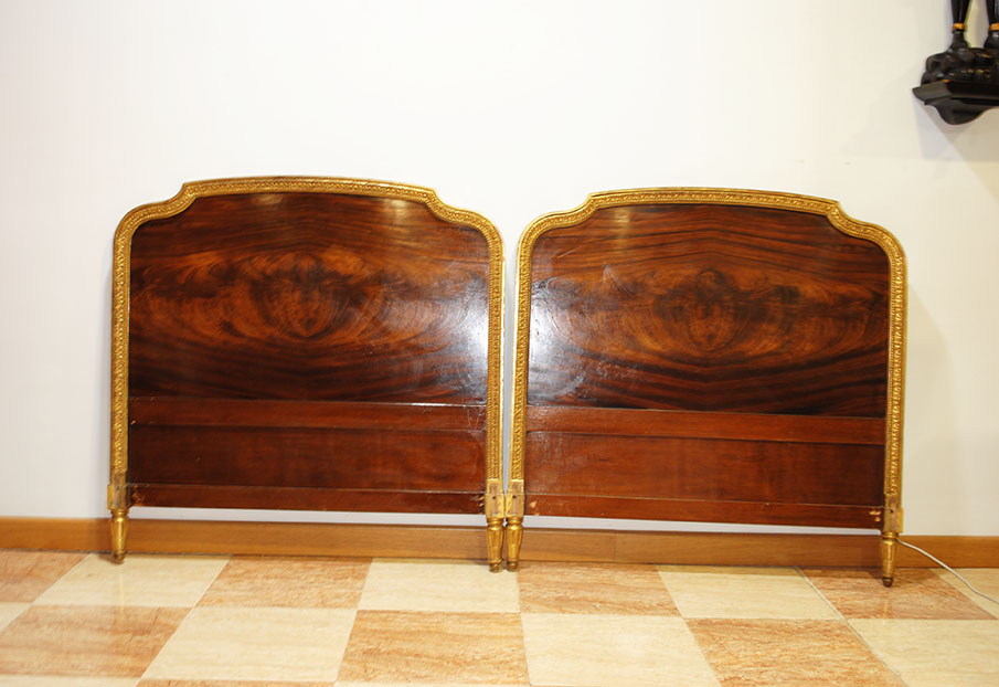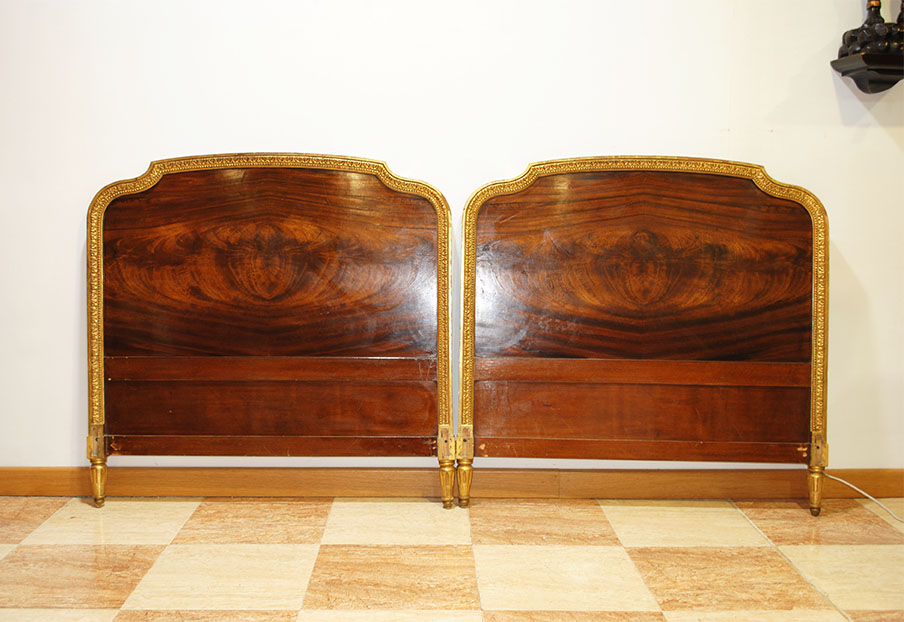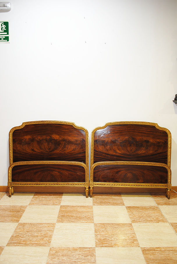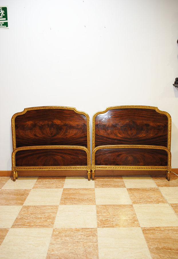 REF: 8350 -Elegante pareja de camas antiguas de estilo Luis XVI, neoclásico, realizados en madera noble con una espectacular chapa de caoba de veta marcada y simétrica, enmarcados por una fina y delicada moldura dorada que recorre todo el perímetro aportando un acabado sofisticado y señorial; cada cabecero presenta un diseño curvado con doble panel, copete superior suavemente ondulado, patas estriadas con terminación en dorado y una cenefa inferior con detalle lineal decorativo, ideales para camas individuales o para convertirlos en una cama doble con un resultado espectacular en dormitorios clásicos, hoteles con encanto o proyectos de interiorismo; además, conservan marca/firma del ebanista visible en la madera Herraiz, lo que les añade valor y autenticidad como pieza de calidad artesanal.