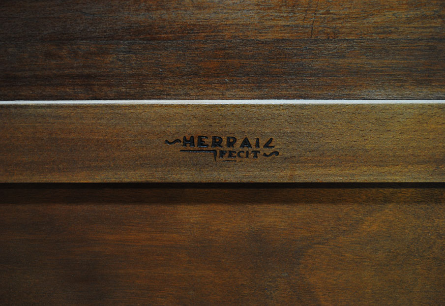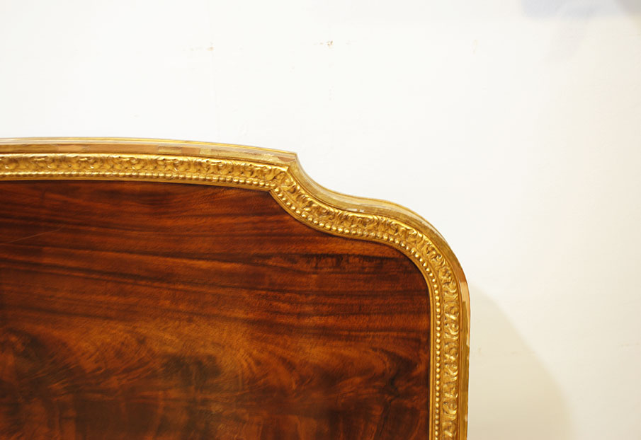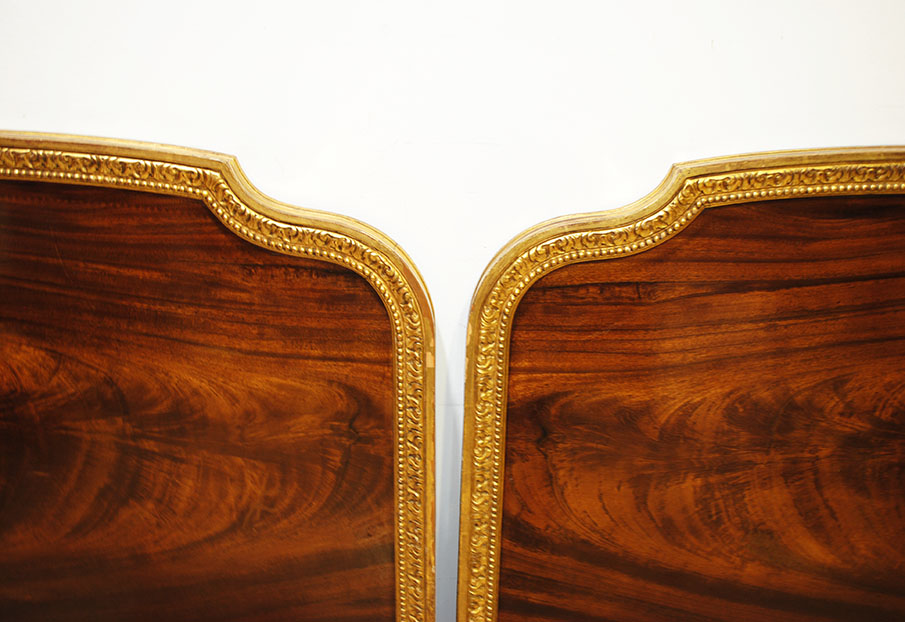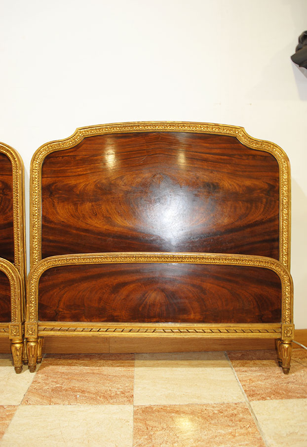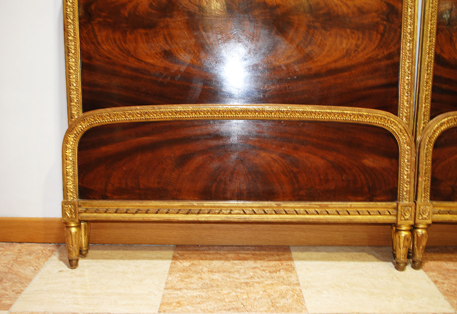REF: 8350 -Elegante pareja de camas antiguas de estilo Luis XVI, neoclásico, realizados en madera noble con una espectacular chapa de caoba de veta marcada y simétrica, enmarcados por una fina y delicada moldura dorada que recorre todo el perímetro aportando un acabado sofisticado y señorial; cada cabecero presenta un diseño curvado con doble panel, copete superior suavemente ondulado, patas estriadas con terminación en dorado y una cenefa inferior con detalle lineal decorativo, ideales para camas individuales o para convertirlos en una cama doble con un resultado espectacular en dormitorios clásicos, hoteles con encanto o proyectos de interiorismo; además, conservan marca/firma del ebanista visible en la madera Herraiz, lo que les añade valor y autenticidad como pieza de calidad artesanal.