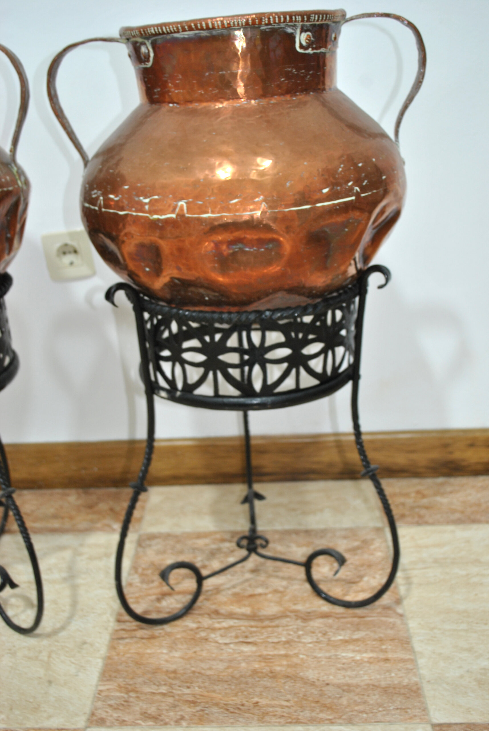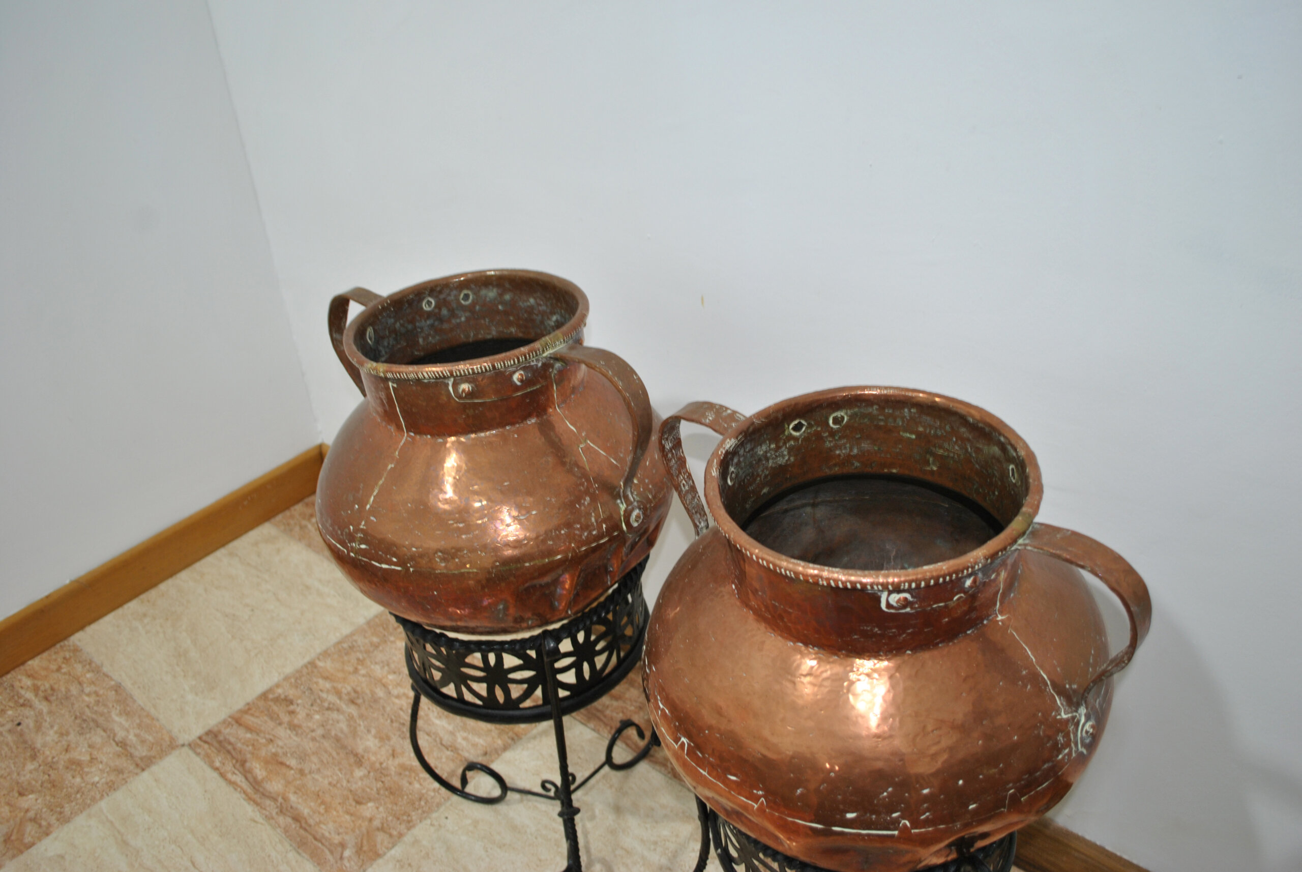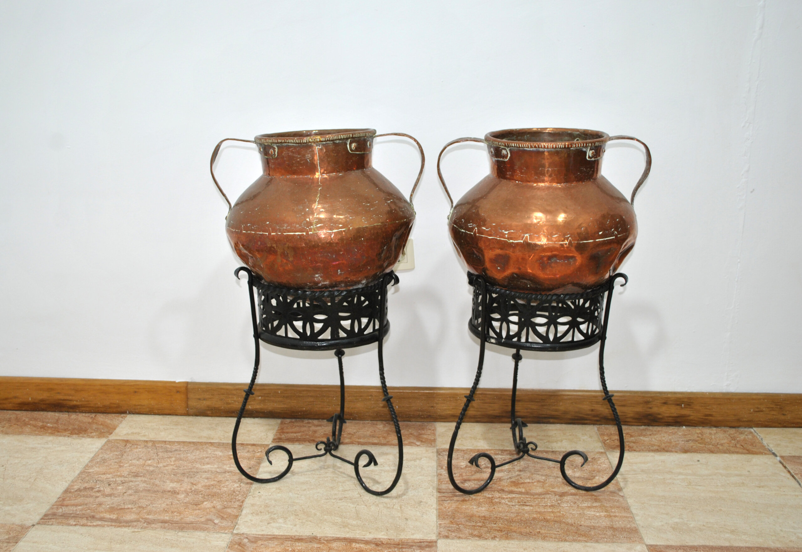 El cobre muestra una pátina natural del tiempo, con marcas propias del uso y de la fabricación artesanal que aportan autenticidad y carácter a estas piezas tradicionales. Los soportes de hierro presentan un bonito trabajo decorativo con patas curvadas y detalles ornamentales.