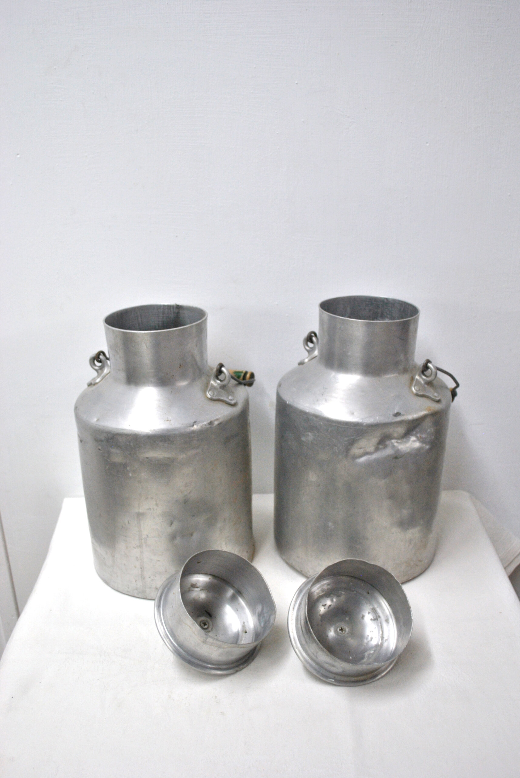 REF: 12367 – Auténtica pareja de lecheras antiguas de 5L fabricadas en aluminio, con diseño tradicional y gran encanto rural. Cada pieza cuenta con su tapa original y asa metálica con empuñadura de madera, lo que facilita su transporte y le aporta un toque cálido y decorativo.