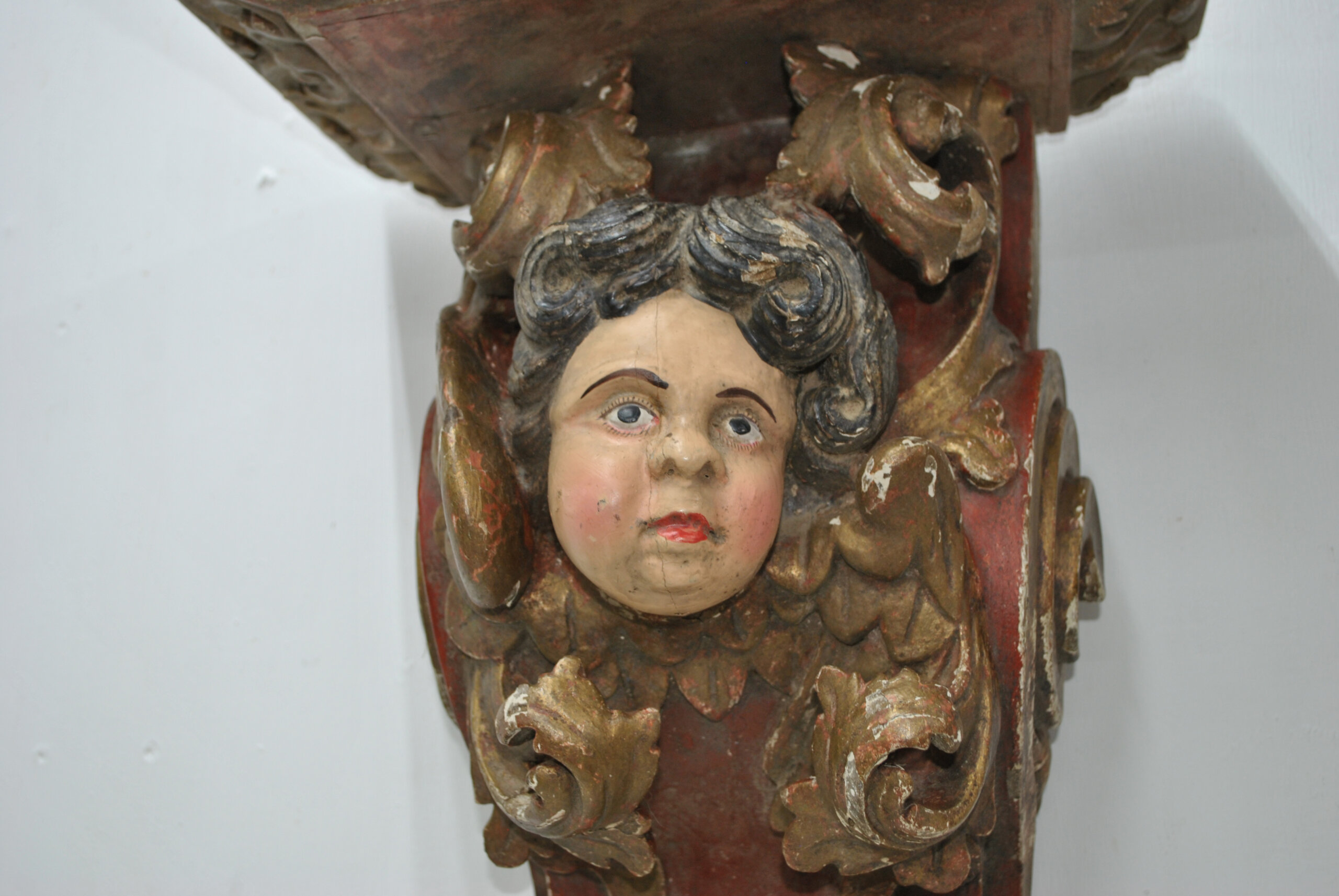 REF: 12365 – Espectacular pareja de ménsulas antiguas realizadas en madera tallada y policromada, con un diseño de clara inspiración barroca. Cada pieza presenta un exquisito trabajo artesanal donde destaca la figura central de un querubín, rodeado de volutas y elementos decorativos tallados a mano, aportando gran riqueza visual y carácter.