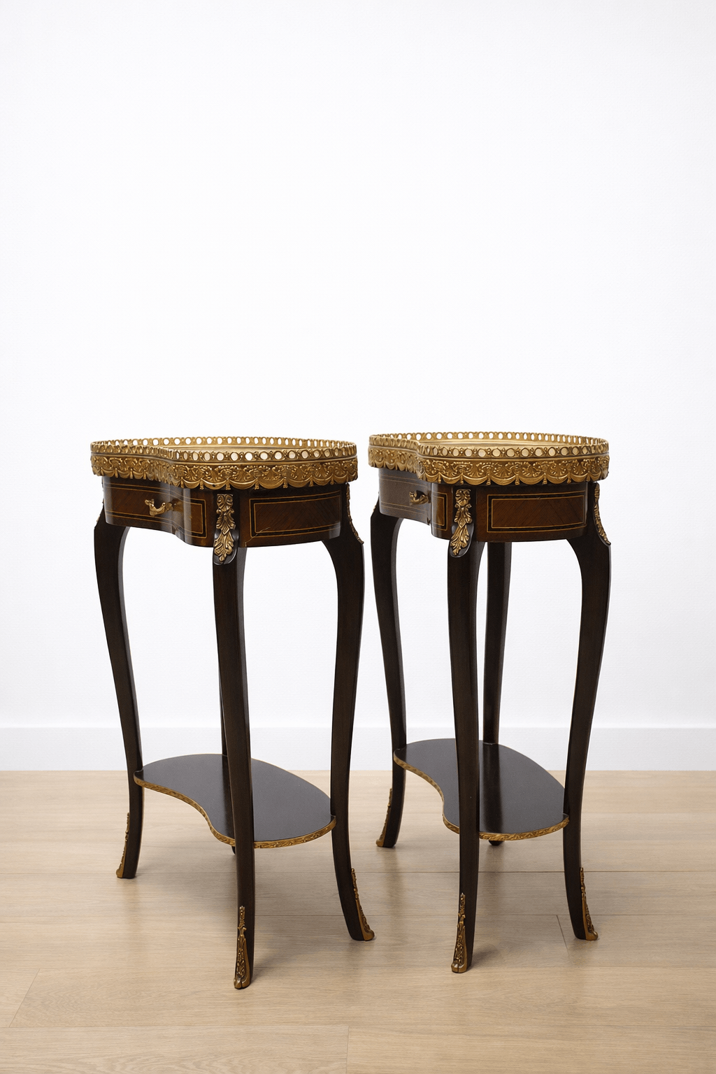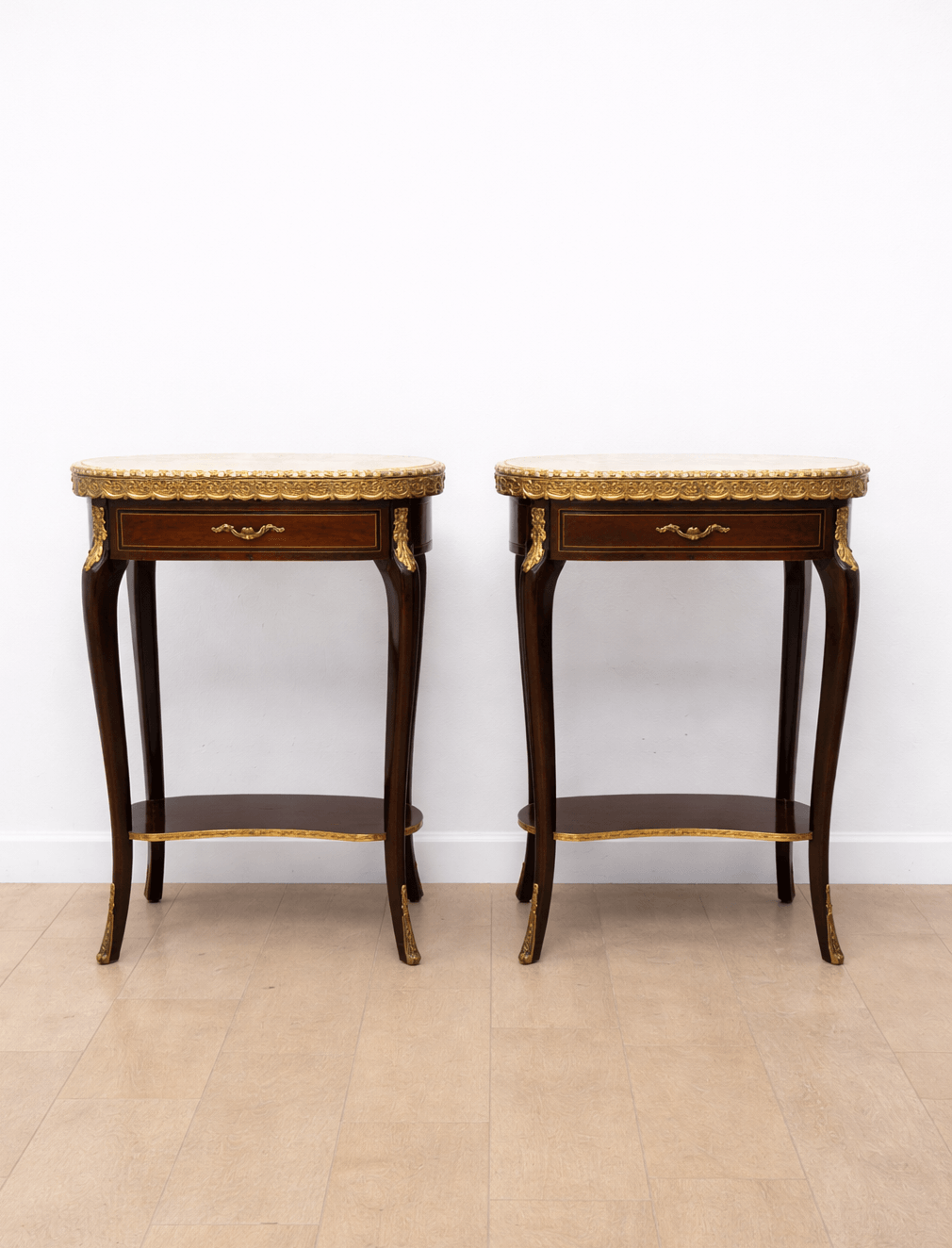 Destacan especialmente sus tapas superiores de mármol en tono claro, enmarcadas por una fina galería de bronce dorado que aporta un toque sofisticado y protege la superficie. Incorporan además detalles ornamentales en bronce dorado en patas y esquinas, así como un pequeño cajón frontal en cada mesa, ideal para almacenaje discreto.