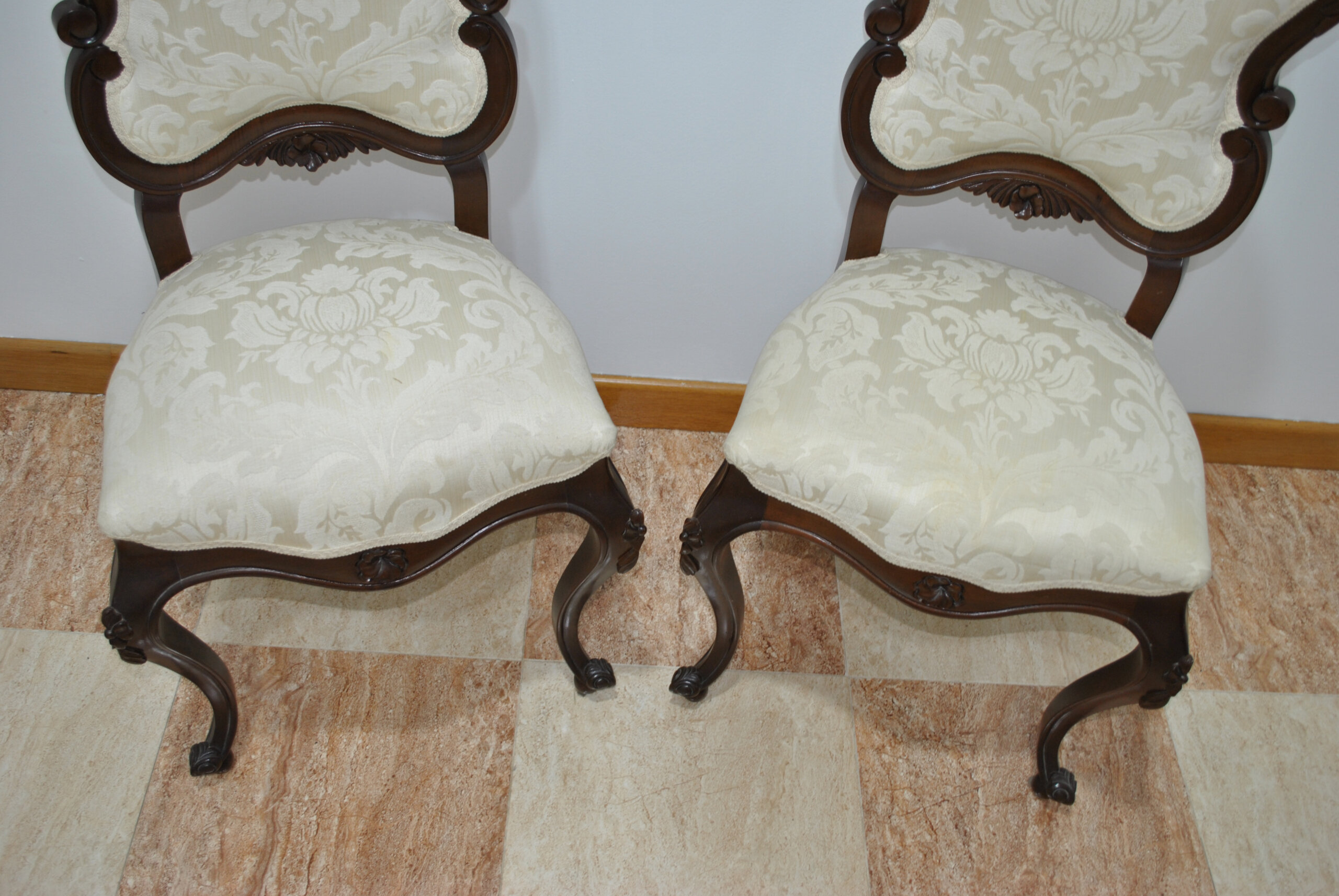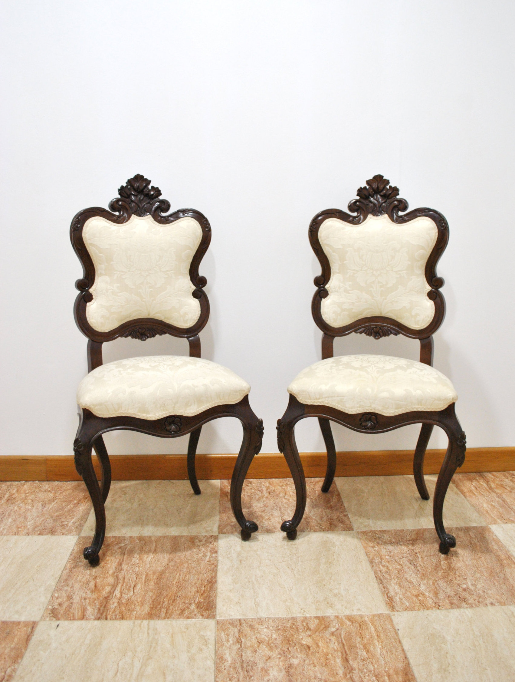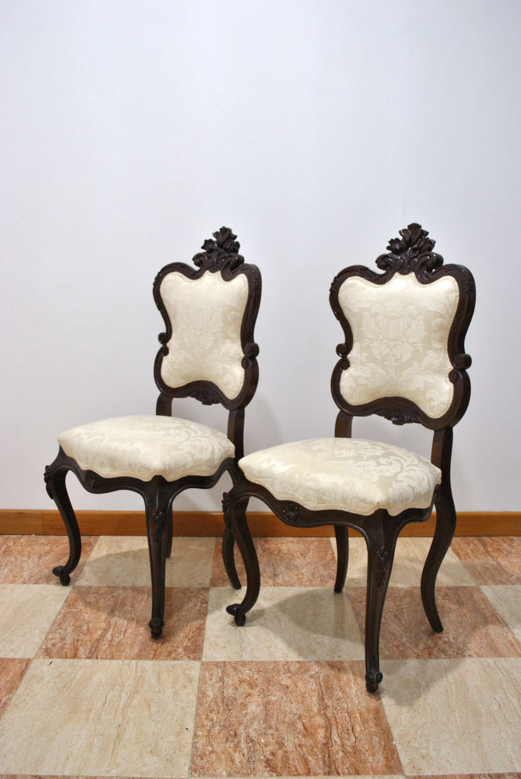 La tapicería en tejido damasco color marfil aporta luminosidad y contraste, con dibujo floral en relieve que realza su elegancia. El asiento es amplio y cómodo, ideal tanto para uso decorativo como funcional.