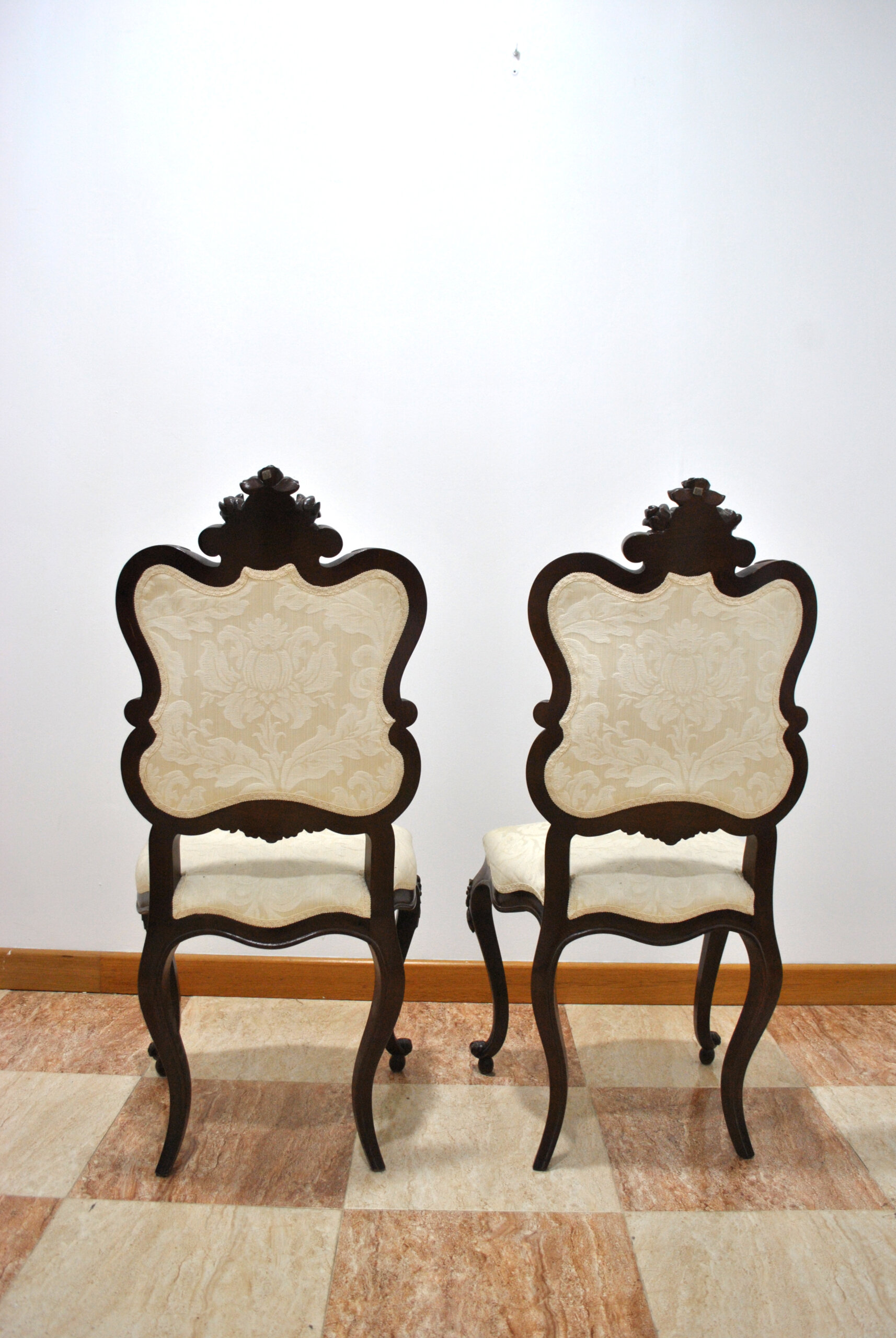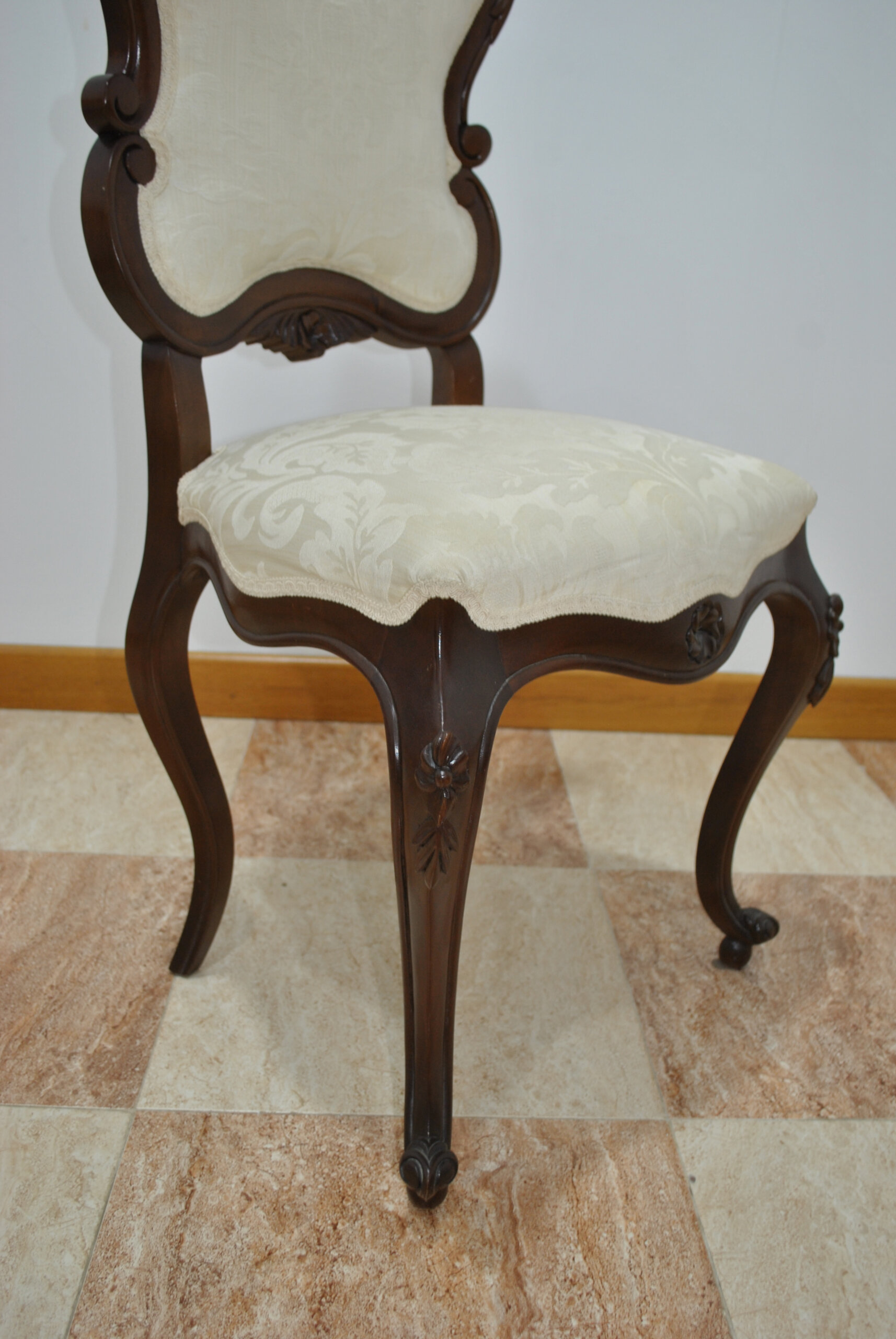El respaldo presenta una silueta ondulada con remate superior tallado de inspiración floral y roleos laterales, aportando equilibrio y distinción. La estructura descansa sobre estilizadas patas cabriole, delicadamente curvadas y rematadas con pequeños detalles tallados que refuerzan su carácter clásico.