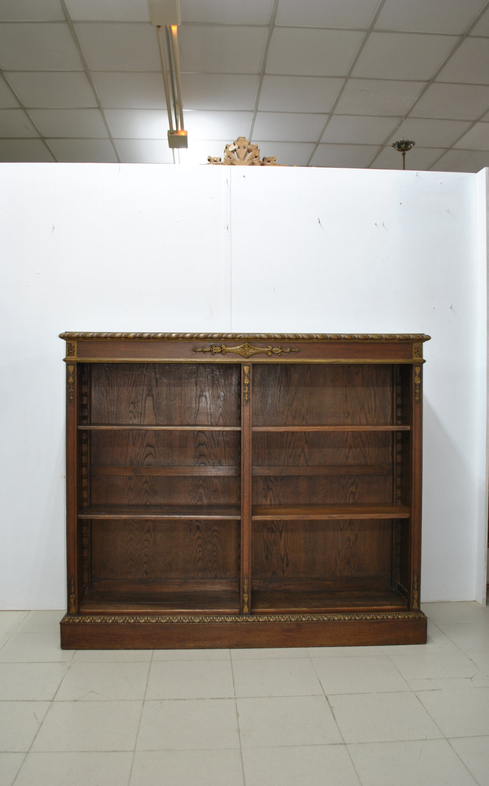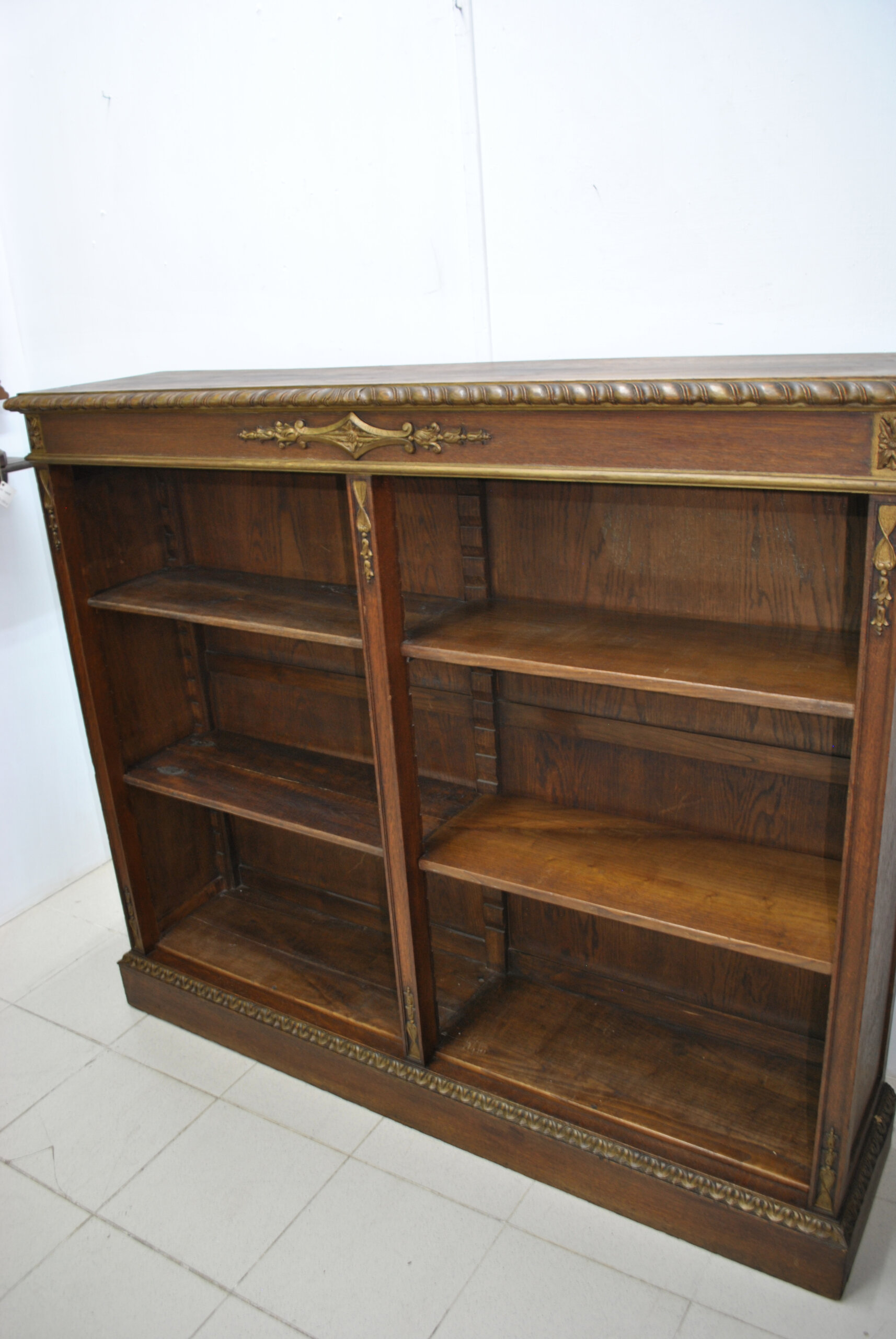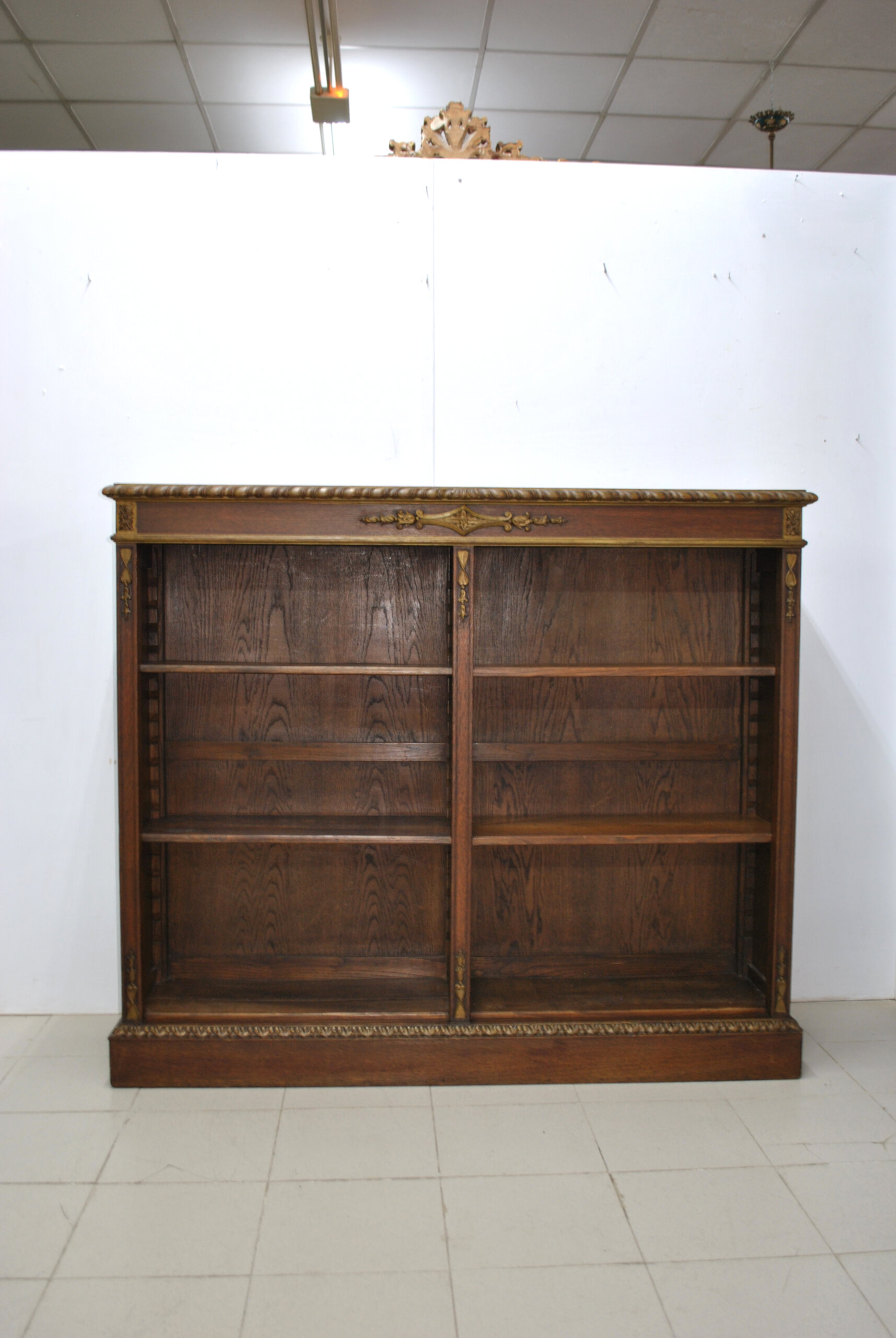 El frente está decorado con apliques de bronce en forma de guirnaldas florales, cintas y ornamentos clásicos, junto con una elegante moldura superior de talla helicoidal dorada. Los laterales y estantes, de madera maciza, exhiben una bella beta natural del roble, aportando calidez y nobleza al conjunto. Los estantes son regulables en altura, lo que permite una funcionalidad práctica sin renunciar al refinamiento estético. Su diseño versátil las hace ideales tanto para bibliotecas, despachos o salones, como para integrarlas en espacios contemporáneos que buscan incorporar una pieza de carácter clásico y elegante.