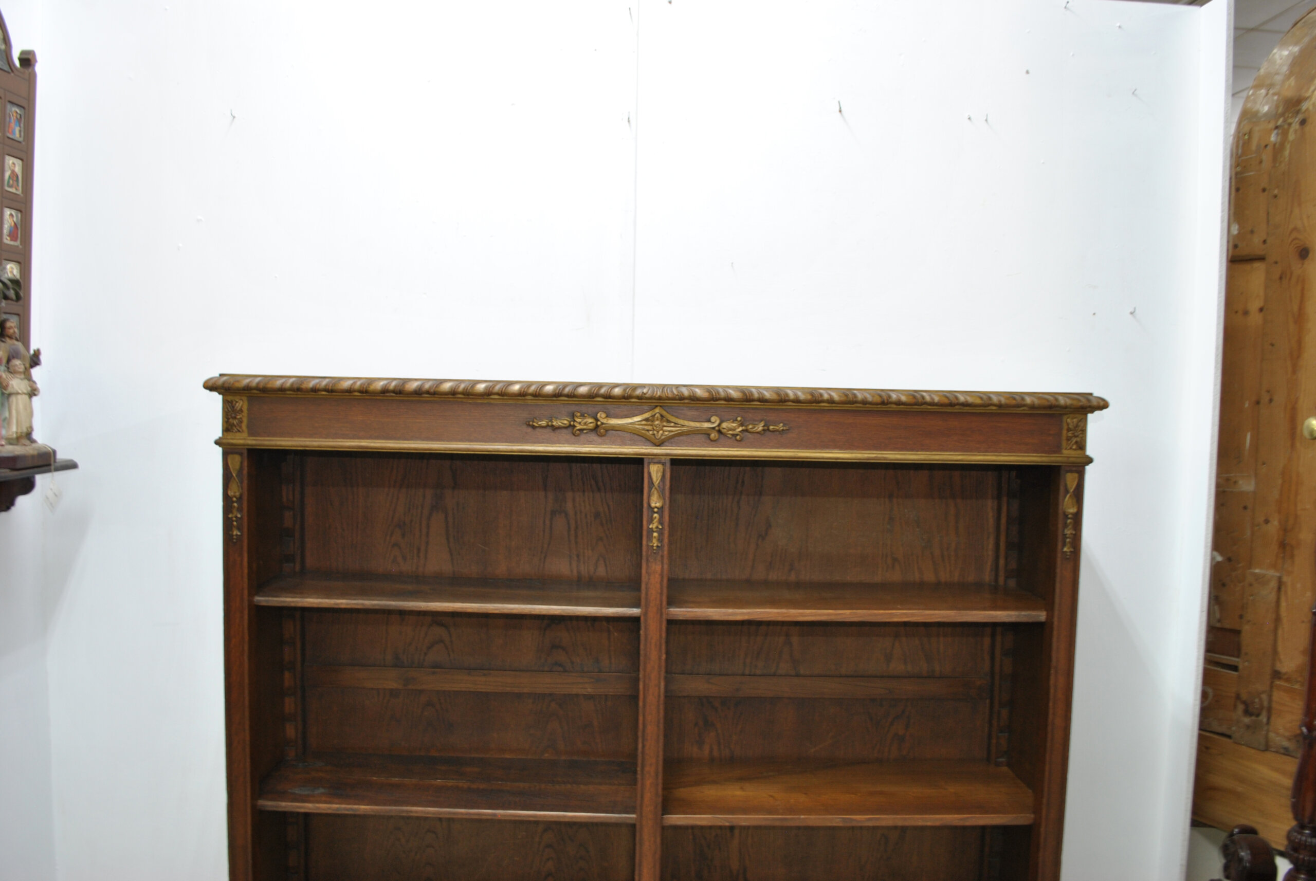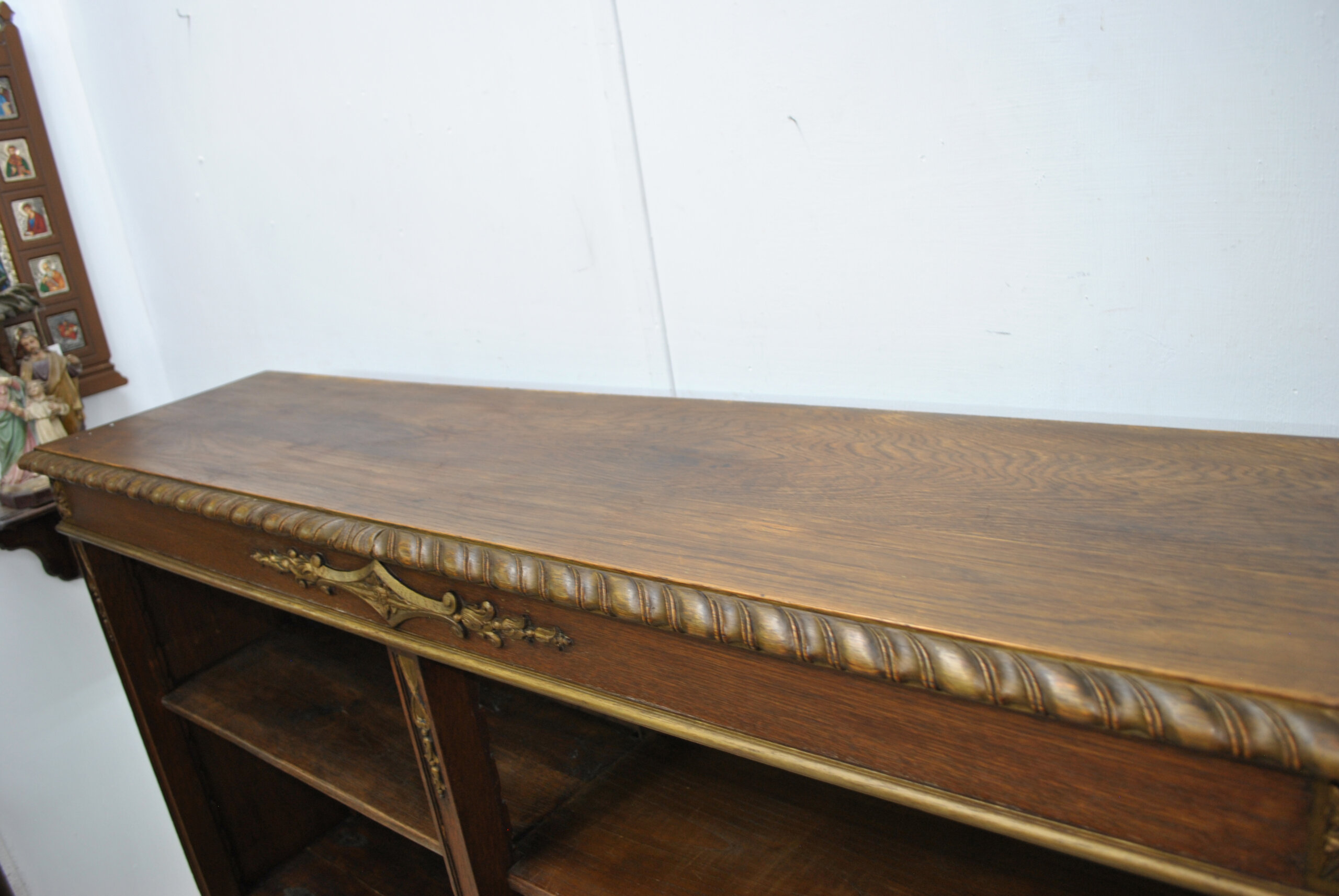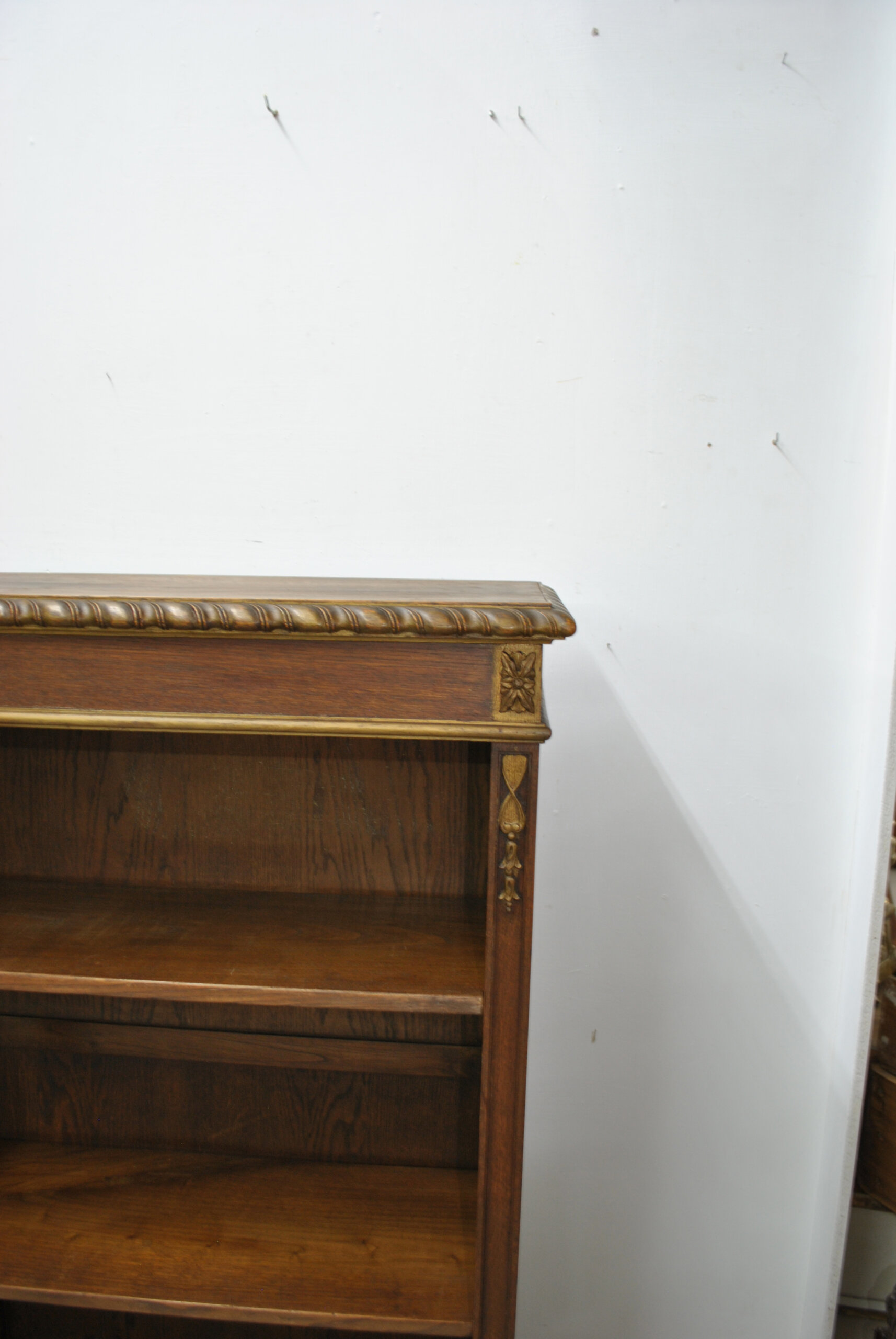 El frente está decorado con apliques de bronce en forma de guirnaldas florales, cintas y ornamentos clásicos, junto con una elegante moldura superior de talla helicoidal dorada. Los laterales y estantes, de madera maciza, exhiben una bella beta natural del roble, aportando calidez y nobleza al conjunto. Los estantes son regulables en altura, lo que permite una funcionalidad práctica sin renunciar al refinamiento estético. Su diseño versátil las hace ideales tanto para bibliotecas, despachos o salones, como para integrarlas en espacios contemporáneos que buscan incorporar una pieza de carácter clásico y elegante.