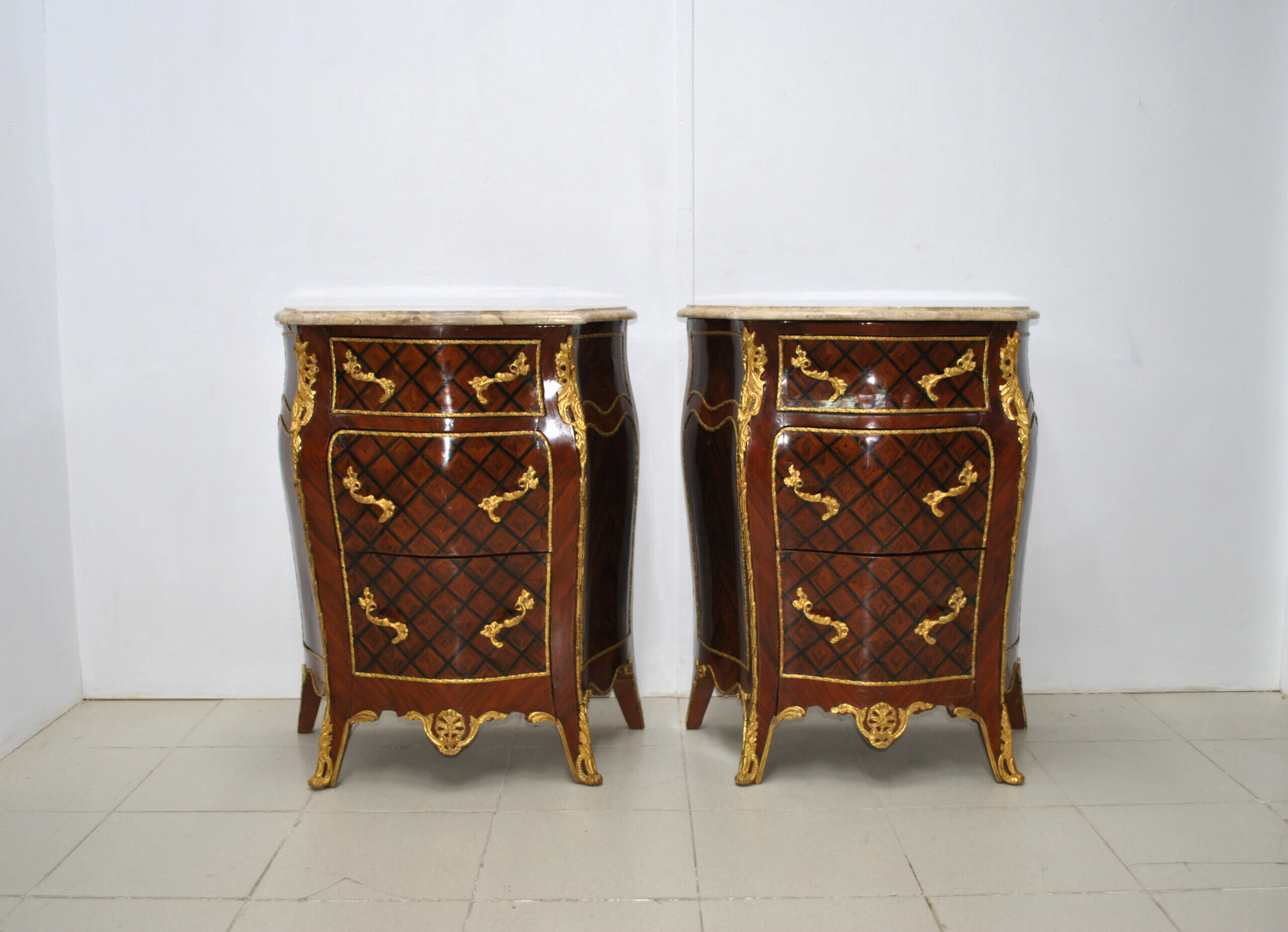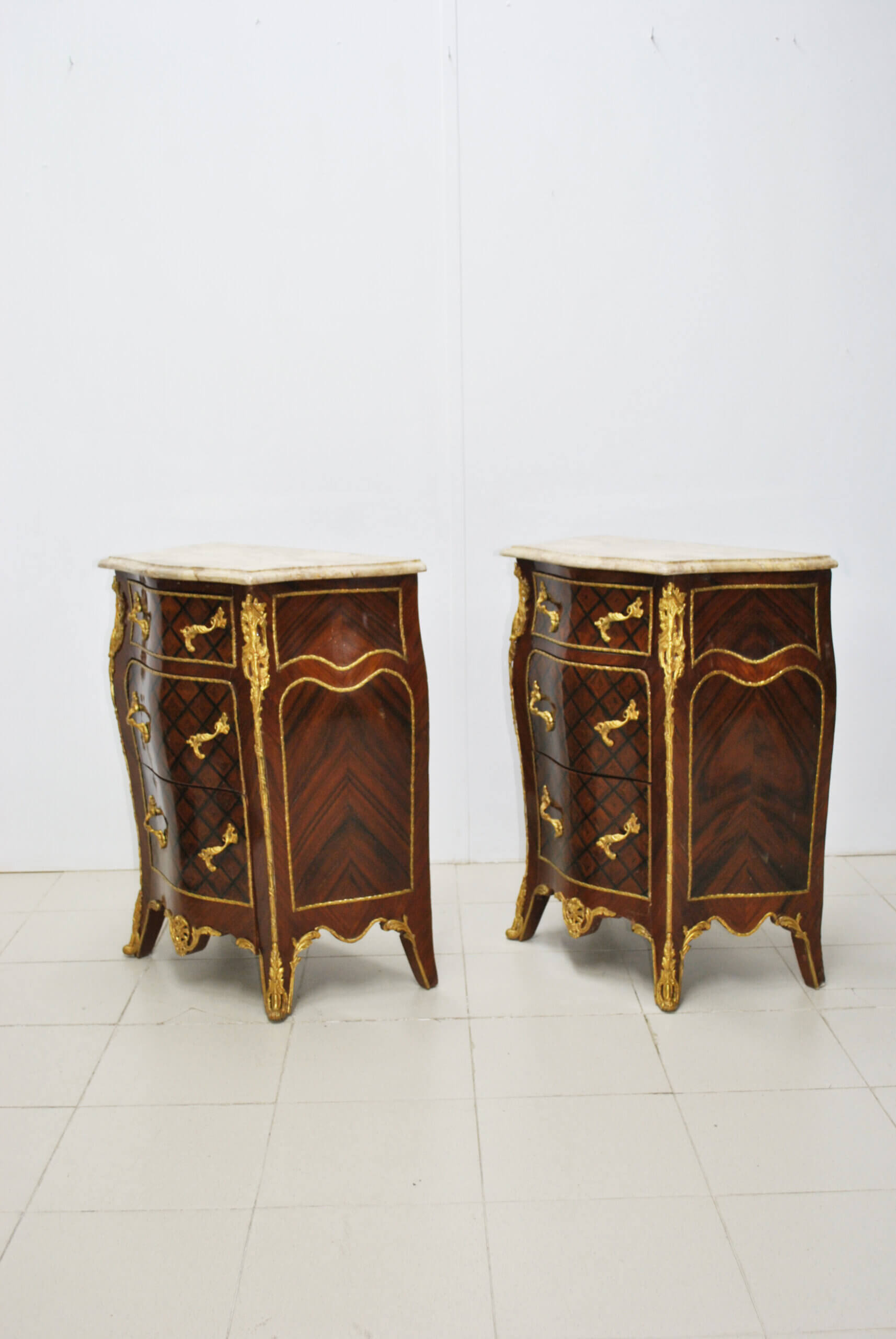 Destacan por sus líneas curvas y sinuosas, propias del estilo francés, así como por sus ricos adornos en bronce dorado que decoran tiradores, esquinas y patas, aportando un toque sofisticado y señorial. Cada mesilla cuenta con varios cajones y puerta lateral, ofreciendo una buena capacidad de almacenaje sin perder su estética refinada. La tapa superior es de mármol en tono claro, lo que añade distinción y funcionalidad. Se trata de piezas muy decorativas, ideales para dormitorio, salón o cualquier espacio donde se quiera aportar elegancia y carácter.