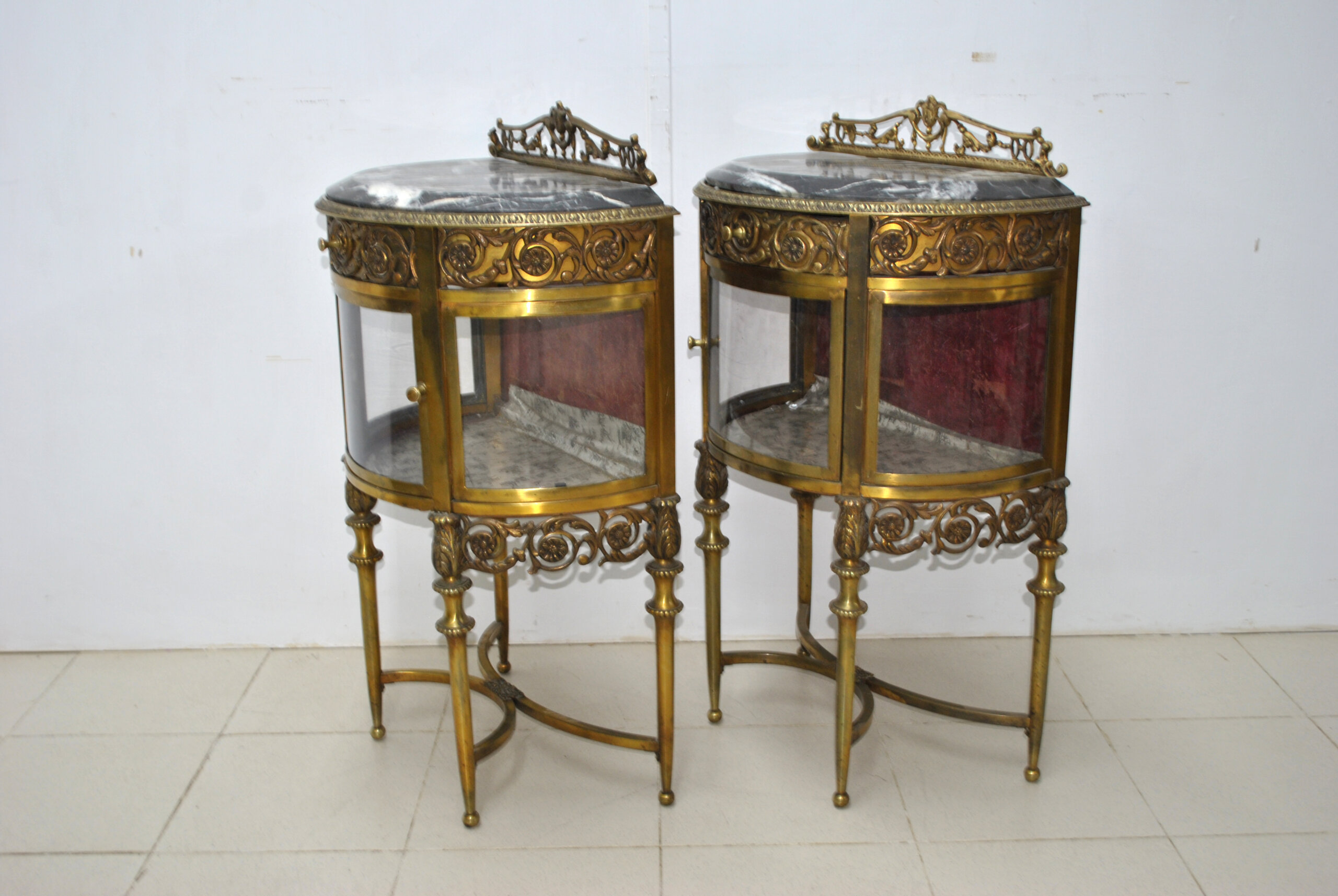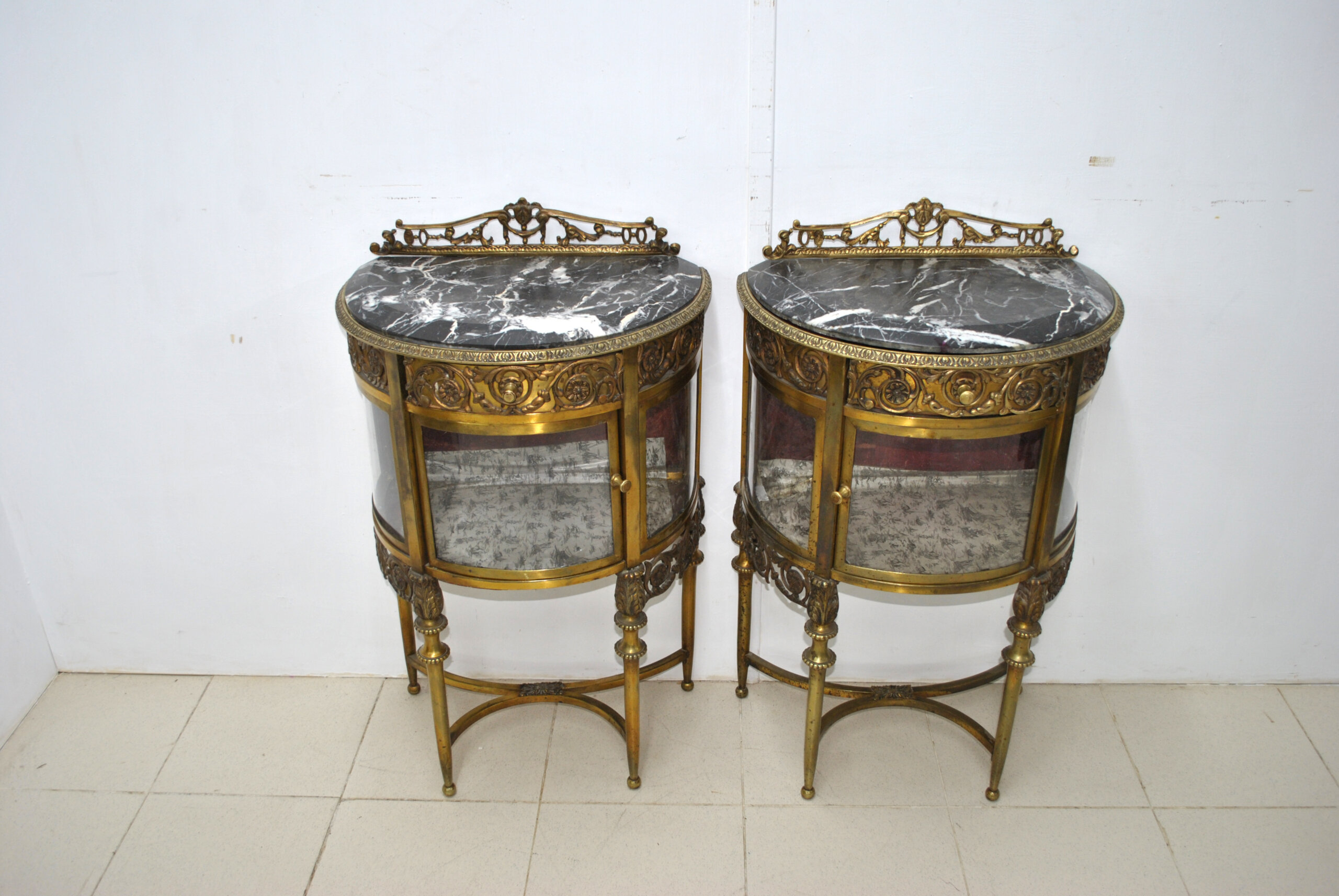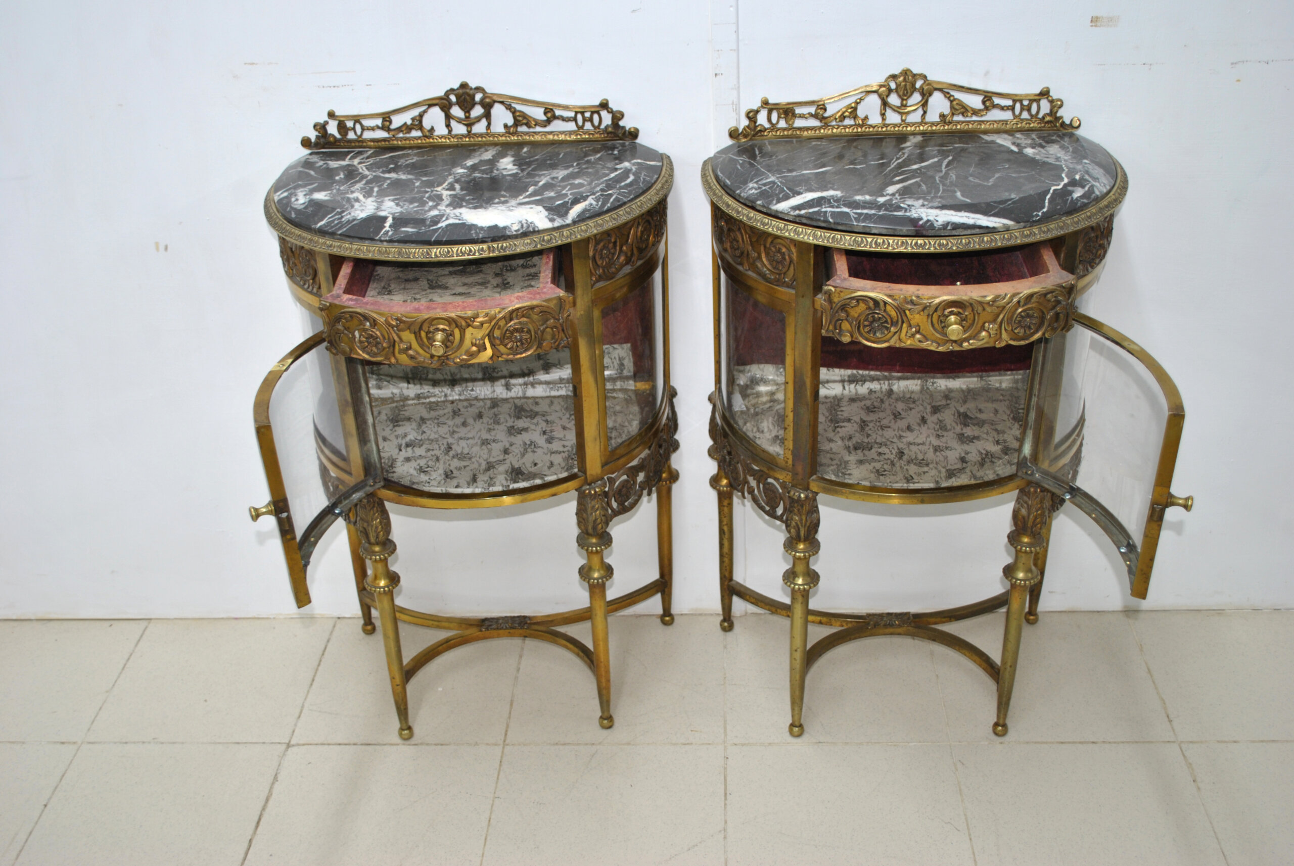 REF: AJ-056 : Excepcional pareja de mesillas de noche o mesitas auxiliares realizadas en bronce dorado cincelado, con tapas de mármol negro veteado y laterales acristalados curvos.