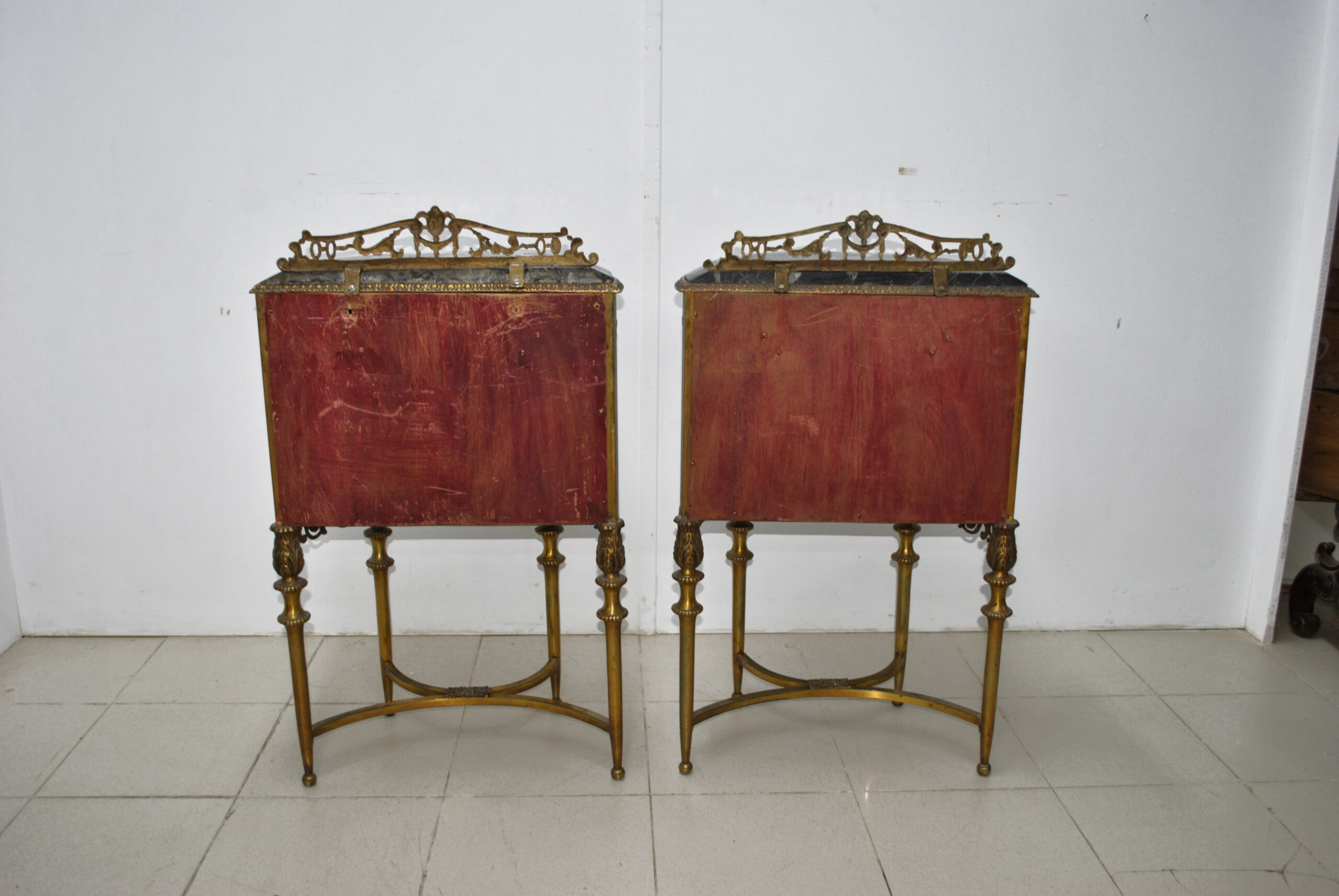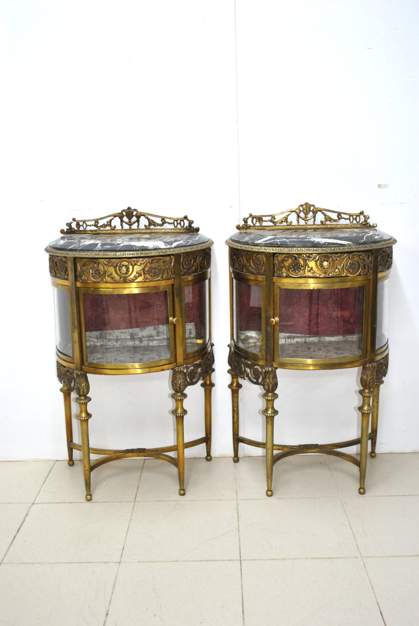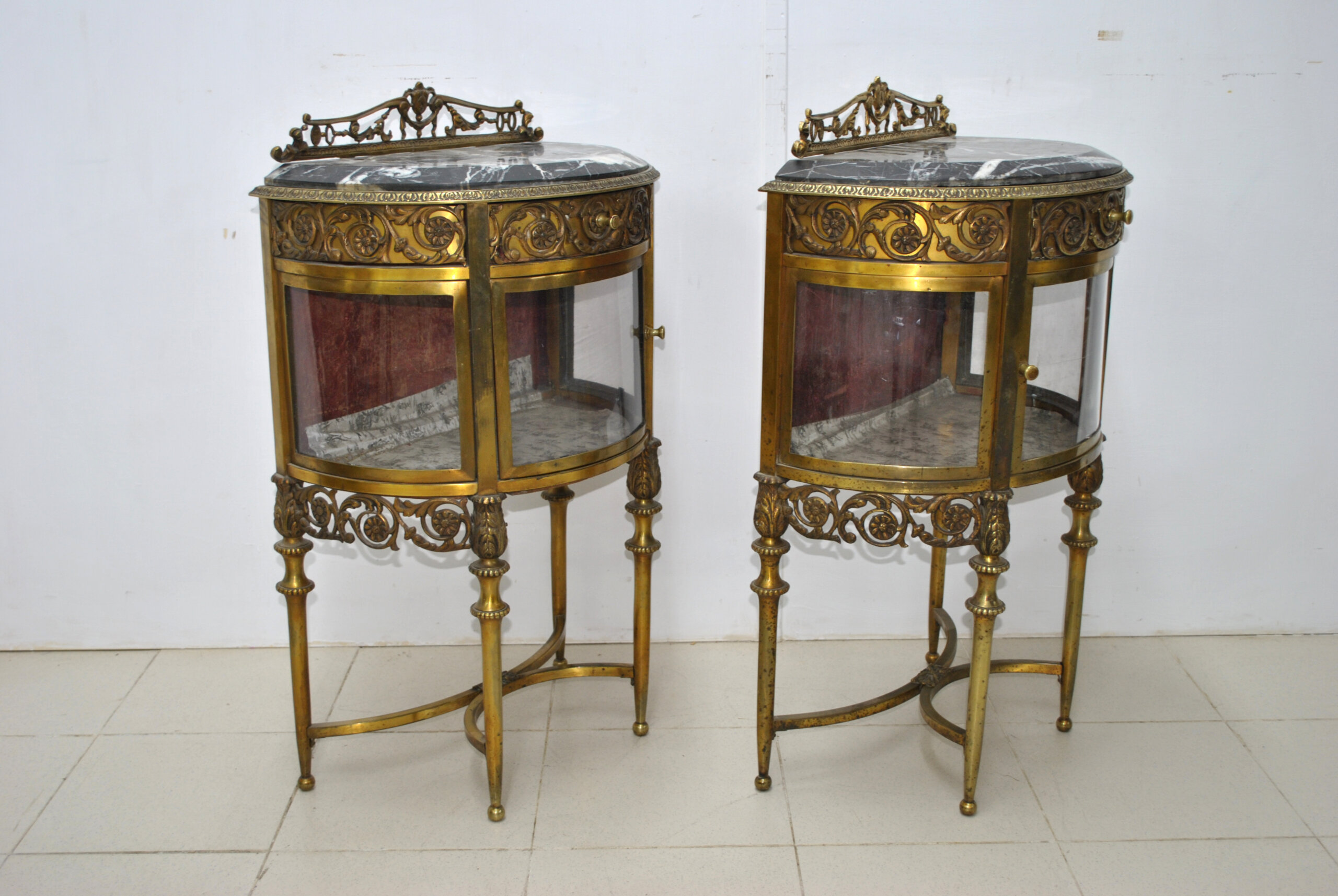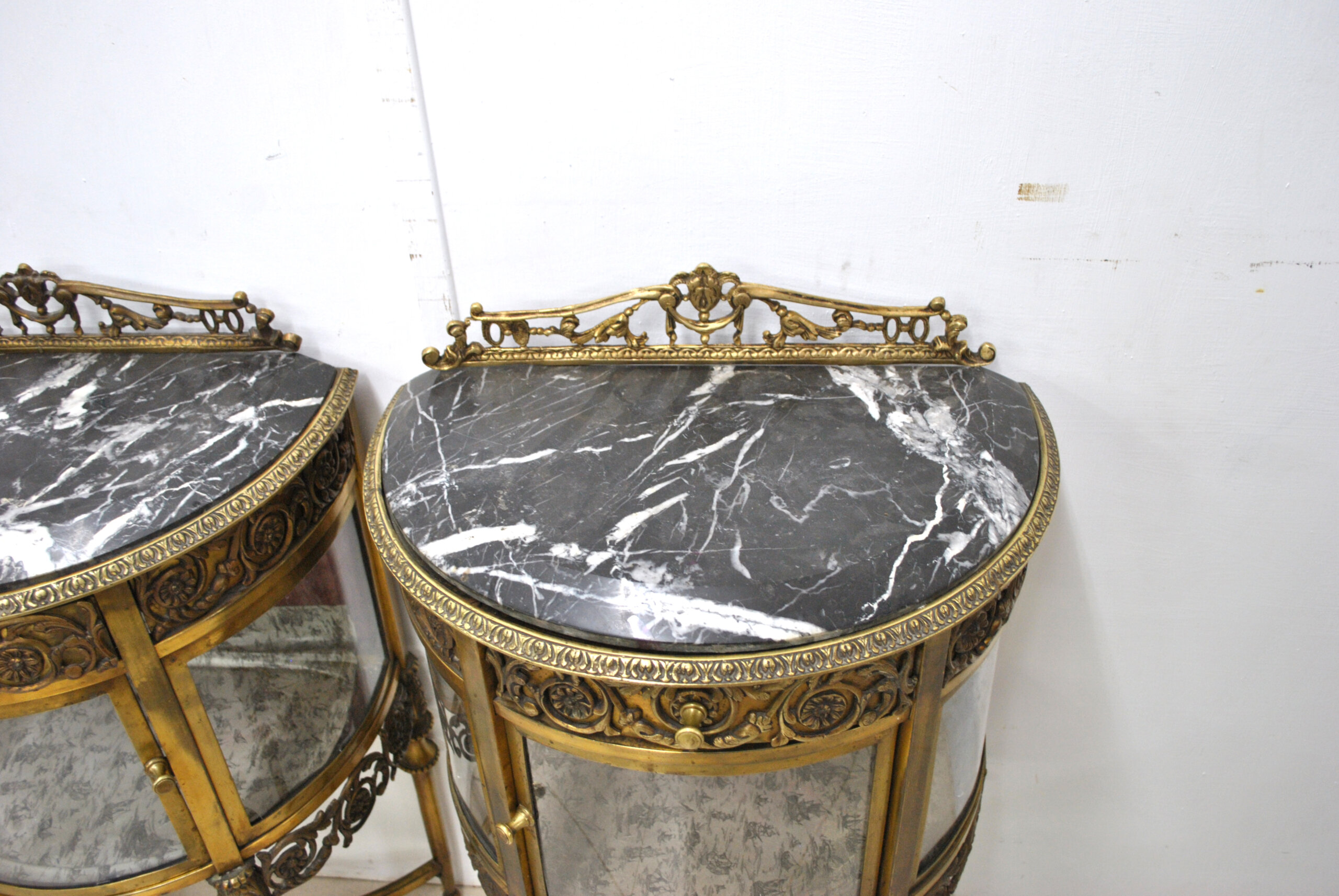 REF: AJ-056 : Excepcional pareja de mesillas de noche o mesitas auxiliares realizadas en bronce dorado cincelado, con tapas de mármol negro veteado y laterales acristalados curvos.