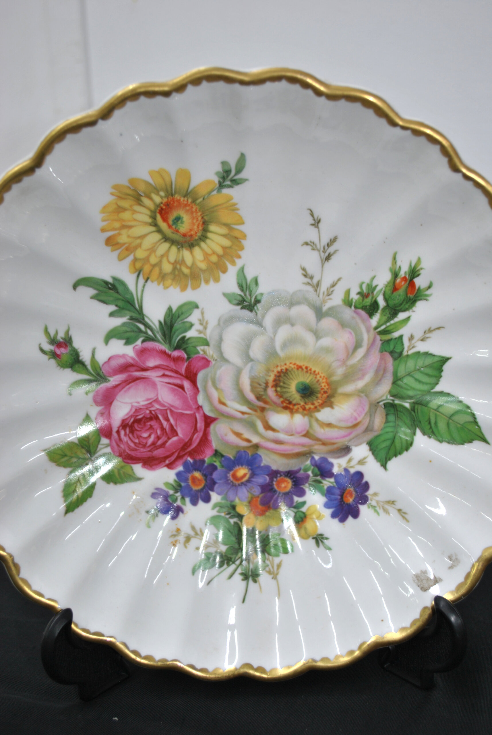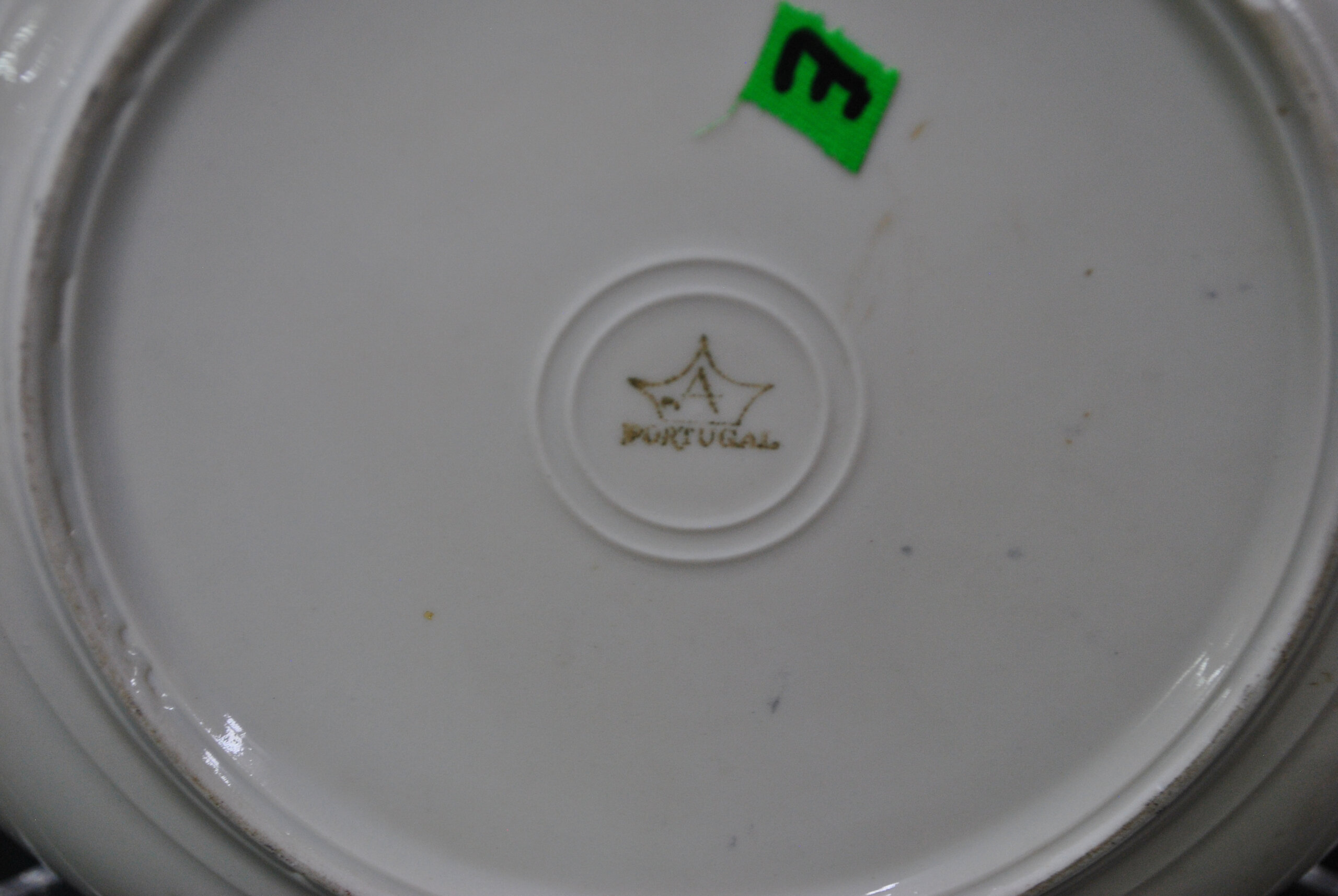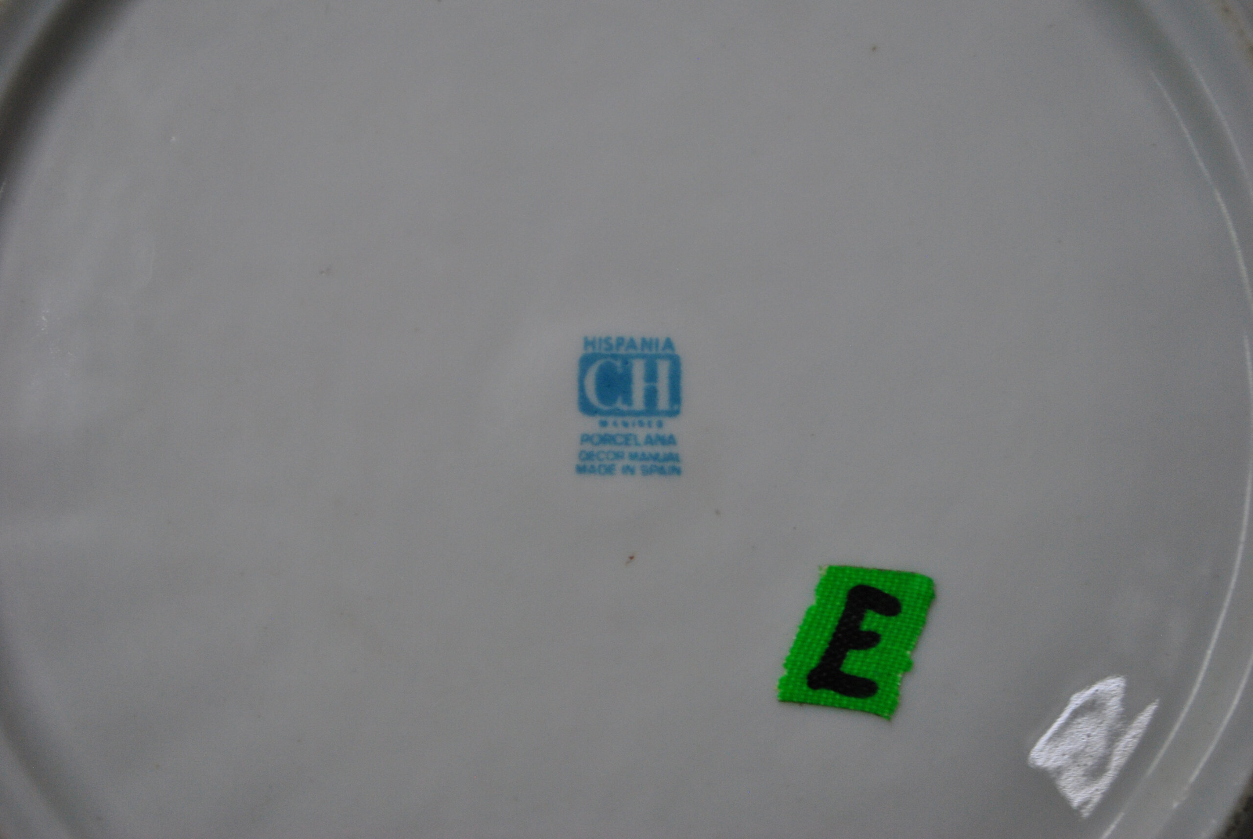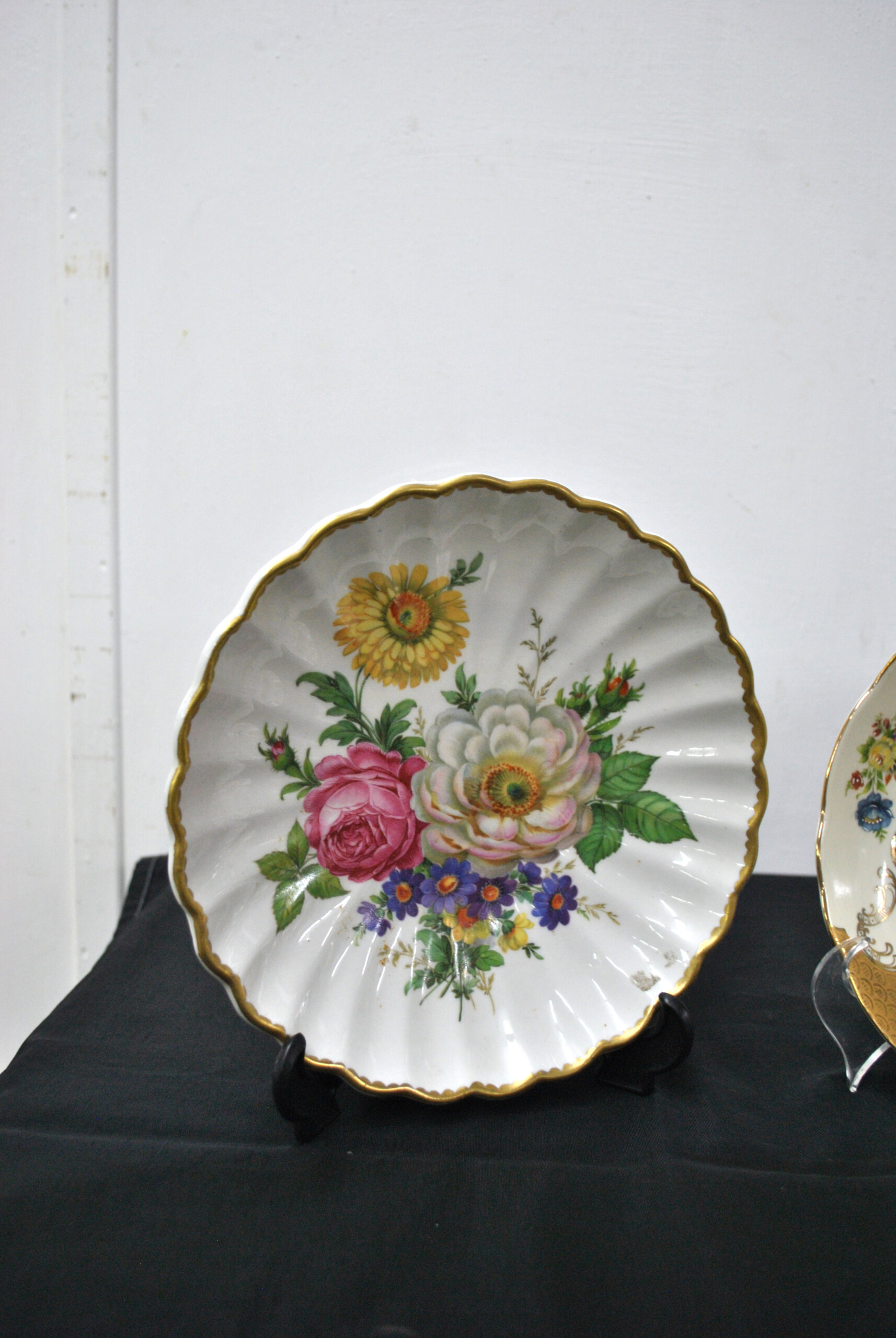 REF: 11953 – Conjunto de dos platos decorativos de porcelana fina, procedentes de España y Portugal, ambos con elegantes motivos florales y acabados dorados. El primer plato, de la firma Hispania CH (Made in Spain), presenta una delicada decoración con flores multicolor sobre fondo blanco marfil, borde ondulado y filo dorado. El segundo, de fabricación portuguesa, luce un diseño floral central con detalles dorados en relieve y un fino borde decorado con arabescos.