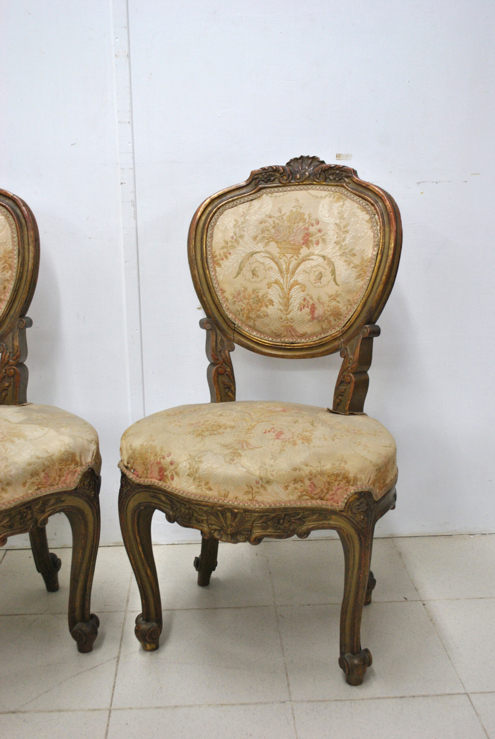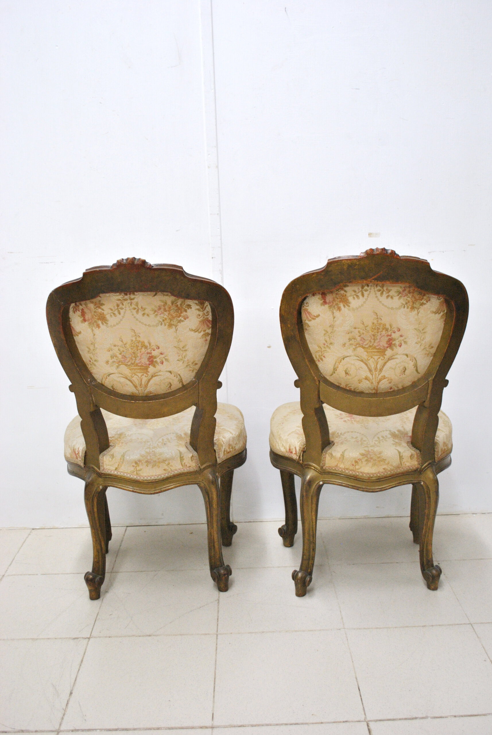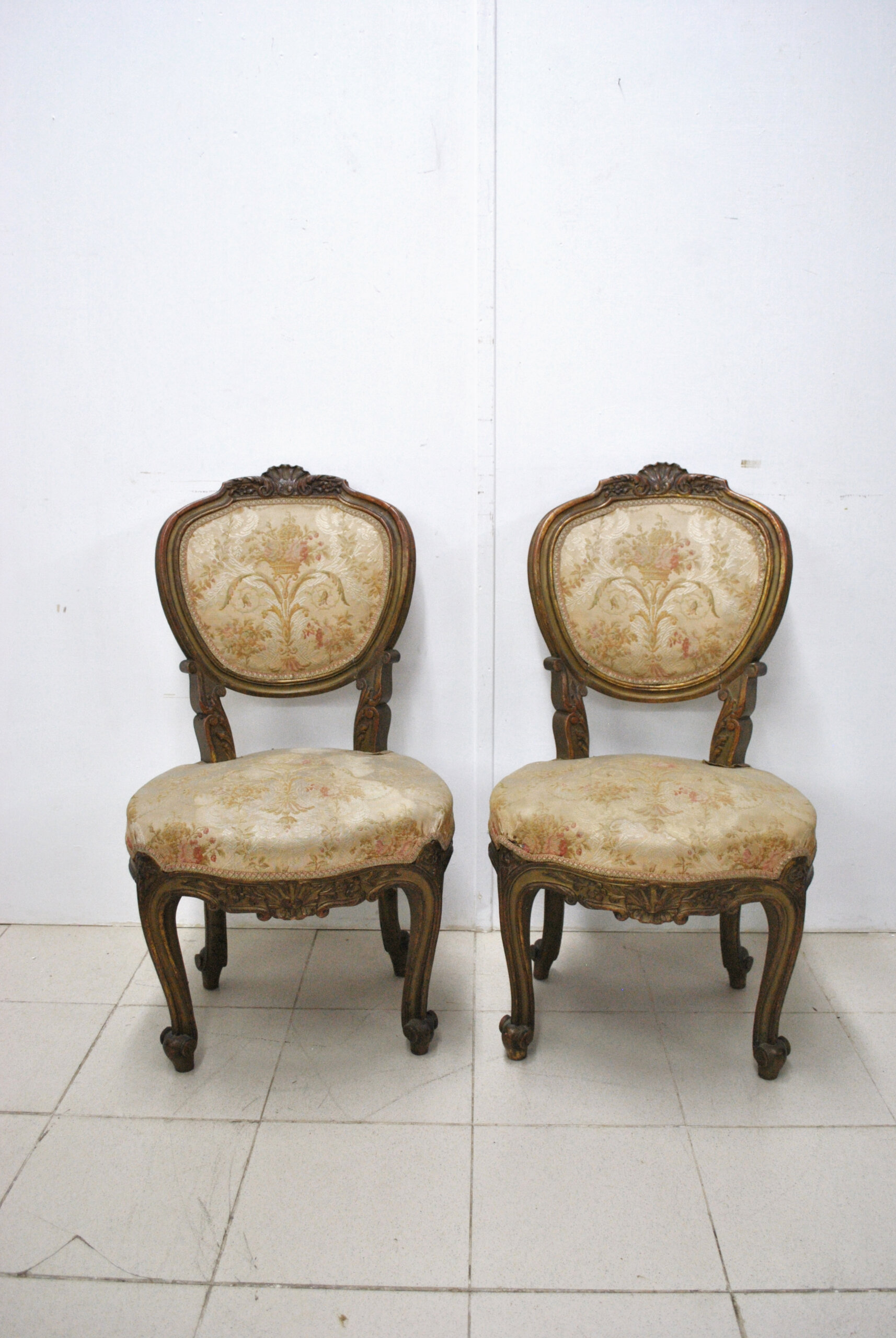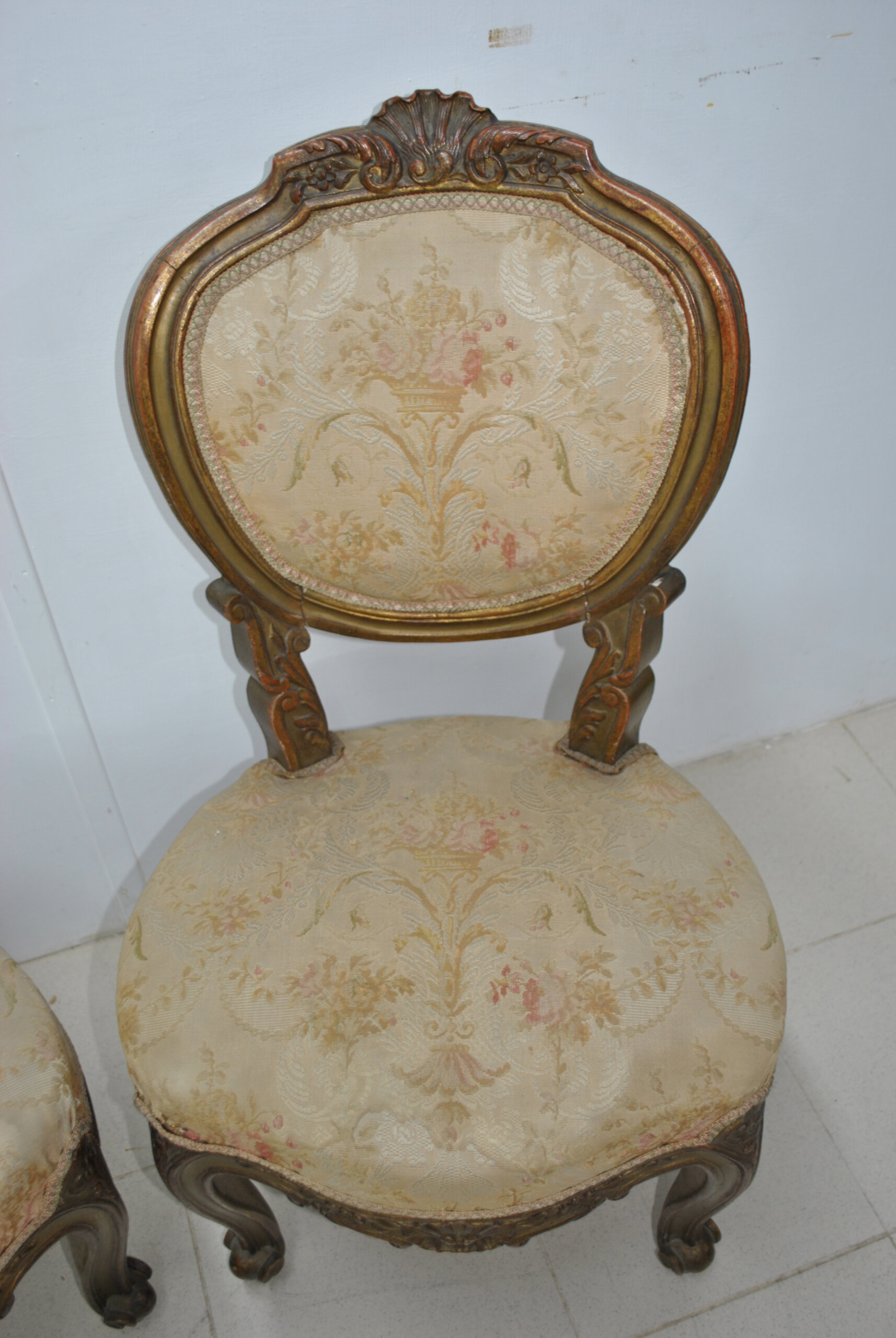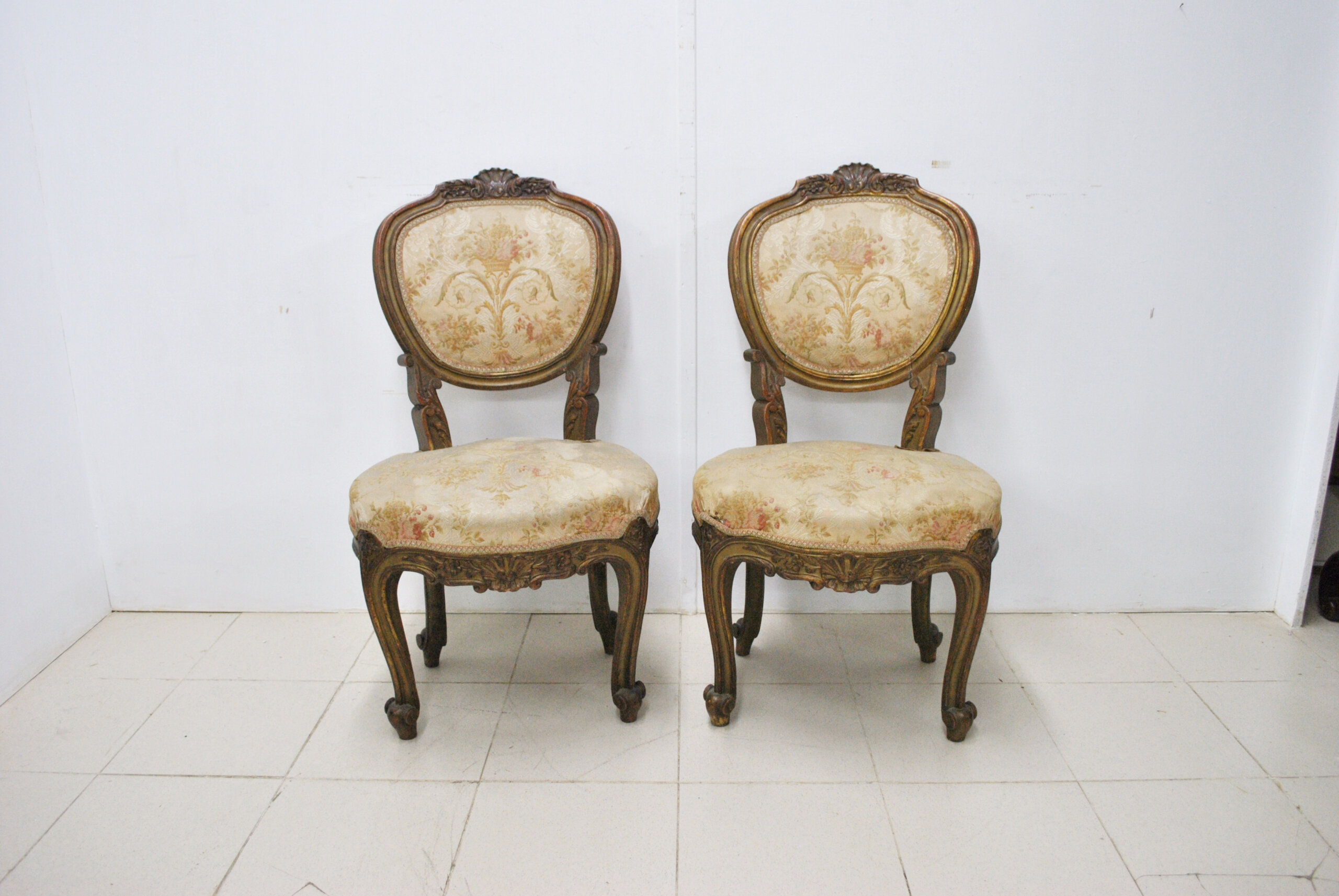 Ambas sillas conservan su tapizado original en tejido brocado con decoración floral en tonos dorados, rosados y beige, que aporta un aire cálido y señorial. Los respaldos ovalados y los asientos generosos ofrecen comodidad y presencia decorativa, ideales tanto para un salón clásico como para un dormitorio o rincón de lectura.