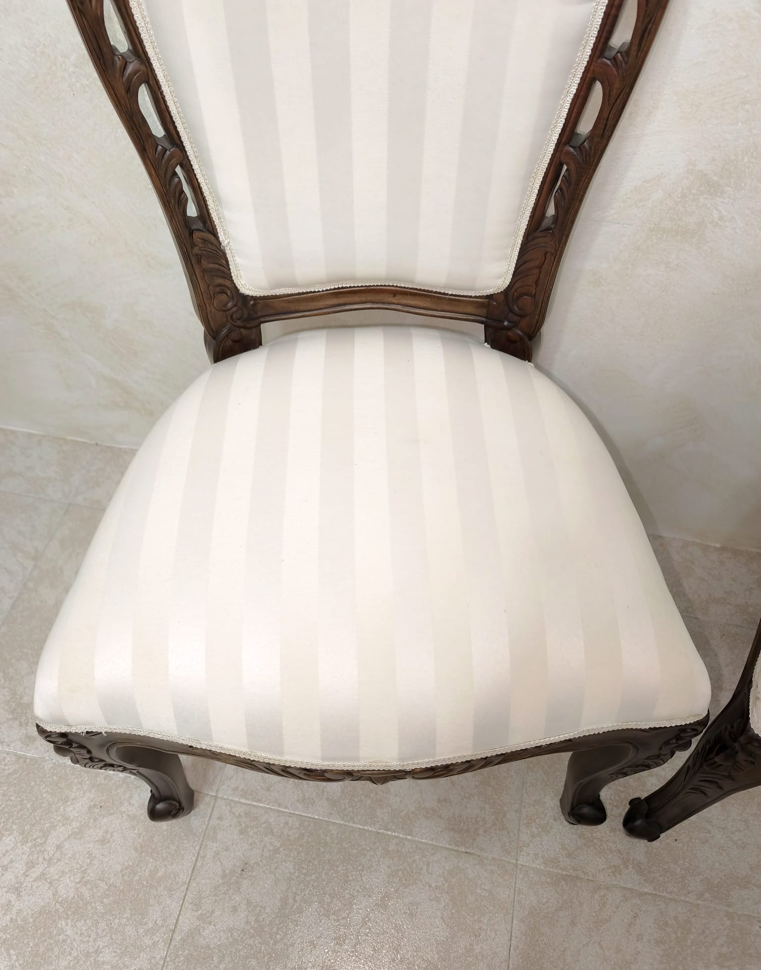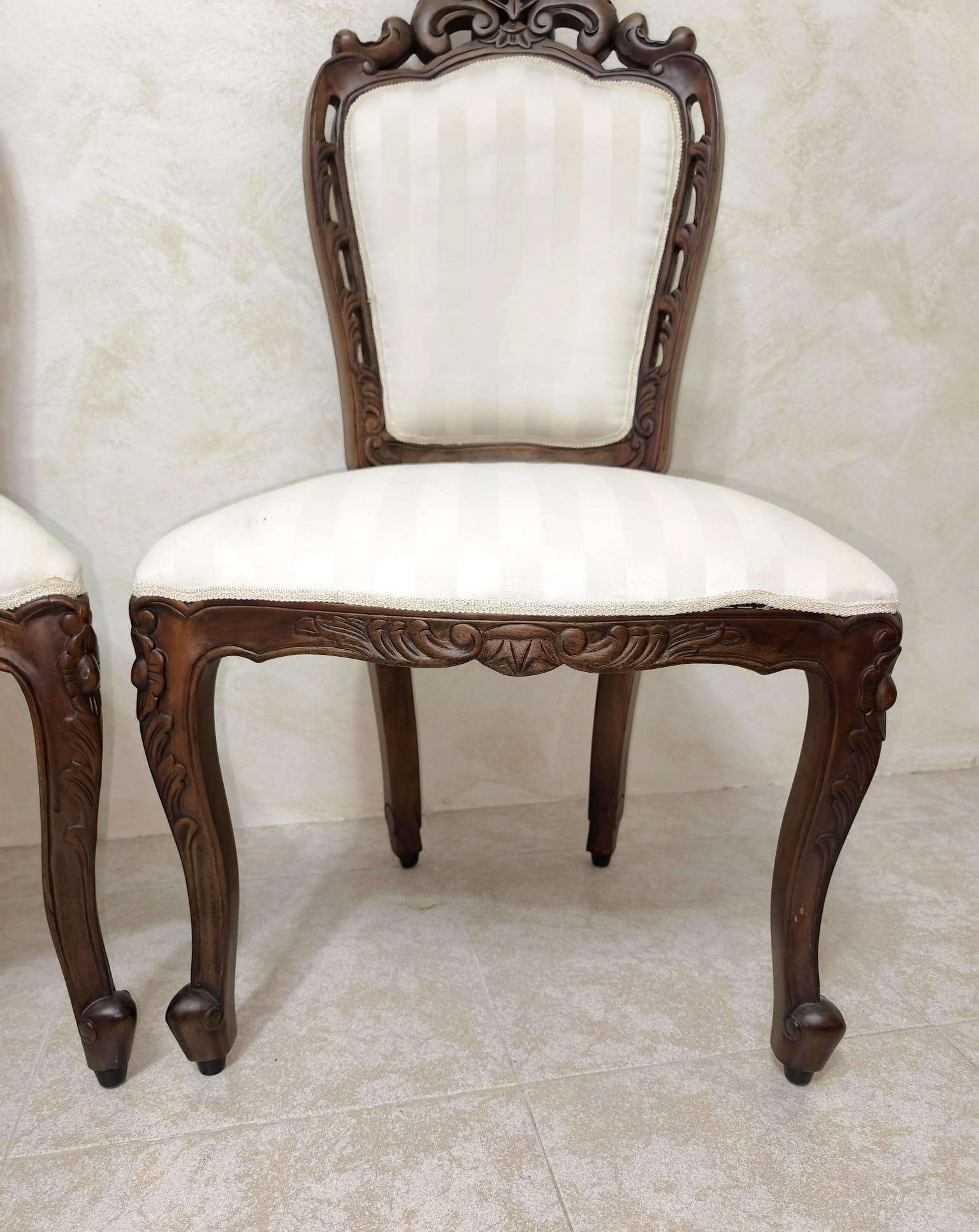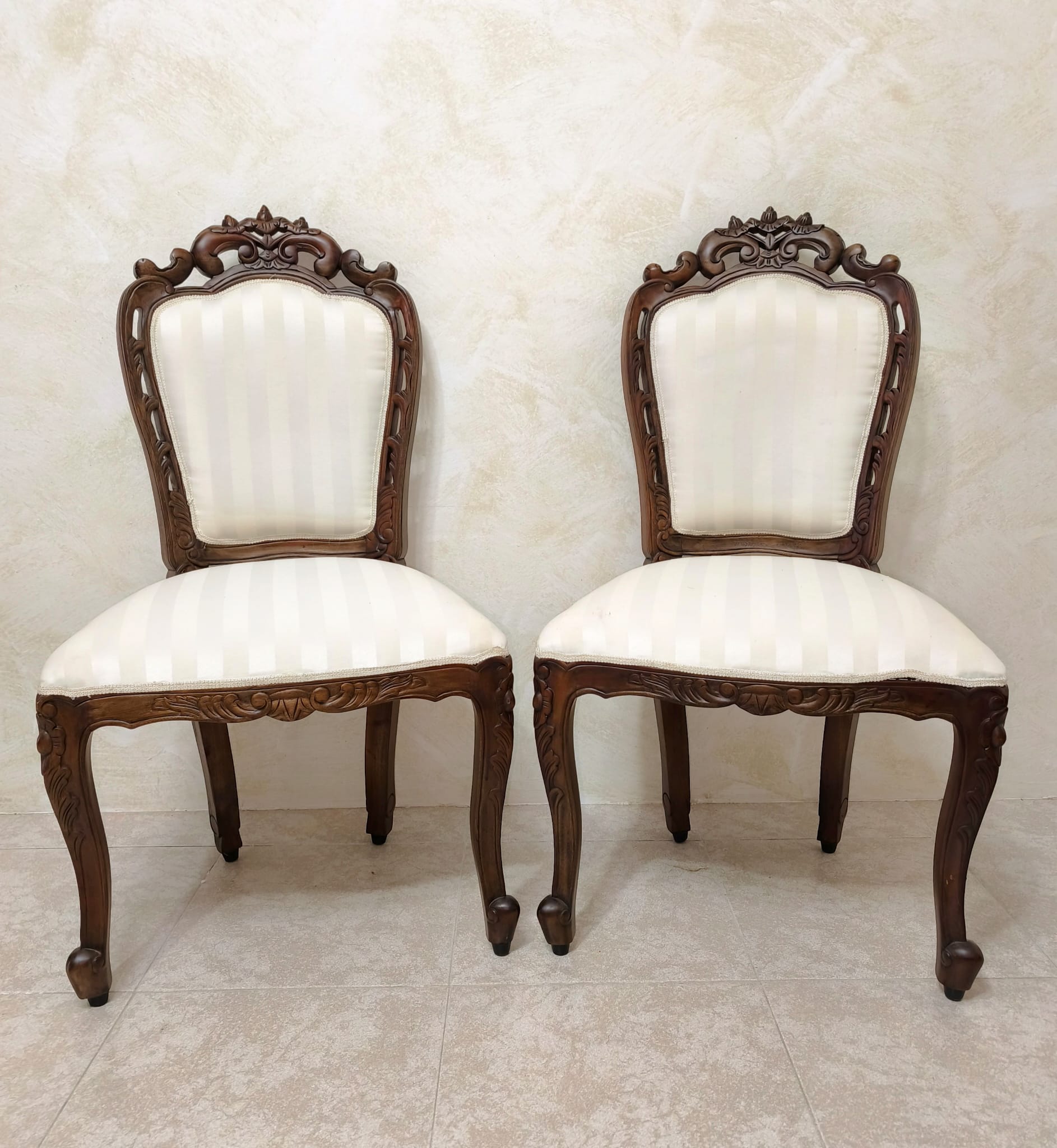 Elegante pareja de sillas Victorianas realizadas en madera tallada y tapicería de tela a rayas en blanco cremoso.